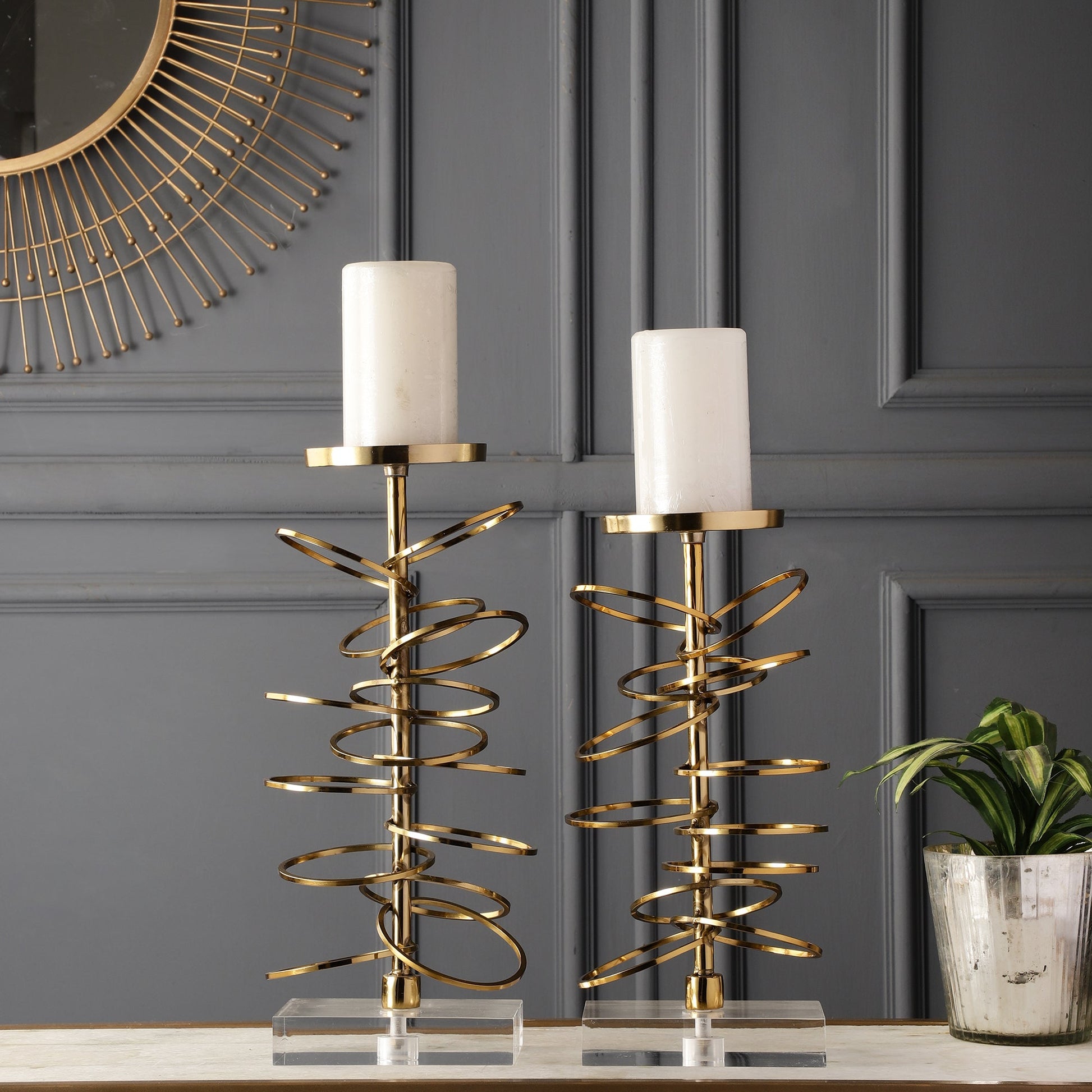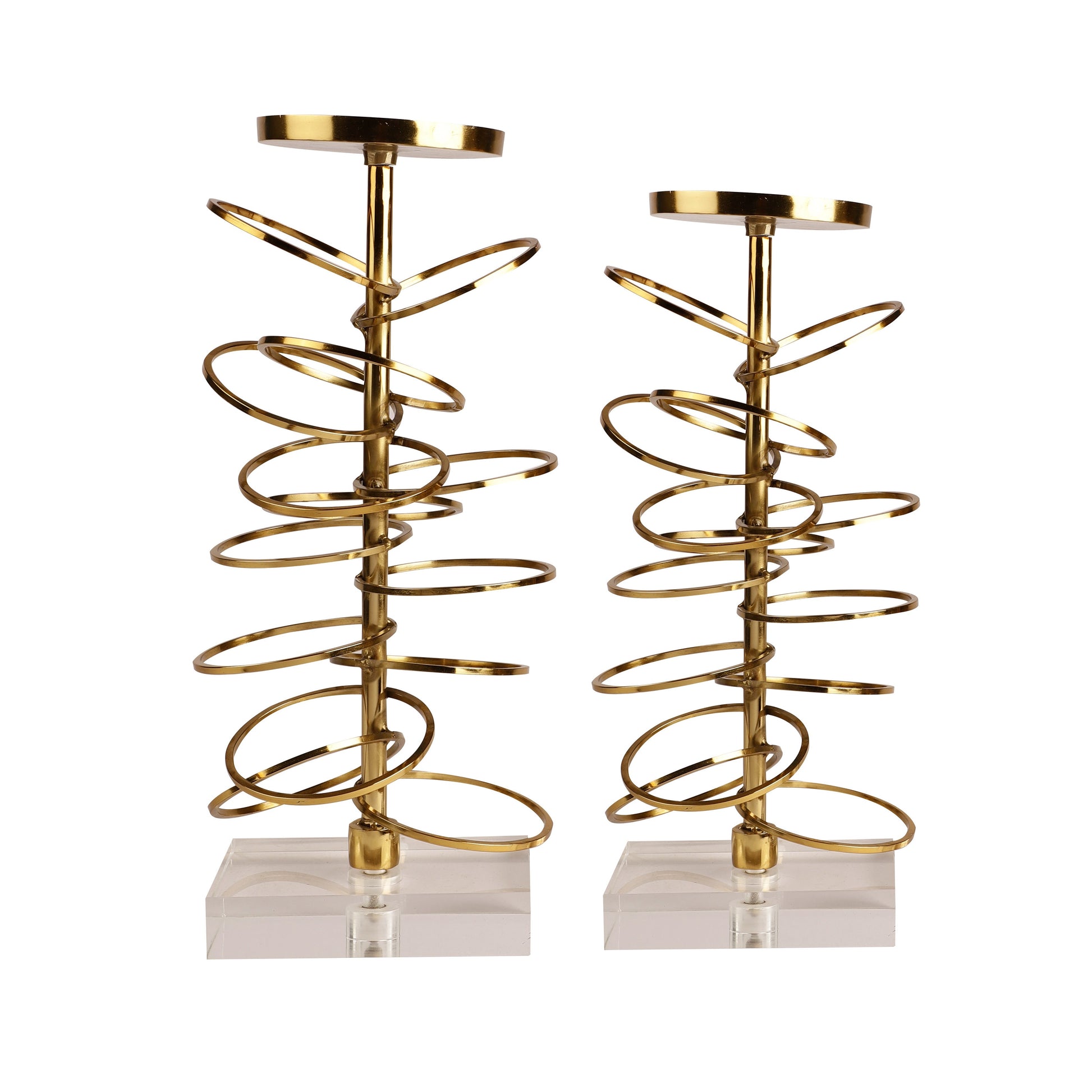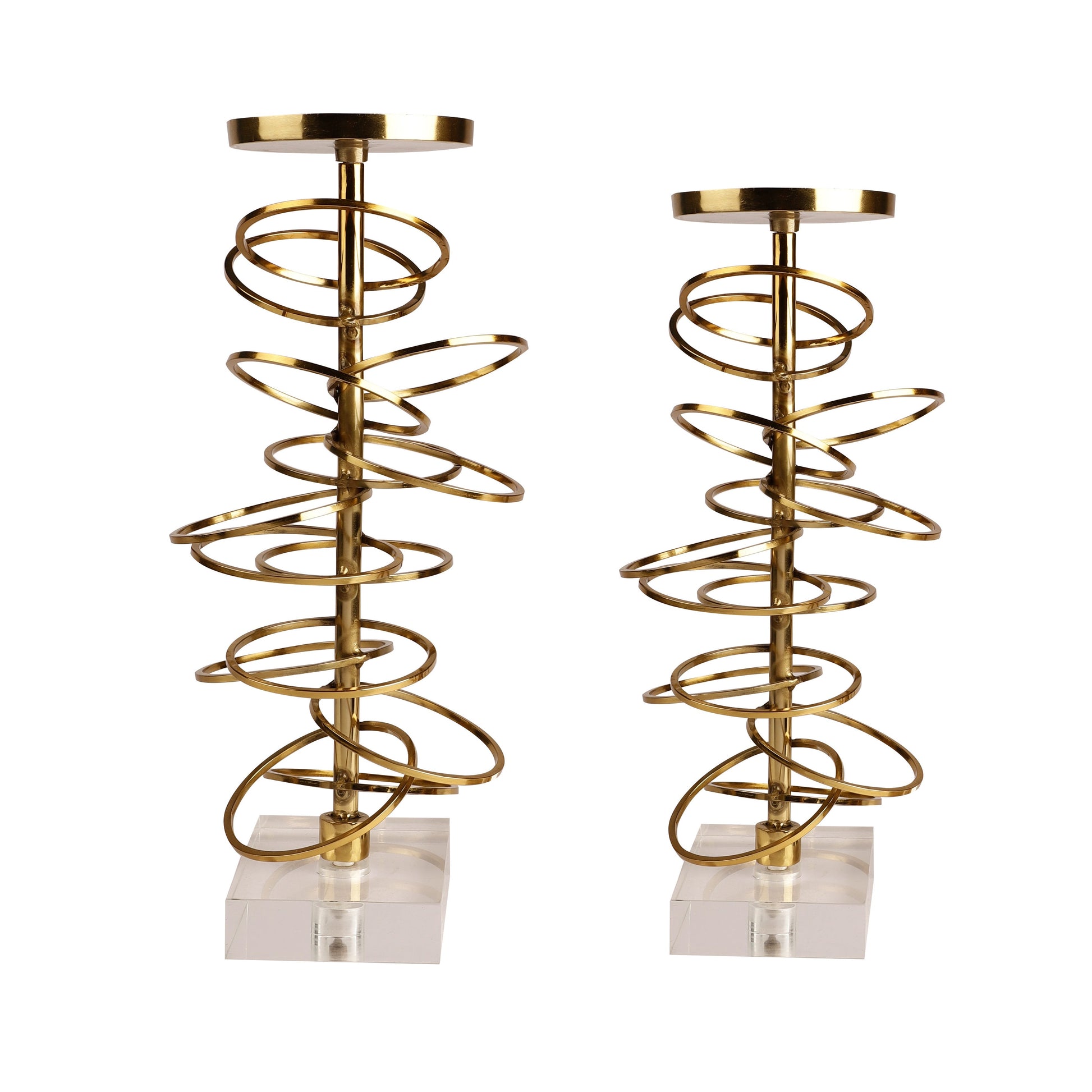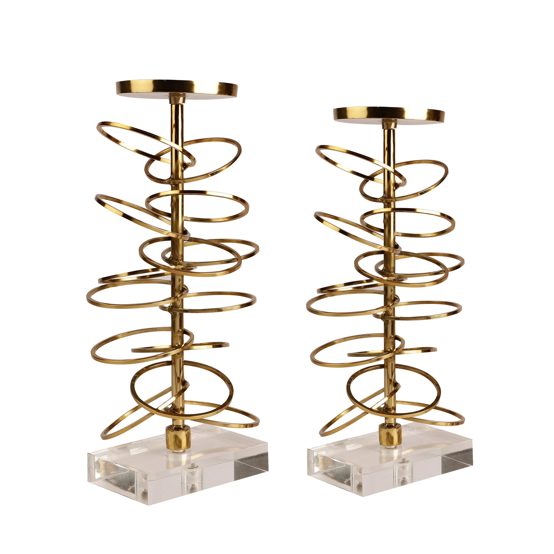 The clean lines of this gold candle holder set of 2 make it a beautiful addition for your living space. Its elegant designer lines, & the acrylic base adds class & luxury while keeping the flame glowing & protected from the wind. Works well with a pillar, & t-light candle.