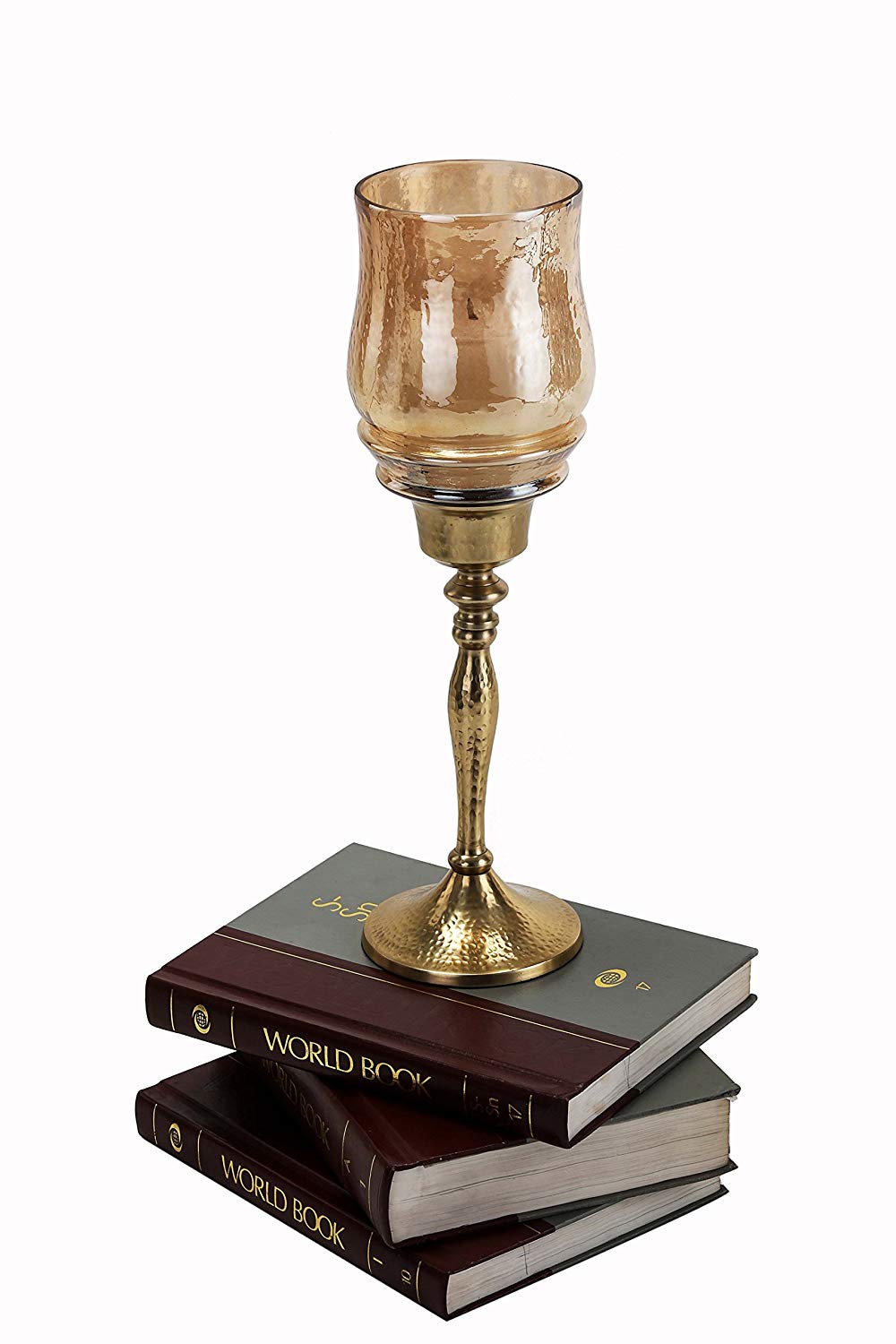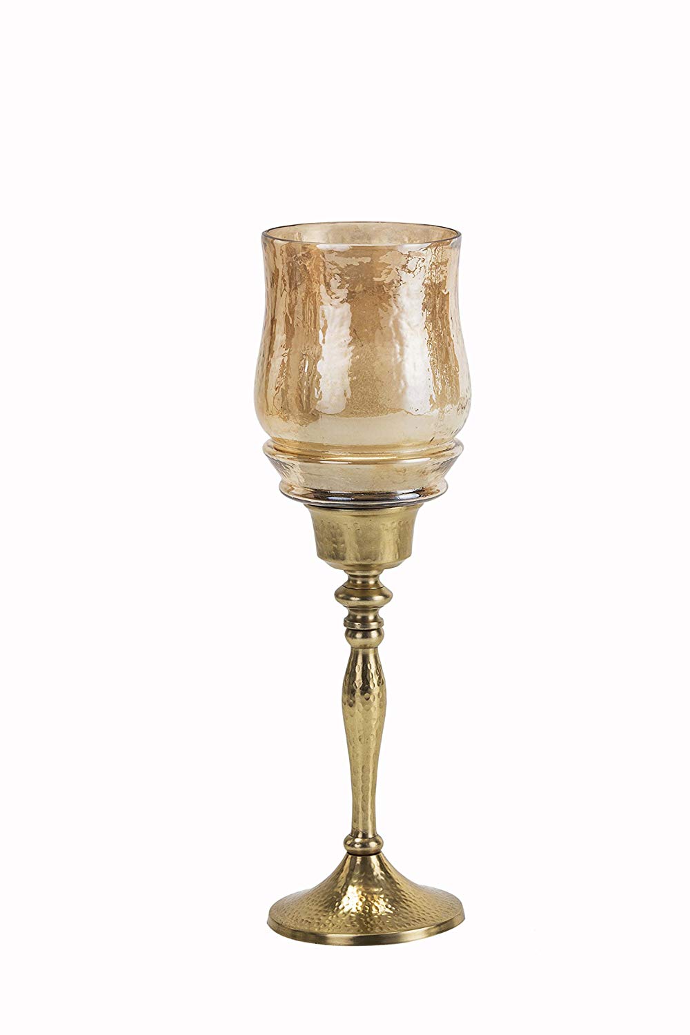 The curvy lines of this gold-hammered hurricane candle stand make it a beautiful addition for you living space. Its classic, luster hammered glass top & hammered aluminium base add class & luxury while keeping the flame glowing &protected from the wind. Works well with a pillar, & t-light candle.