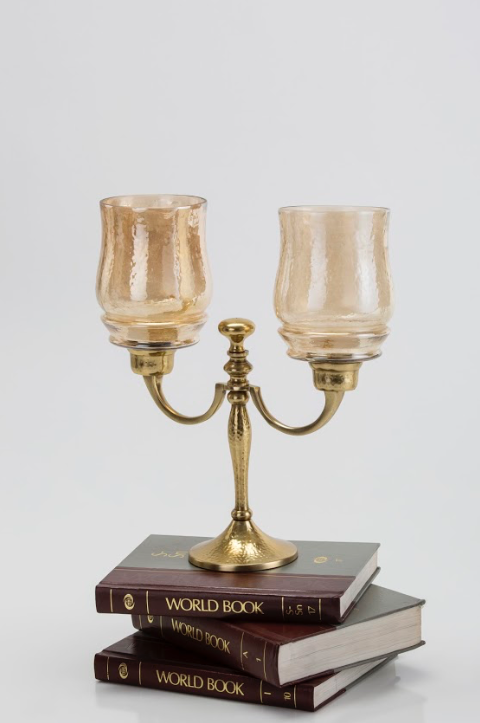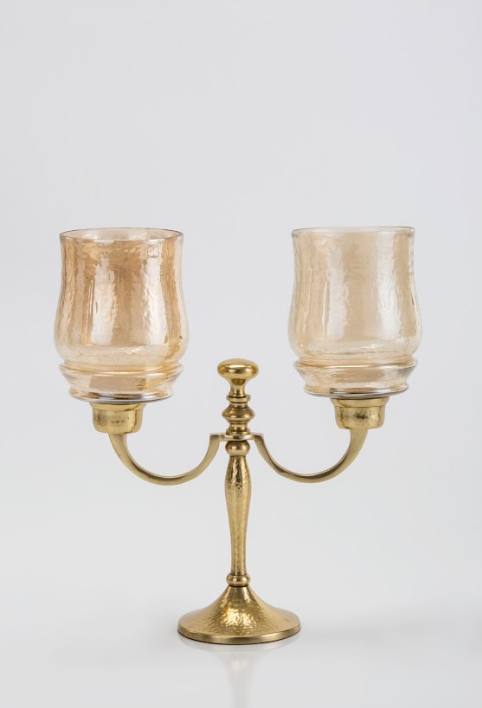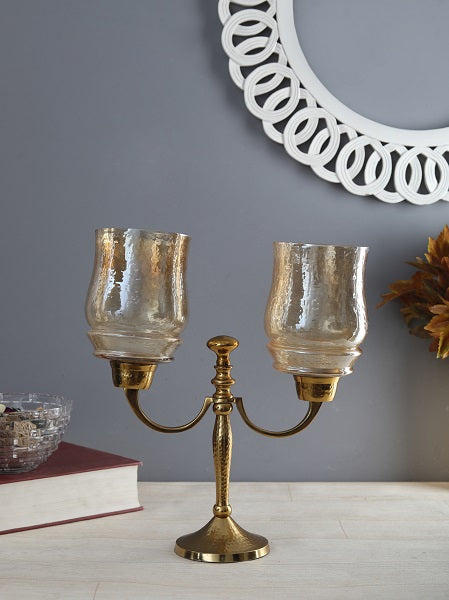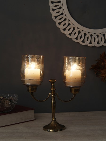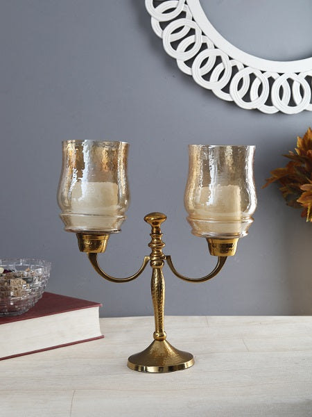 The curvy lines of this two lite gold-hammered hurricane candlestand make it a beautiful addition for you living space. Its classic, luster hammered glass top & hammered aluminium base add class & luxury while keeping the flame glowing & protected from the wind. Works well with a pillar & t-light candle.