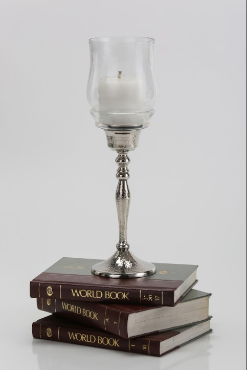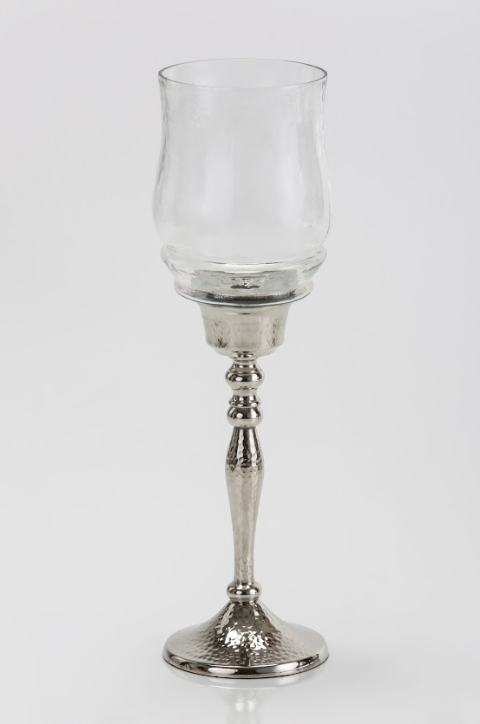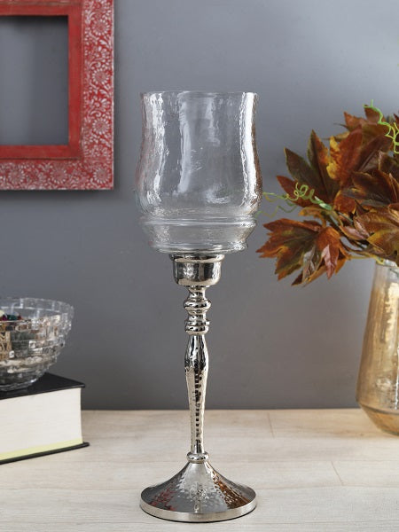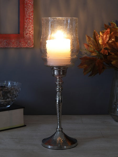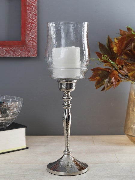 The curvy lines of this nickel-hammered hurricane candlestand make it a beautiful addition for you living space. Its classic, clear hammered glass top & hammered aluminium base add class & luxury while keeping the flame glowing & protected from the wind. Works well with a pillar & t-light candle.