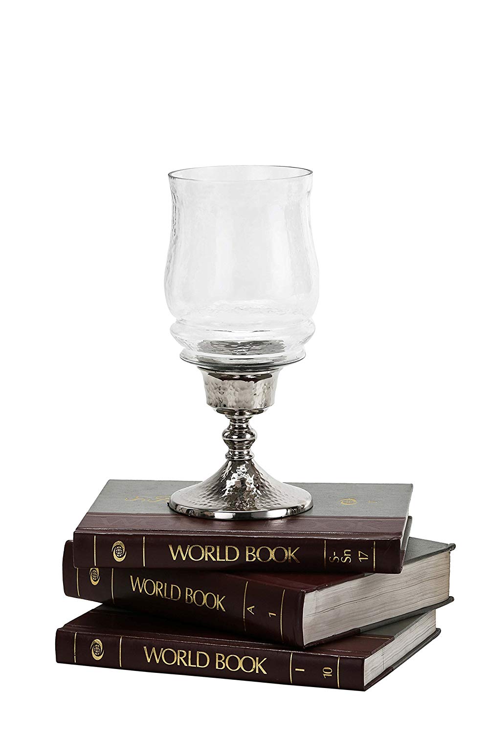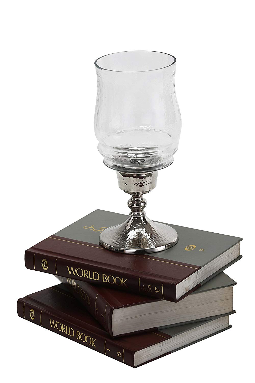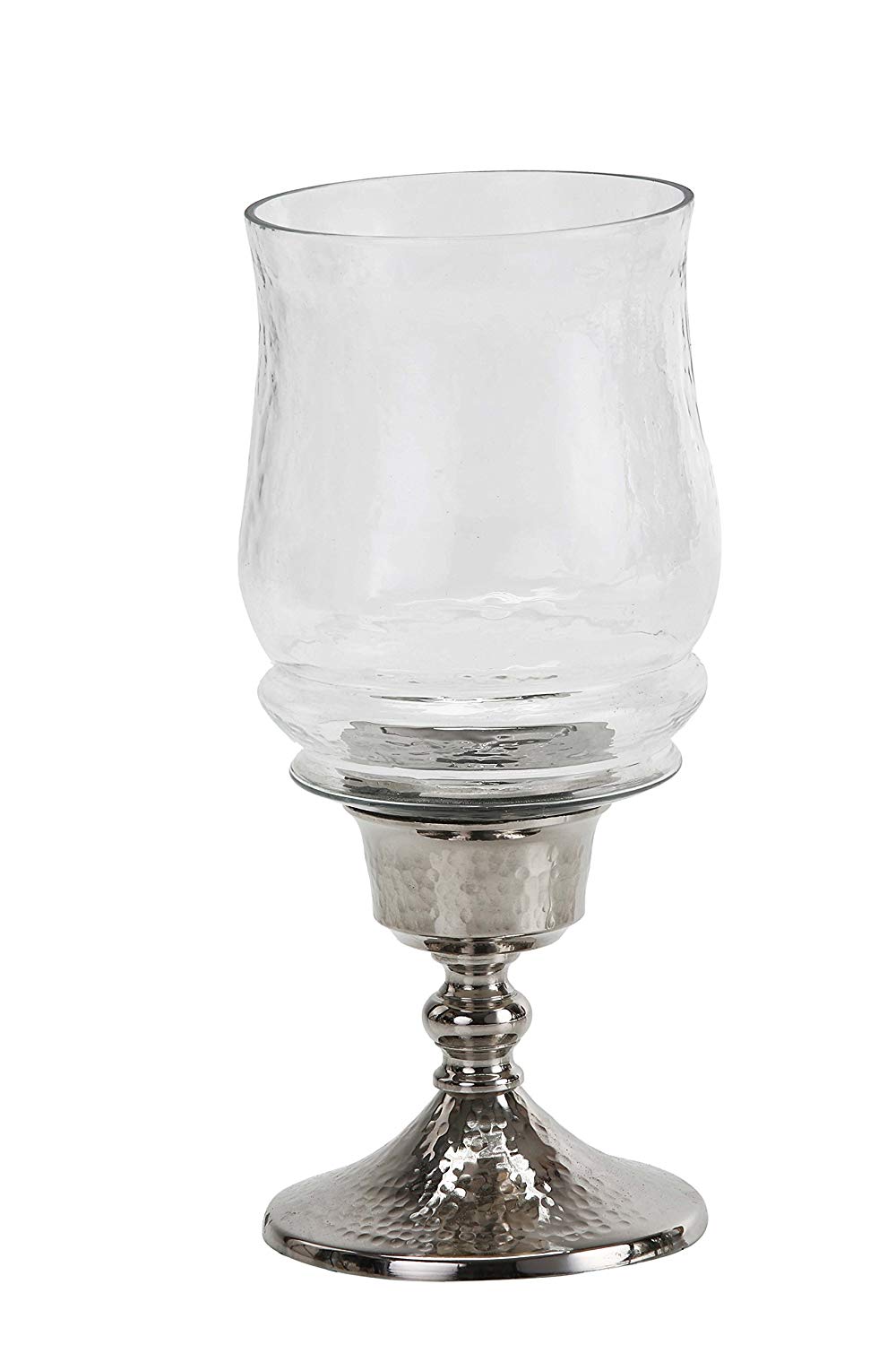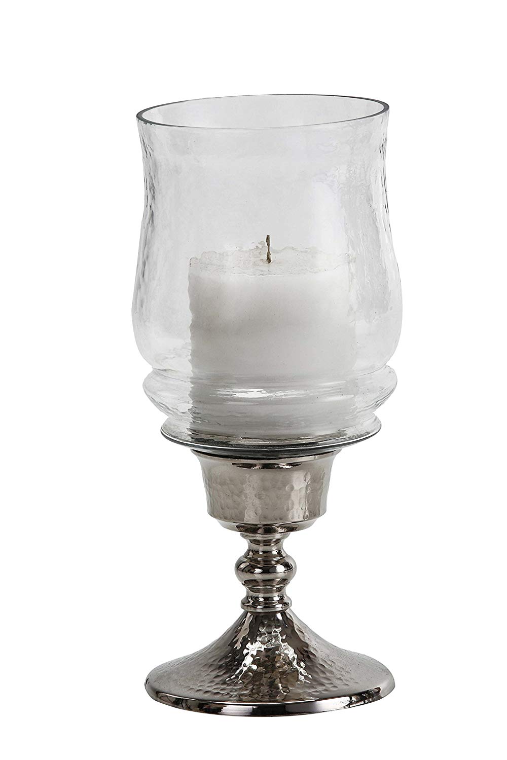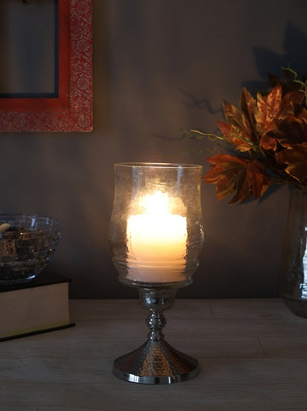 The curvy lines of this nickel-hammered hurricane candlestand make it a beautiful addition for you living space. Its classic, clear hammered glass top & hammered aluminium base add class & luxury while keeping the flame glowing & protected from the wind. Works well with a pillar & t-light candle.