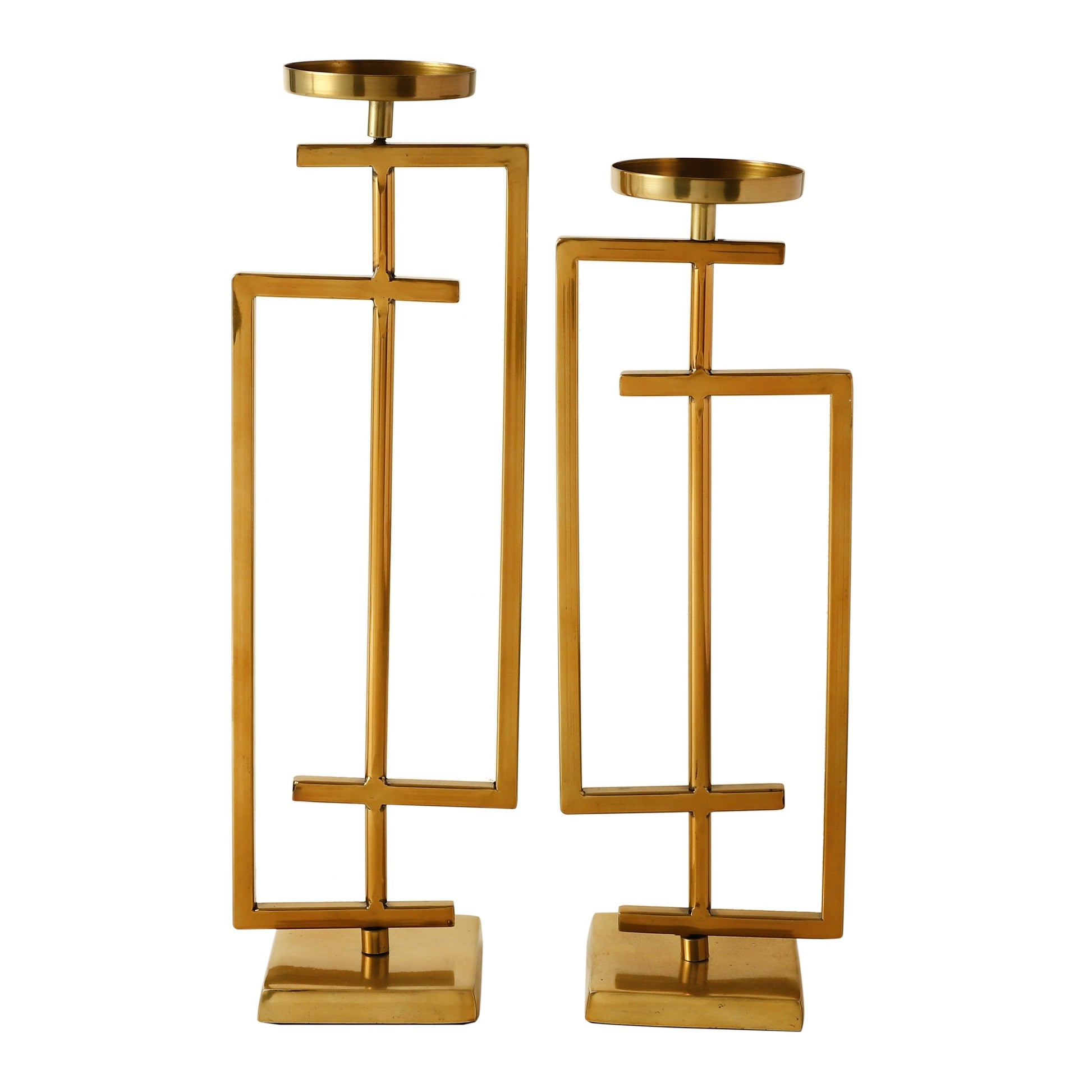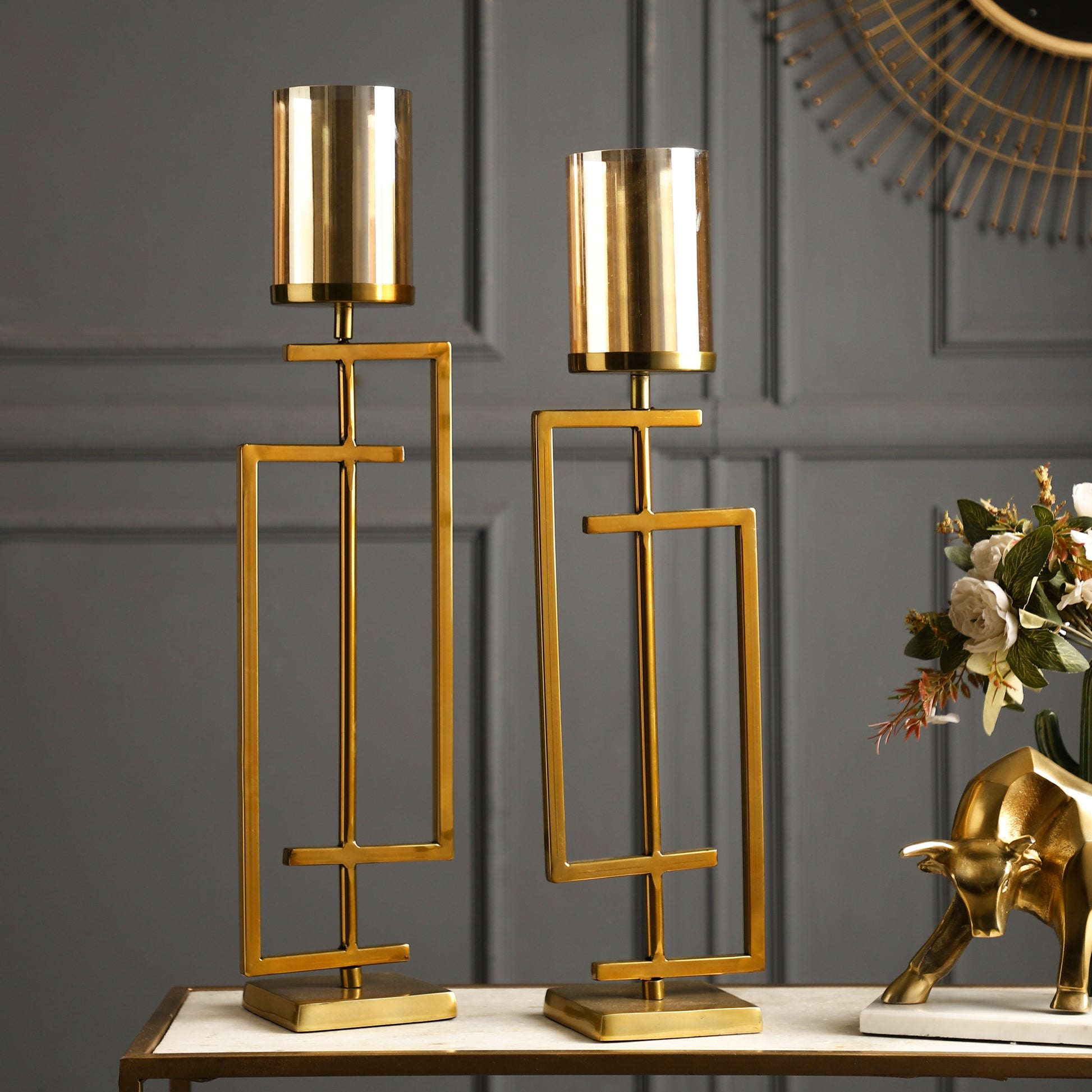 The curvy lines of this gold hurricane candle stand set of 2 make it a beautiful addition for your living space. Its classic, luster glass top & stainless steel base adds class & luxury while keeping the flame glowing & protected from the wind. Works well with a pillar, & t-light candle.