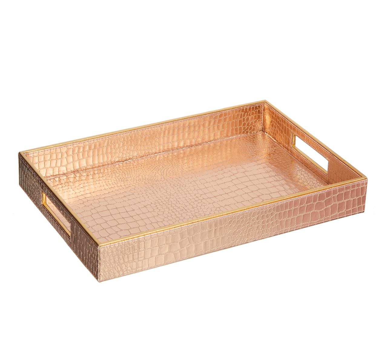 The clean & save lines of this dual finish patterned serving tray make it an elegant addition for any living space. It's dual - rose gold & gold finish lining make it an eclectic marriage of design and usability. The sturdy handles make it a great serving tray & works well to serve any items you may desire, or as a paper tray.