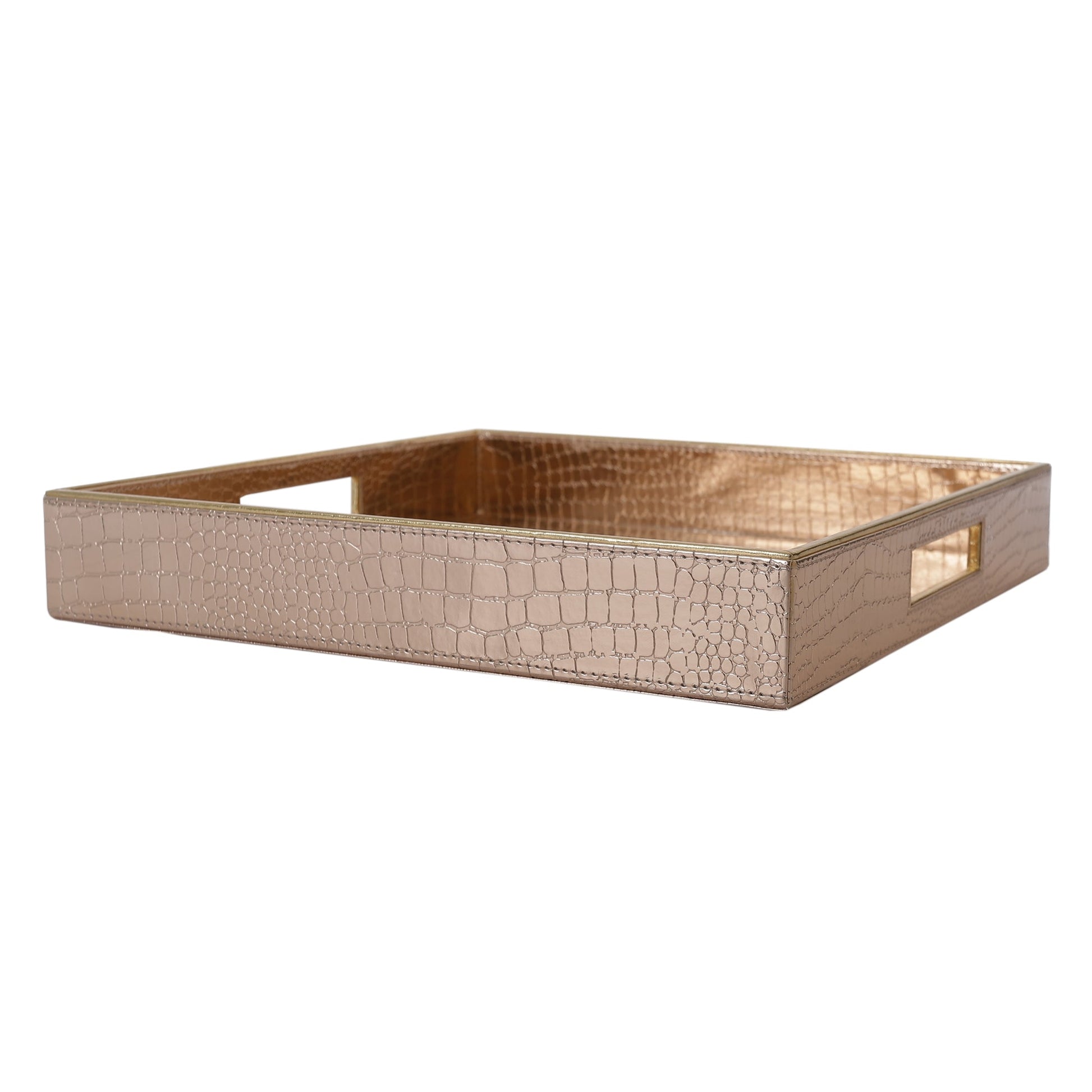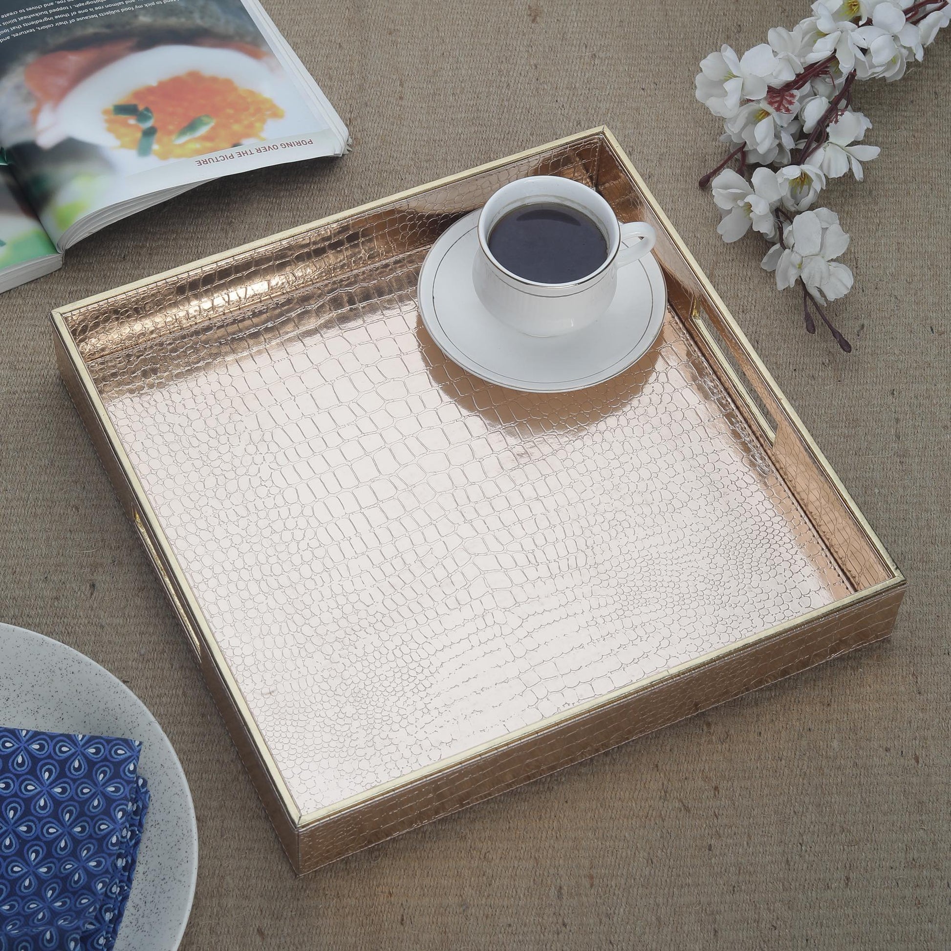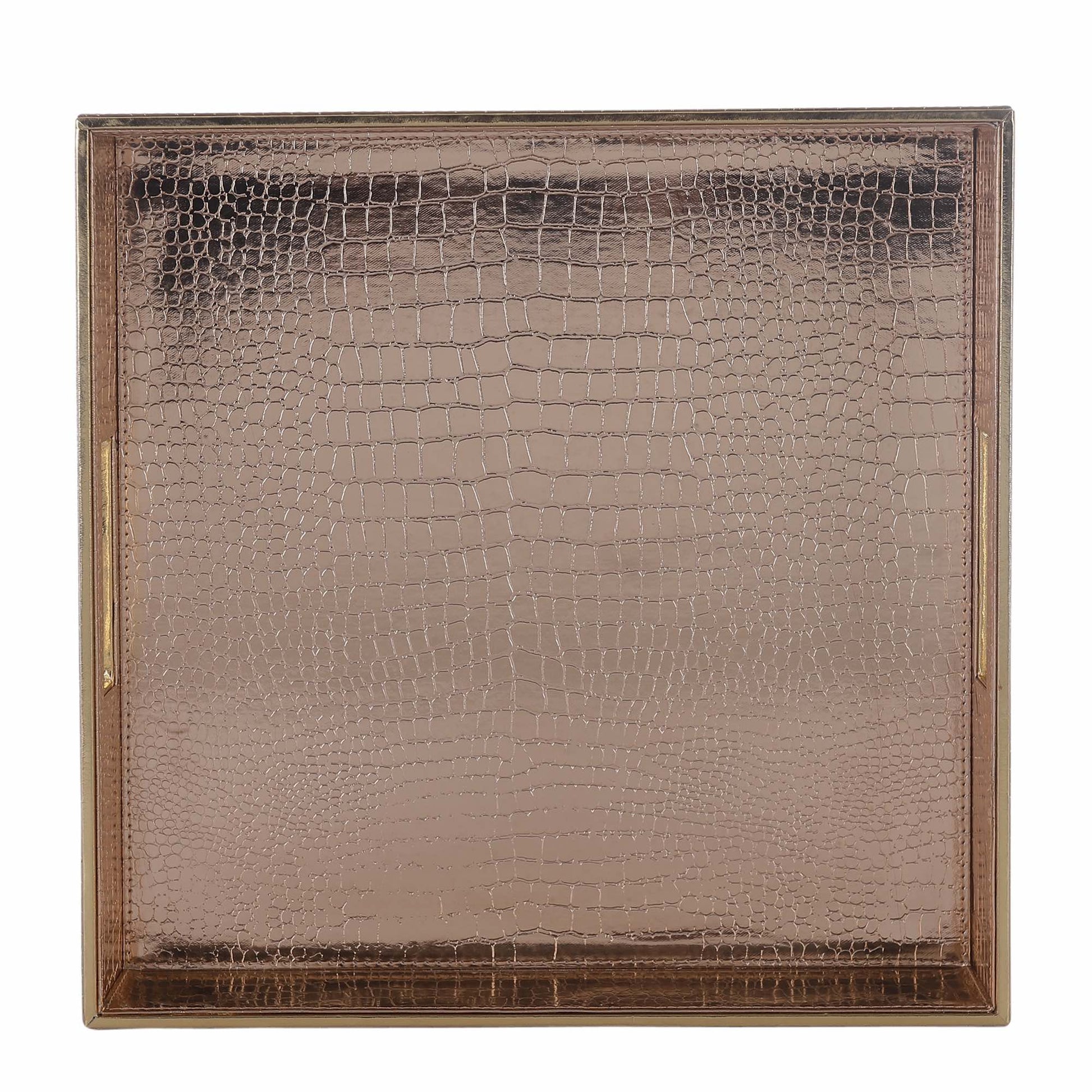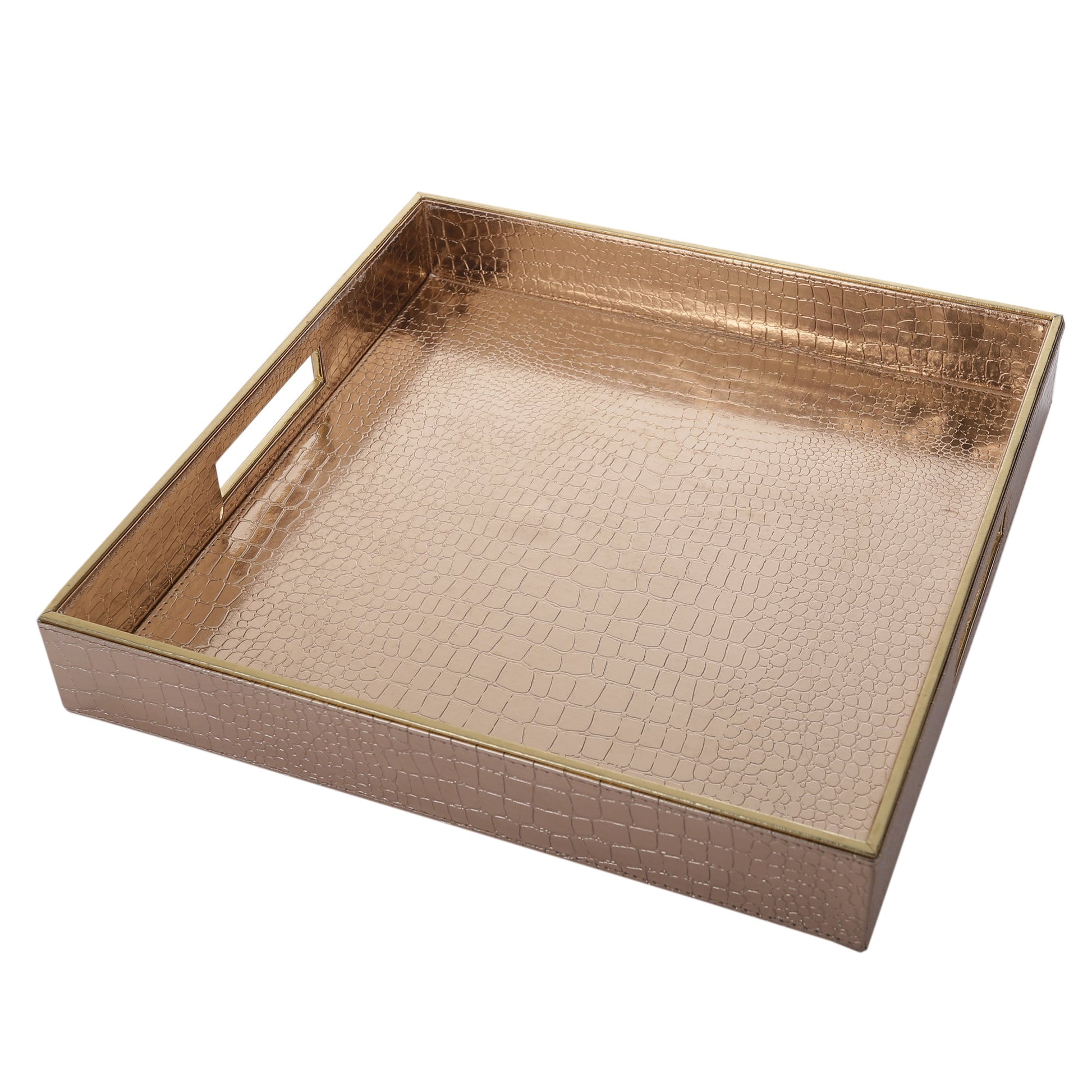 The clean & save lines of this dual finish patterned serving tray make it an elegant addition for any living space. It's dual - rose gold & gold finish lining make it an eclectic marriage of design and usability. The sturdy handles make it a great serving tray & works well to serve any items you may desire, or as a paper tray.