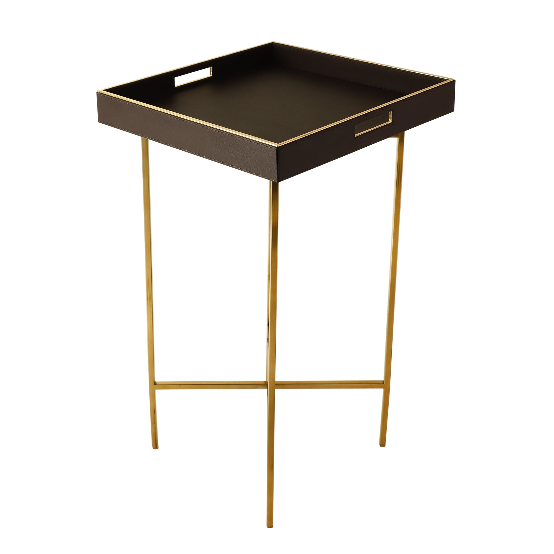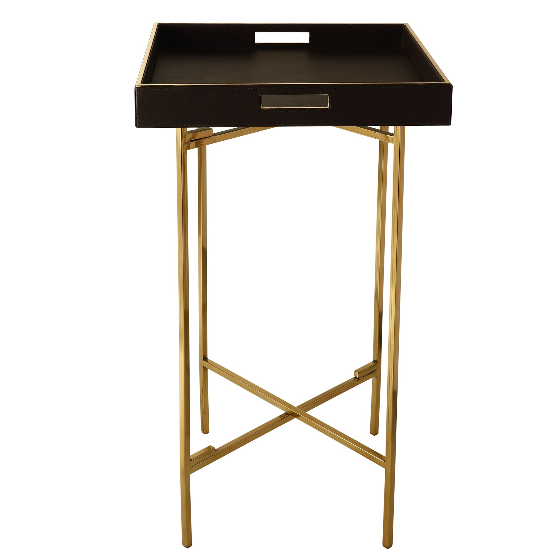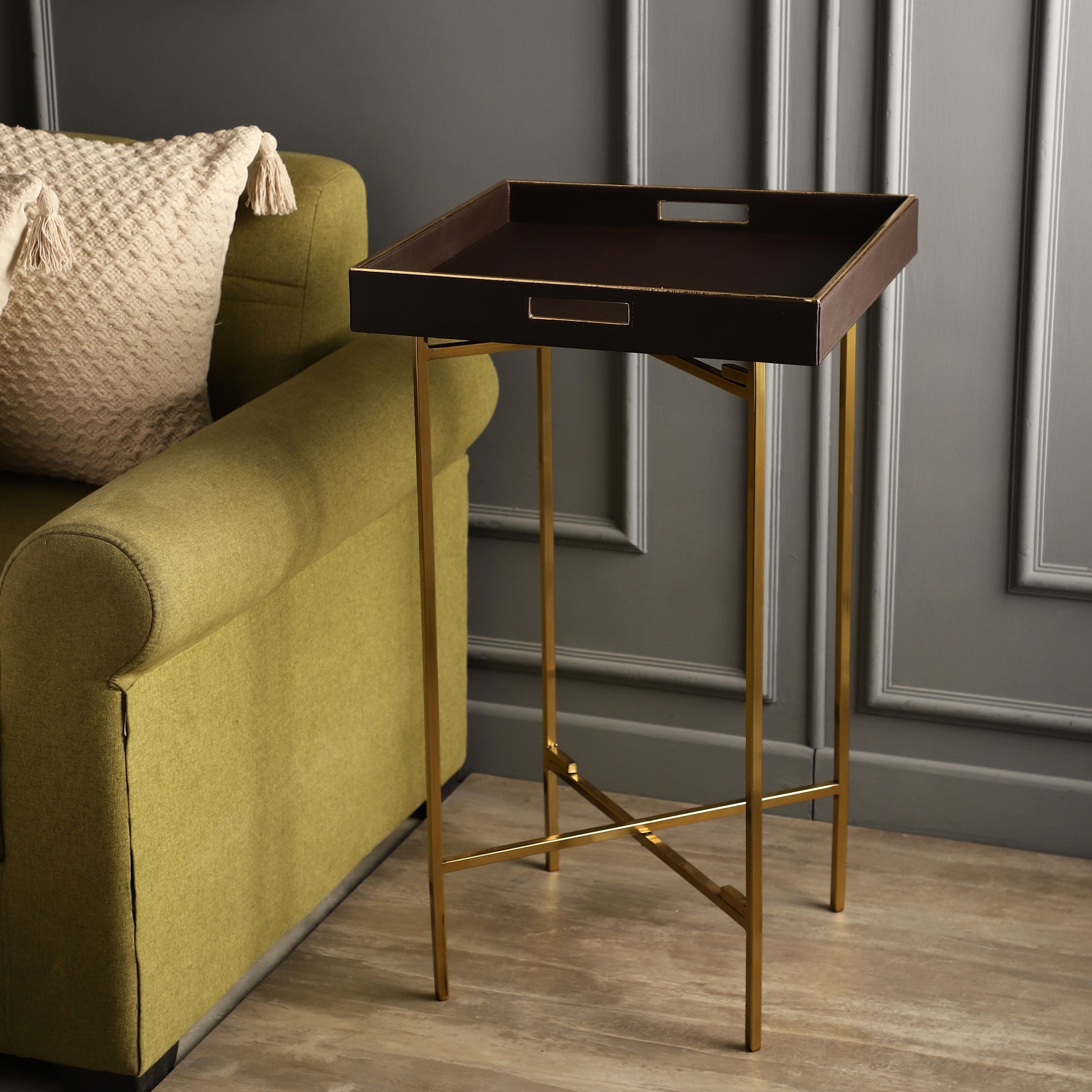 Be a trendsetter with our beautifully handcrafted 'Auckland Brown' Butler Tray Table. The artistic & luxurious lines of this Butler tray table will enhance the look & feel of any room. The dual tone PU Leather tray top is easily detachable, offering versatility& convenience. Use in a corner to display treasures or the detachable tray can be used by itself. The steel table base is foldable & can easily be stored.
