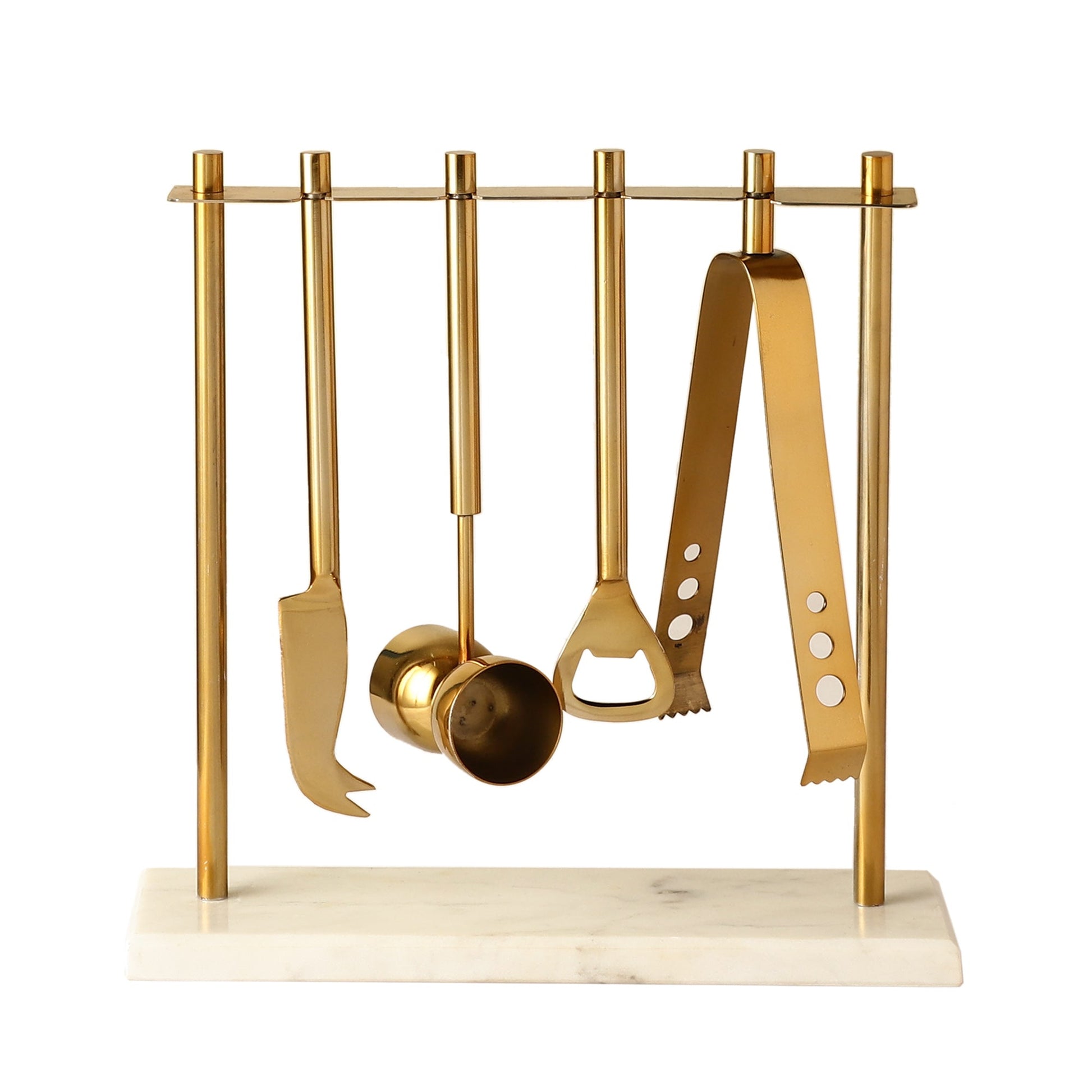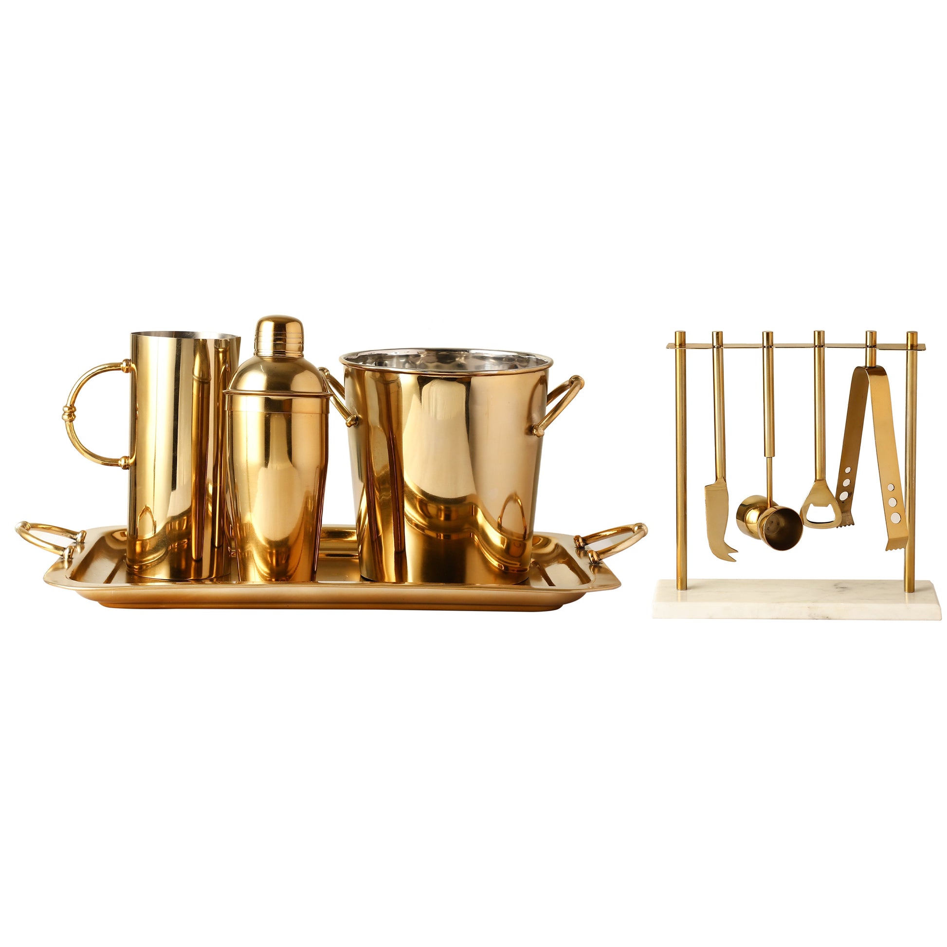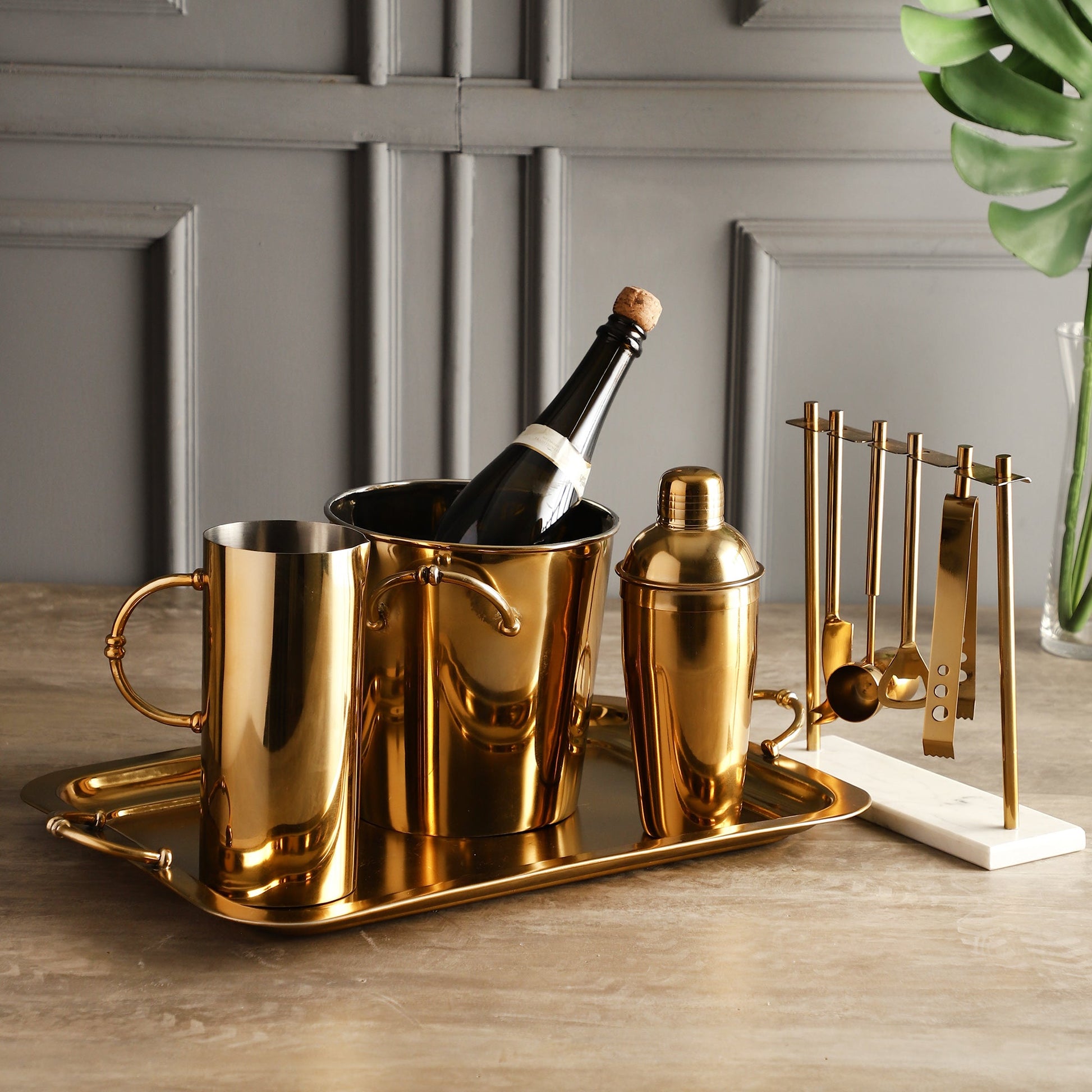 Add character & style to your living space with this elegant & stylish Bar Set. Both sleek and functional, this textured bar set contains a classic Manhattan style cocktail shaker, wine bucket, water jug serving tray & a bar tool kit, all with a mirrored, gold finish.