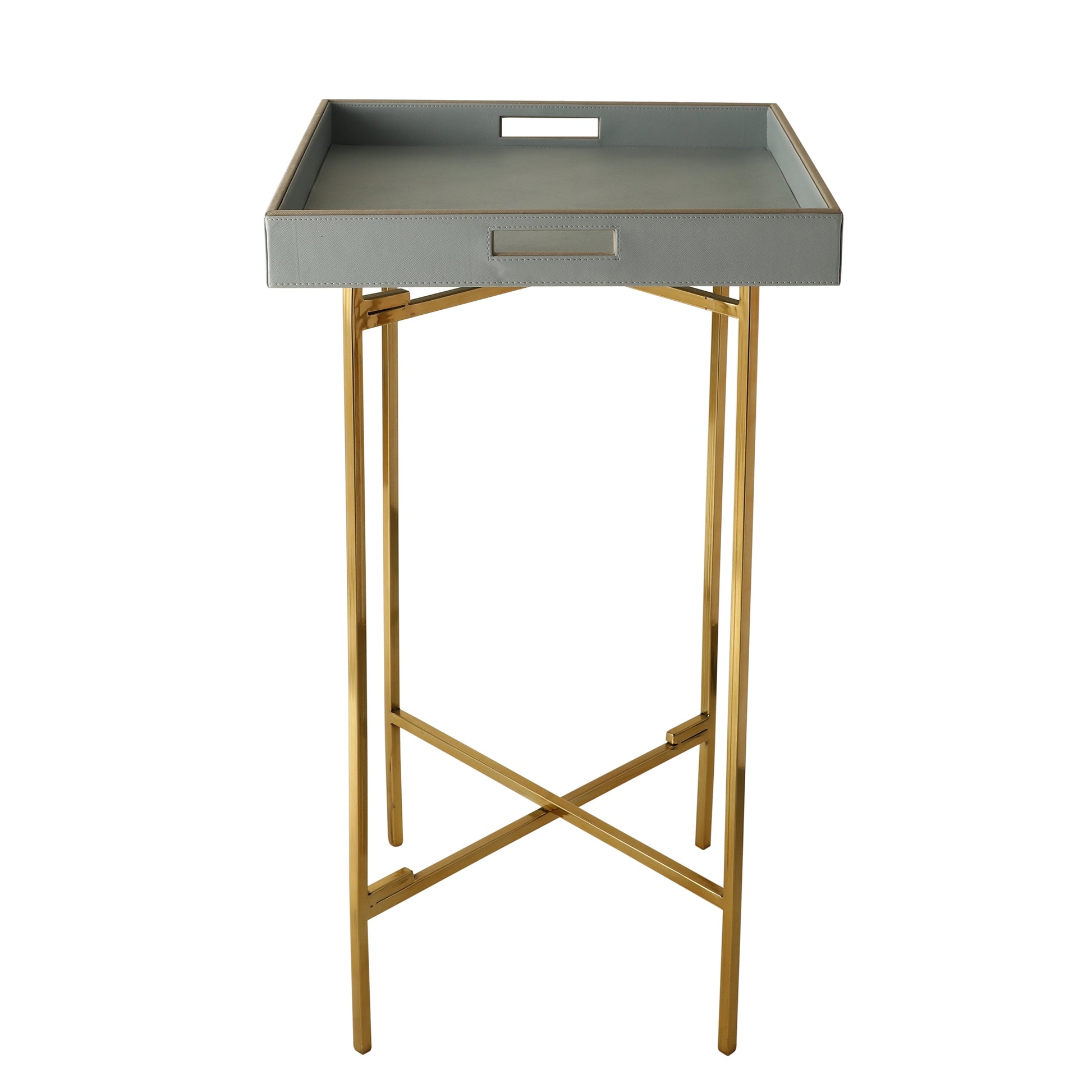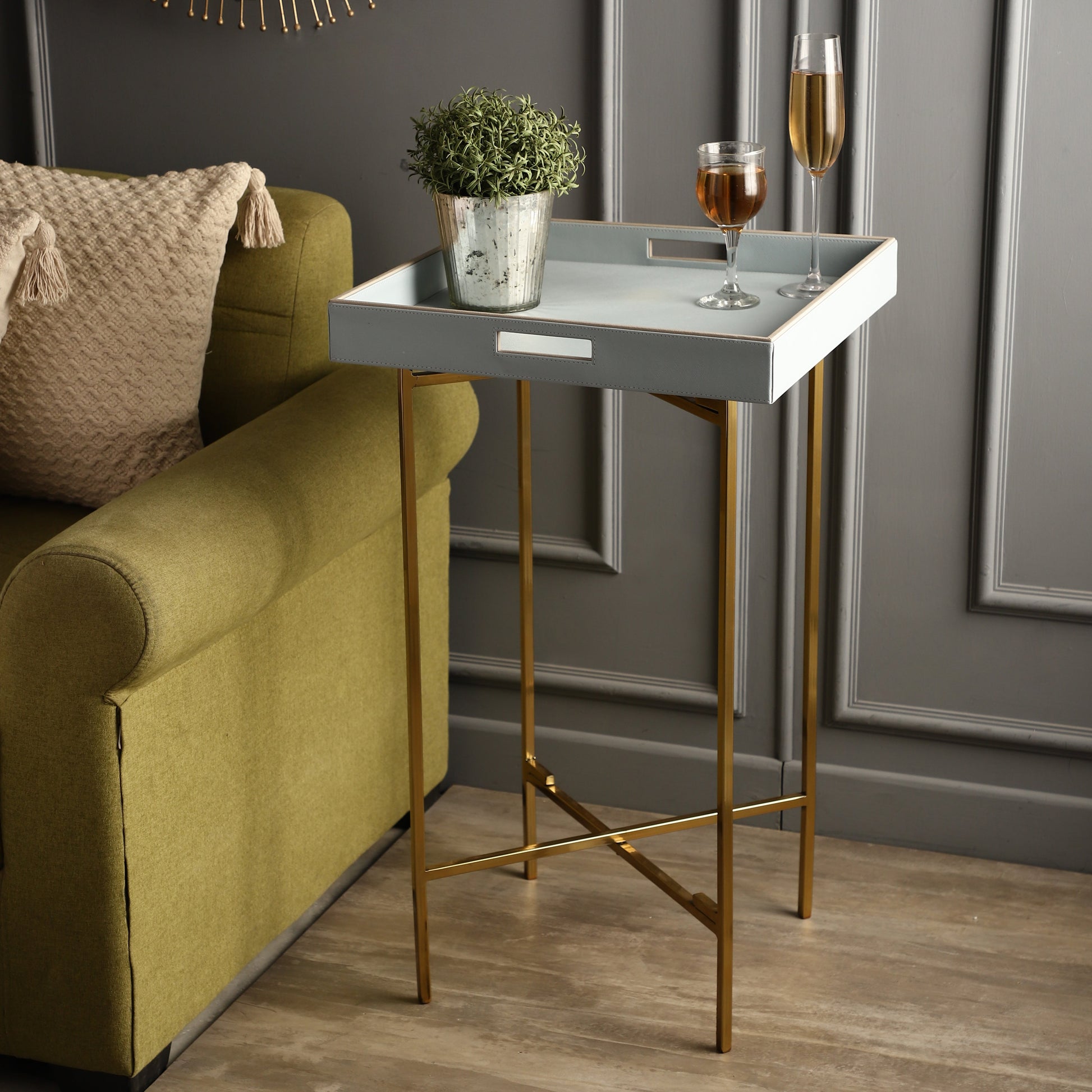 Be a trendsetter with our beautifully handcrafted 'Azure Ice Blue' Butler Tray Table. The artistic & luxurious lines of this Butler tray table will enhance the look & feel of any room. The dual tone PU Leather tray top is easily detachable, offering versatility& convenience. Use in a corner to display treasures or the detachable tray can be used by itself. The steel table base is foldable & can easily be stored.