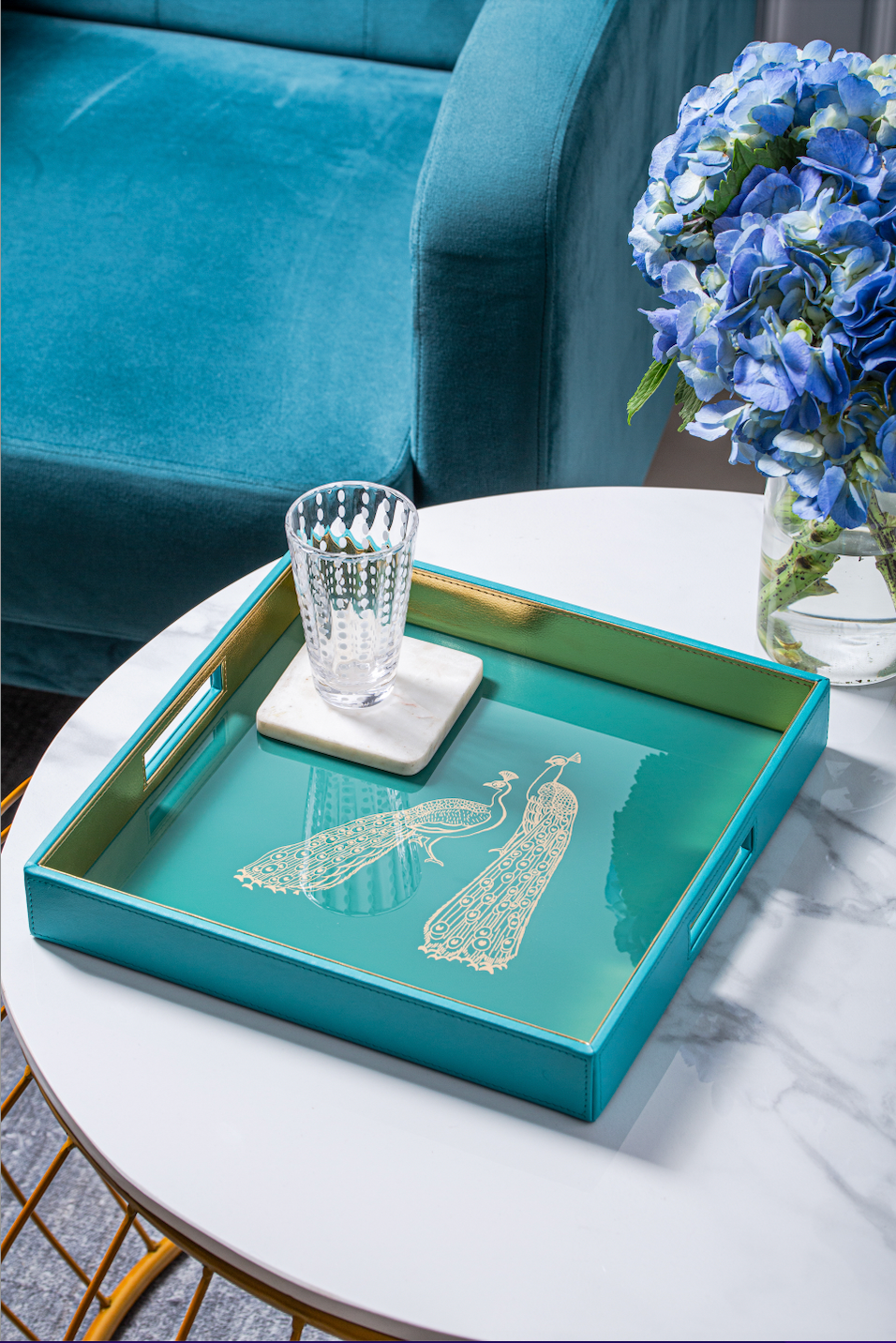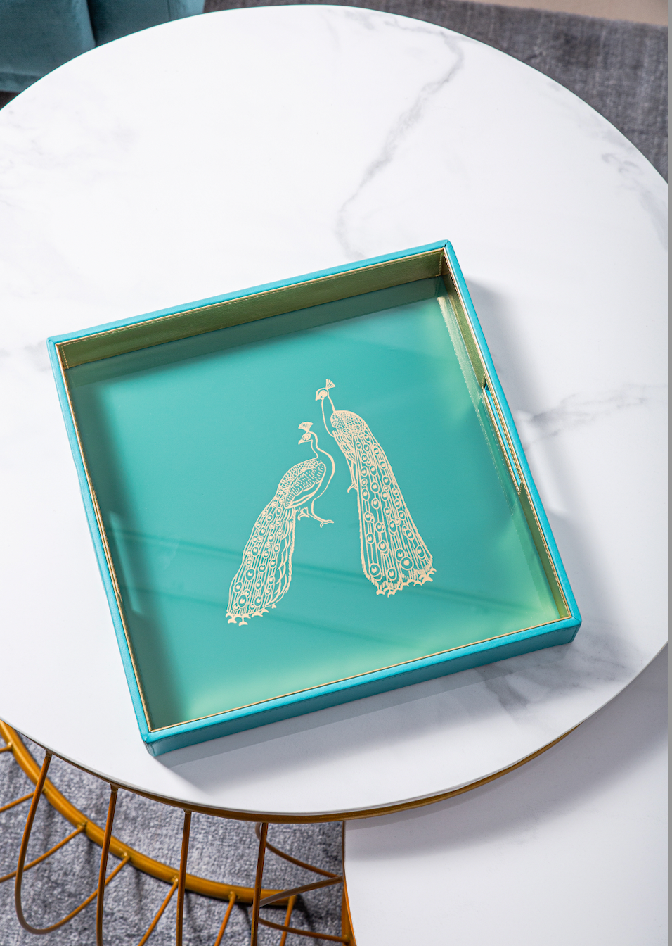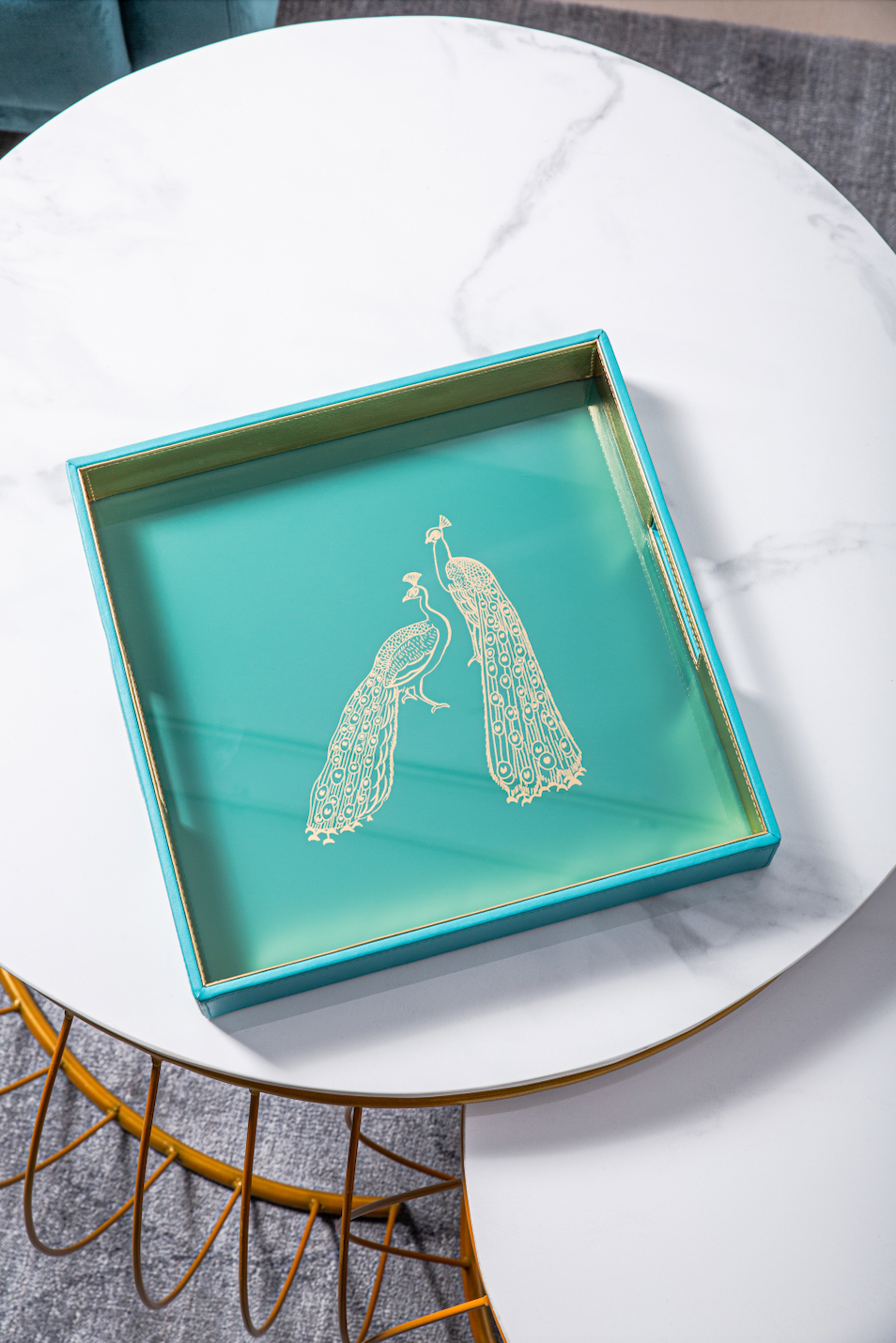 The artistic & eye-catching design of this stunning piece make it a truly ornate addition for any living space. It's delicate handcrafted Gold Peacock pattern on glass really make it stand out. Works well as a serving tray or as an accent piece.