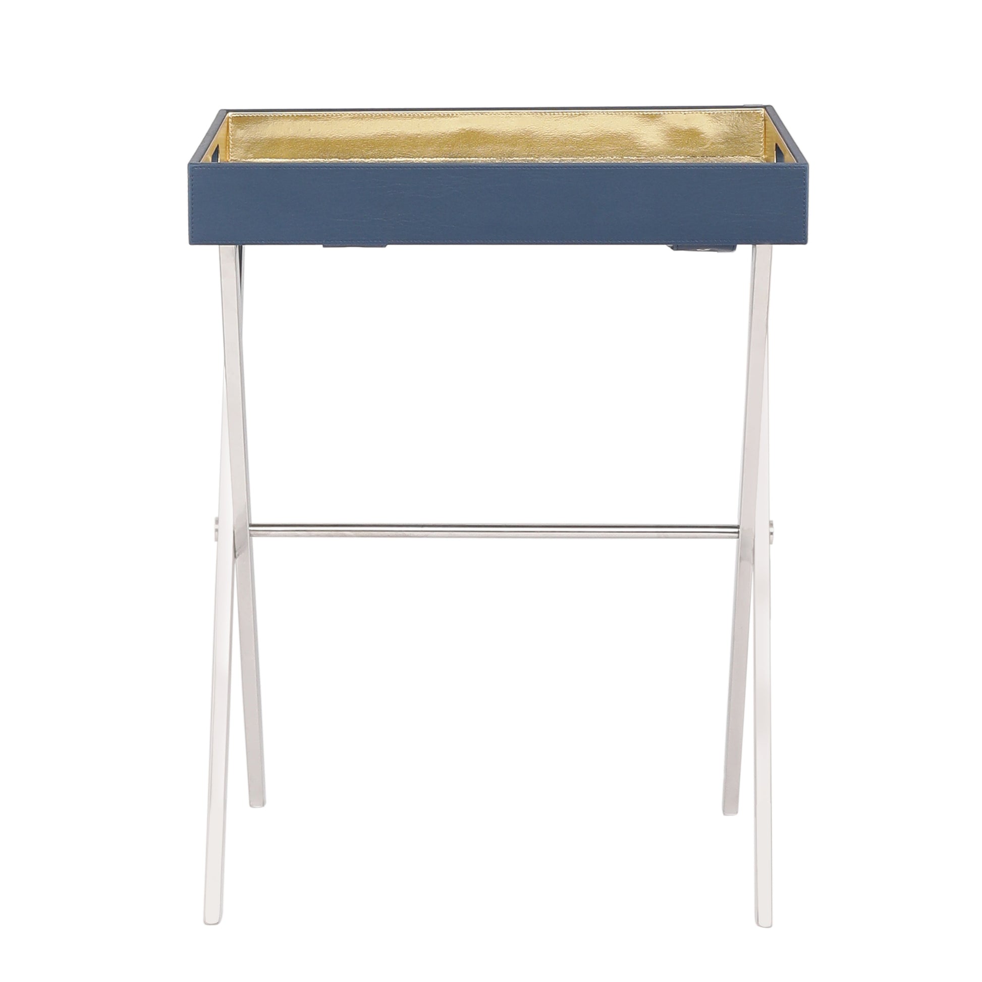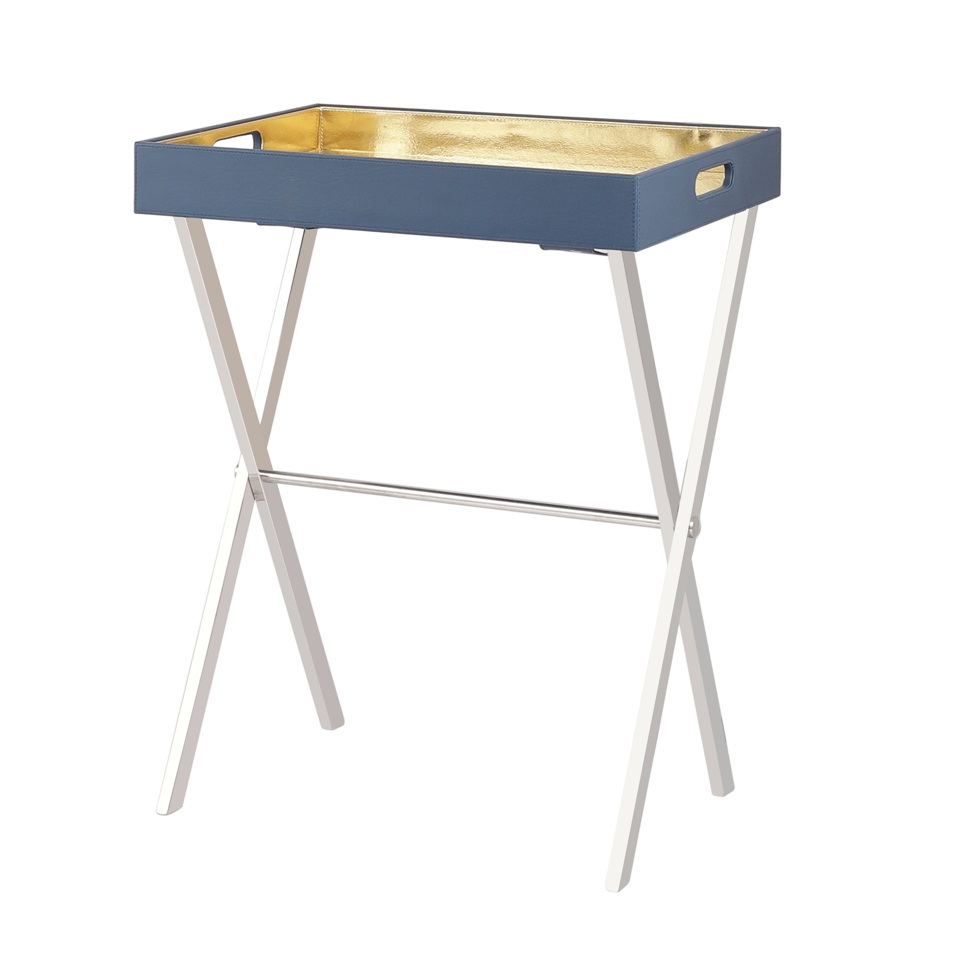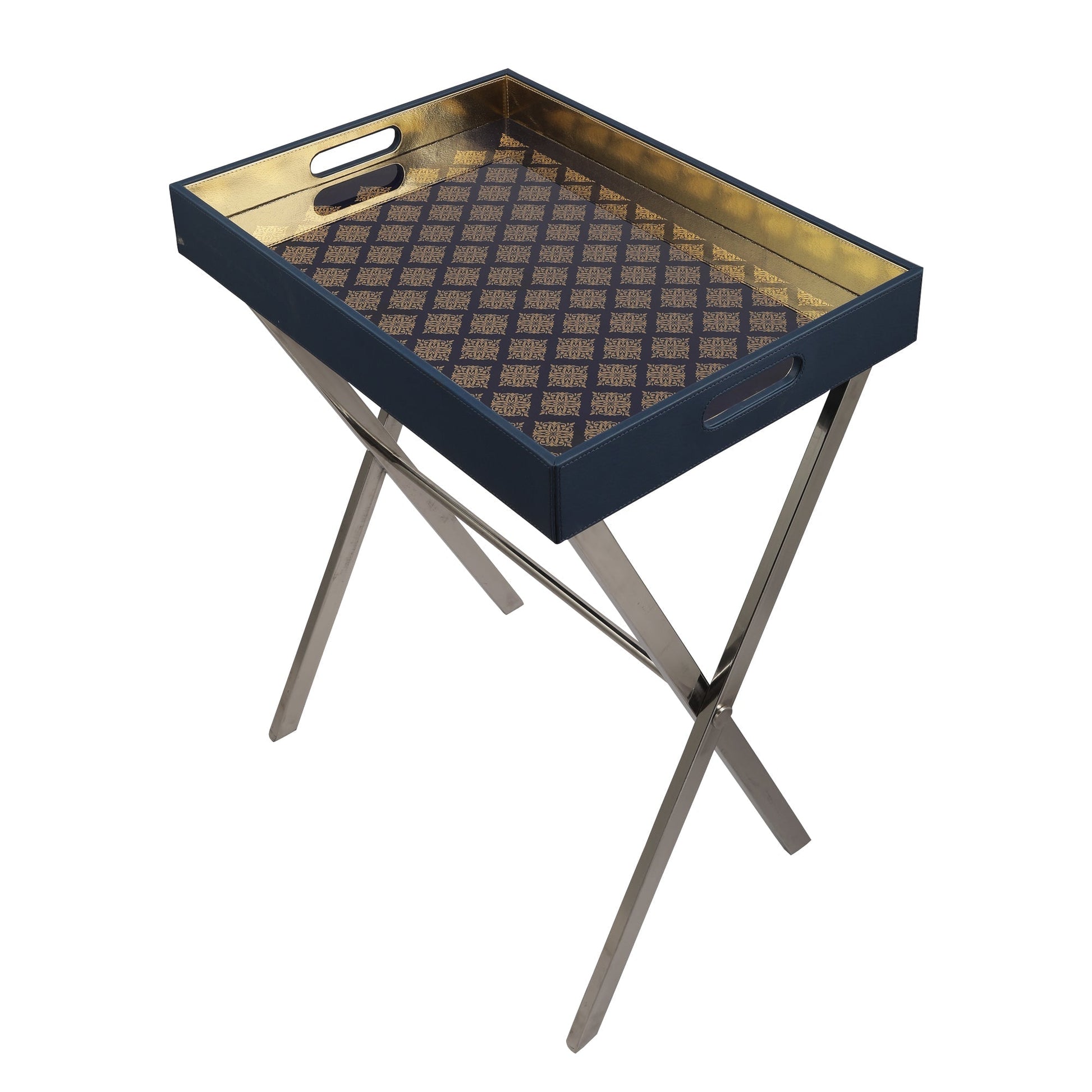 Be a trendsetter with our beautifully handcrafted 'Bikaner' Royal Blue & Gold Butler Tray Table. The vintage & luxurious lines of this Butler tray table will enhance the look & feel of any room. The PU Leather & Glass Printed tray top is easily detachable, offering versatility& convenience. Use in a corner to display treasures or the detachable tray can be used by itself. The steel table base is foldable & can easily be stored.