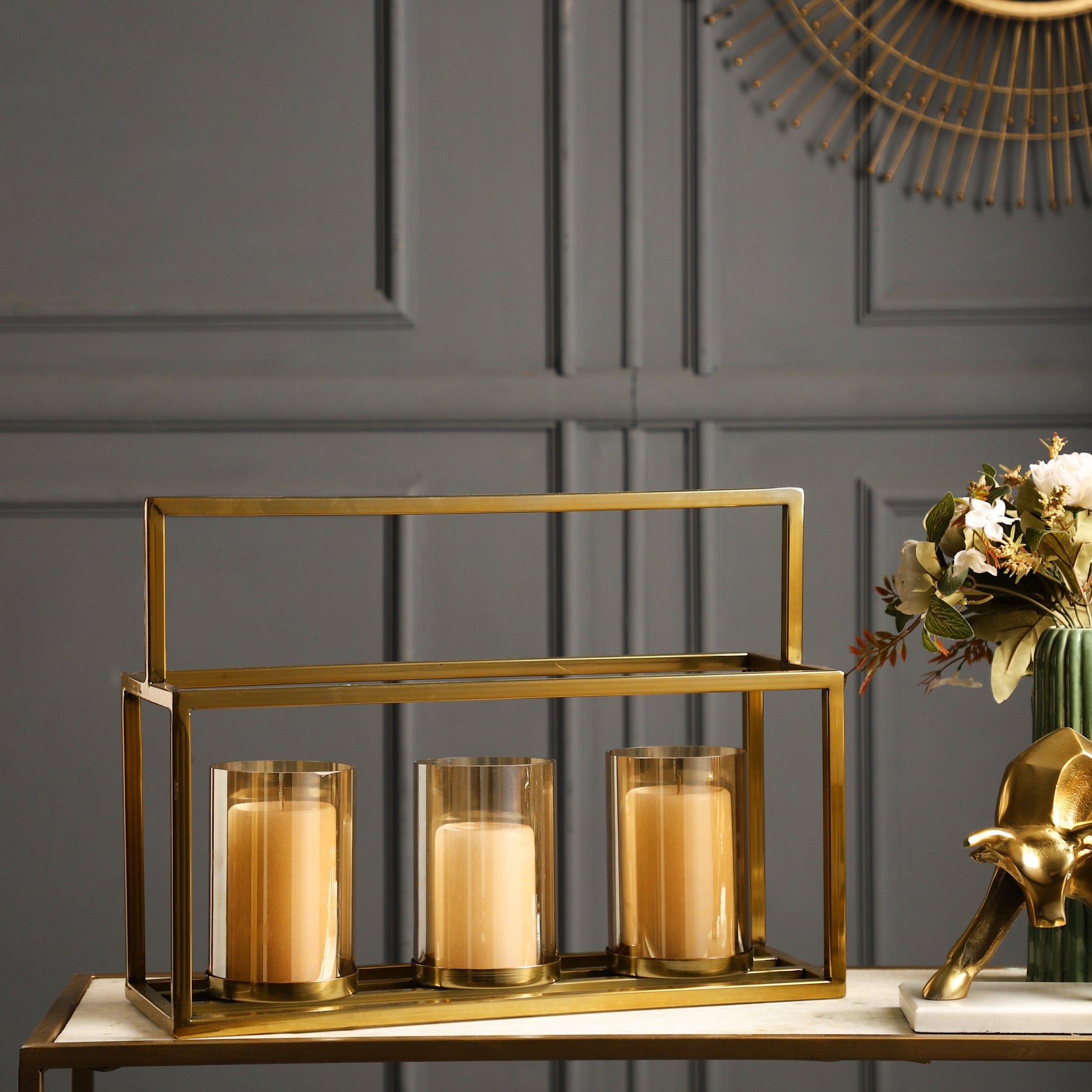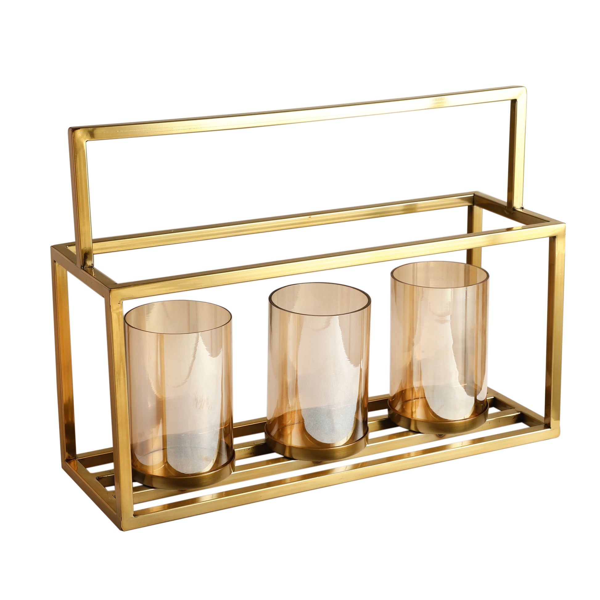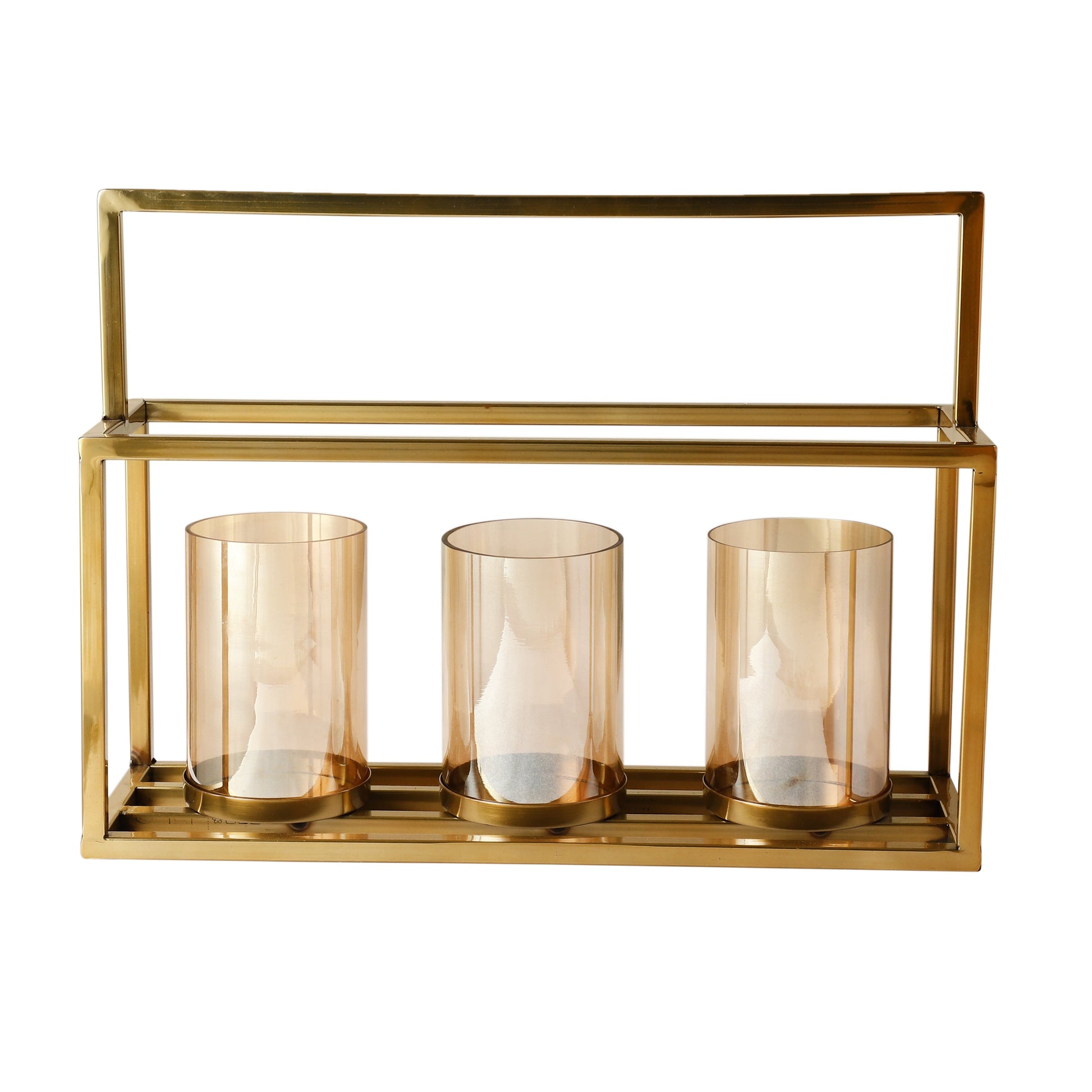 The curvy lines of this gold hurricane/lantern make it a beautiful addition for your living space. Its classic, luster glass top & stainless steel base adds class & luxury while keeping the flame glowing & protected from the wind. Works well with a pillar, & t-light candle.