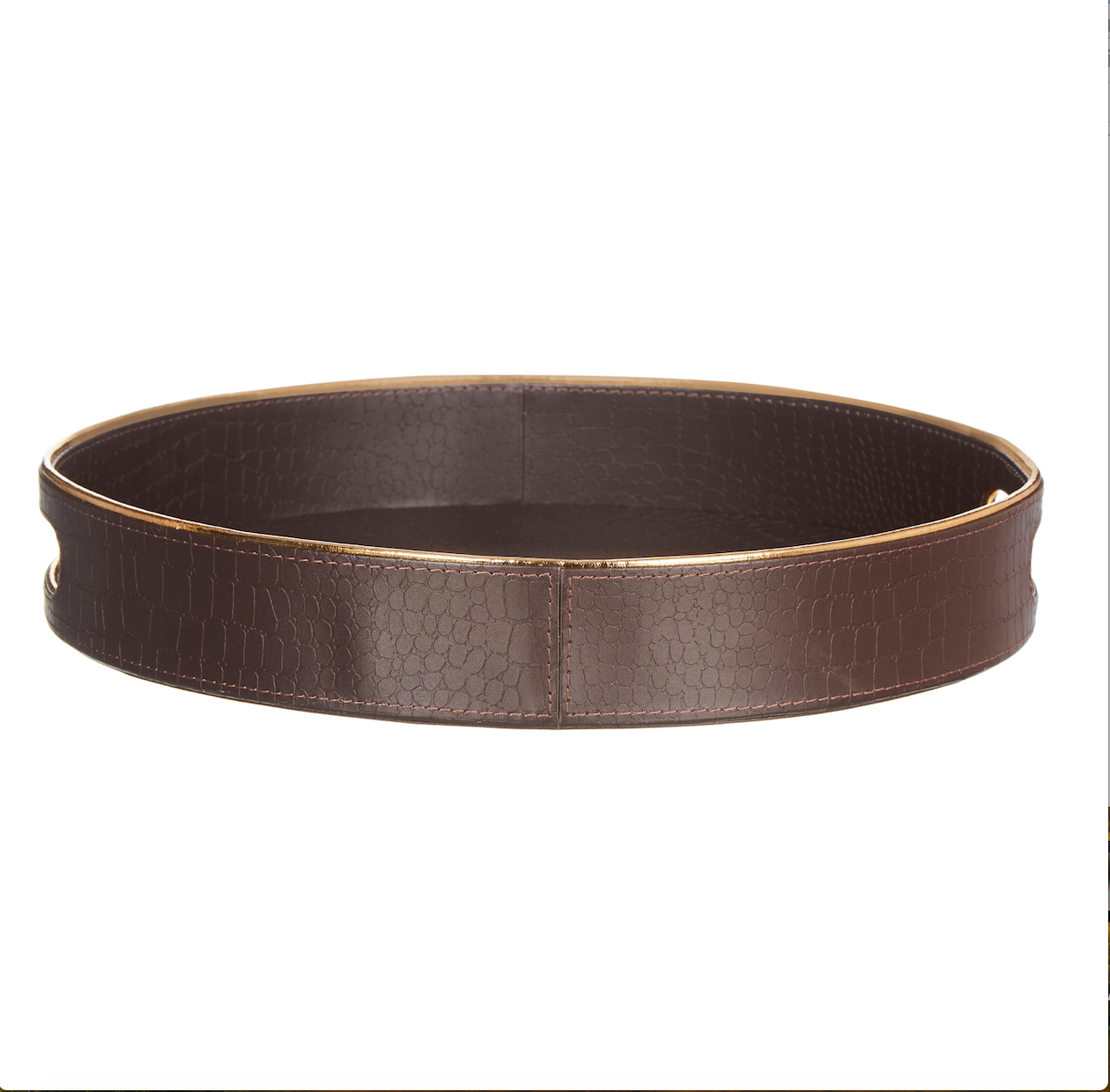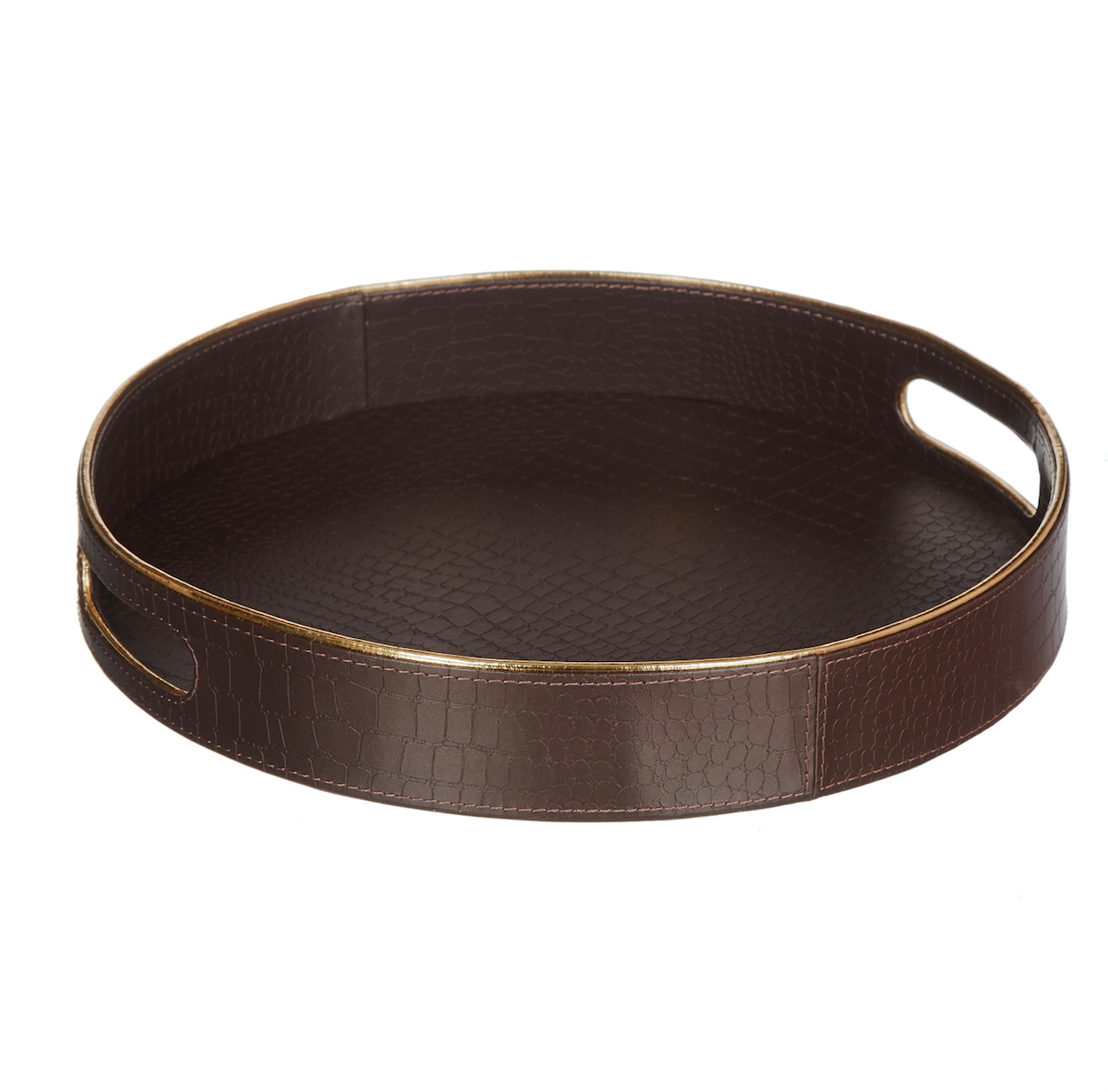 The clean & save lines of this dual finish patterned serving tray make it an elegant addition for any living space. It's dual - chocolate brown & gold finish lining make it an eclectic marriage of design and usability. The sturdy handles make it a great serving tray & works well to serve any items you may desire, or as a paper tray.