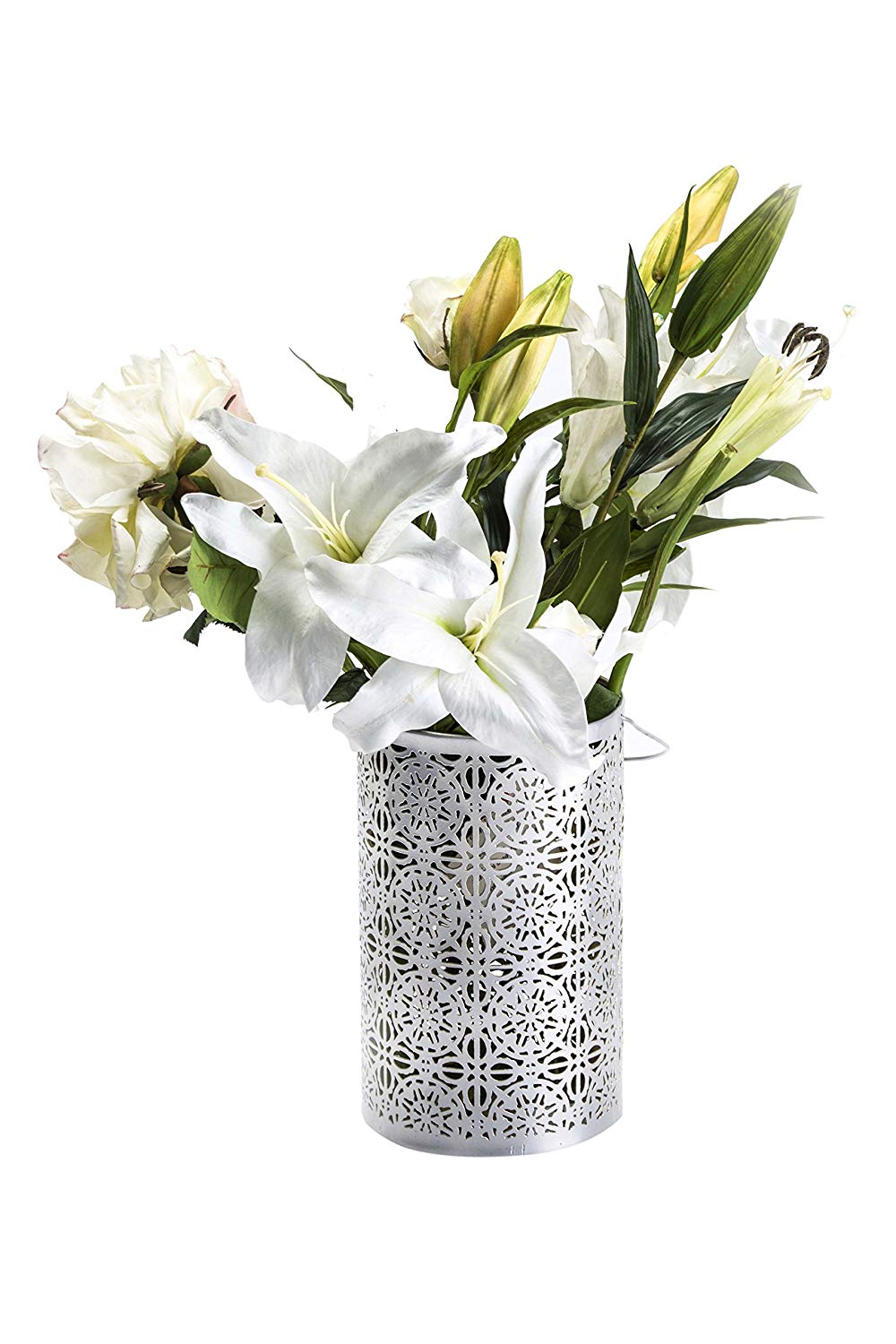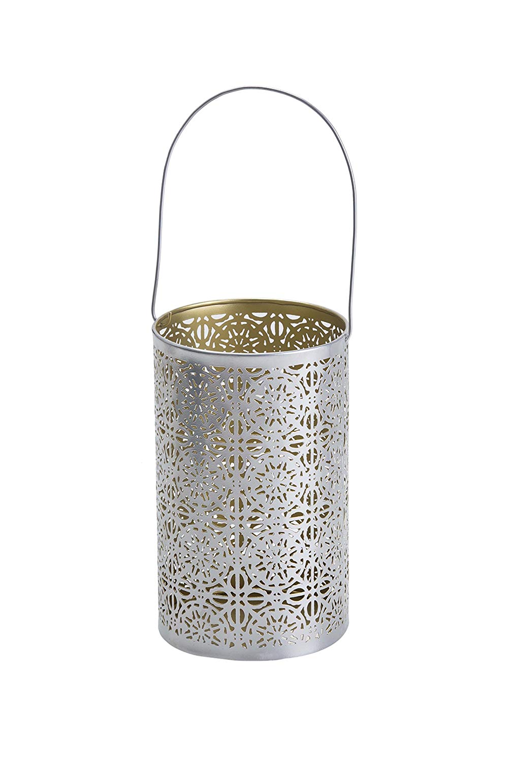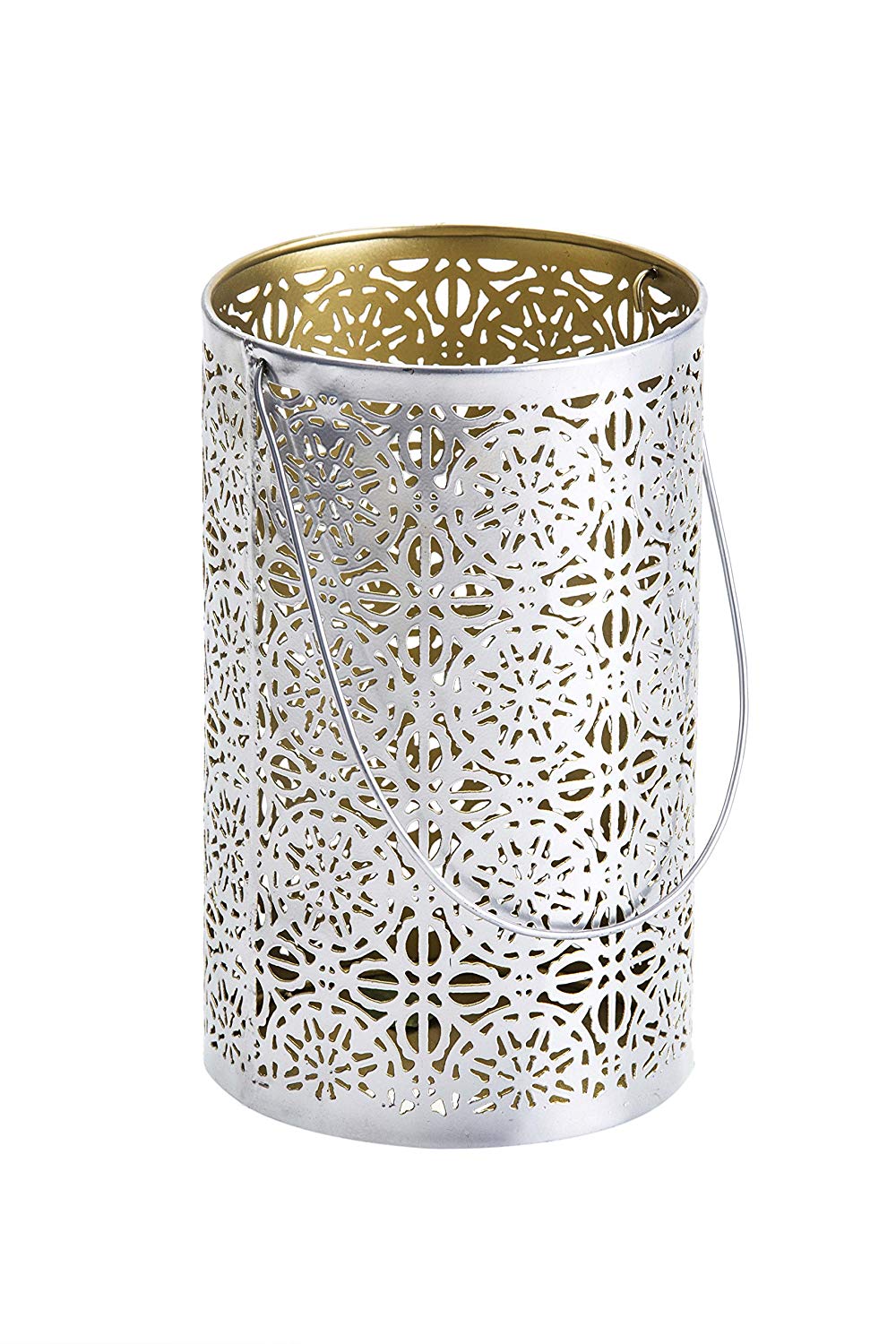 The laser cut star pattern of this lantern/Vase is inspired by Moroccan architecture. Truly a wonder, this piece is a beautiful addition for any living space, indoor or outdoor. It's two tone silver & gold finish add timeless class & usability. Works with a pillar candle or t-light or with flowers & potpourri.