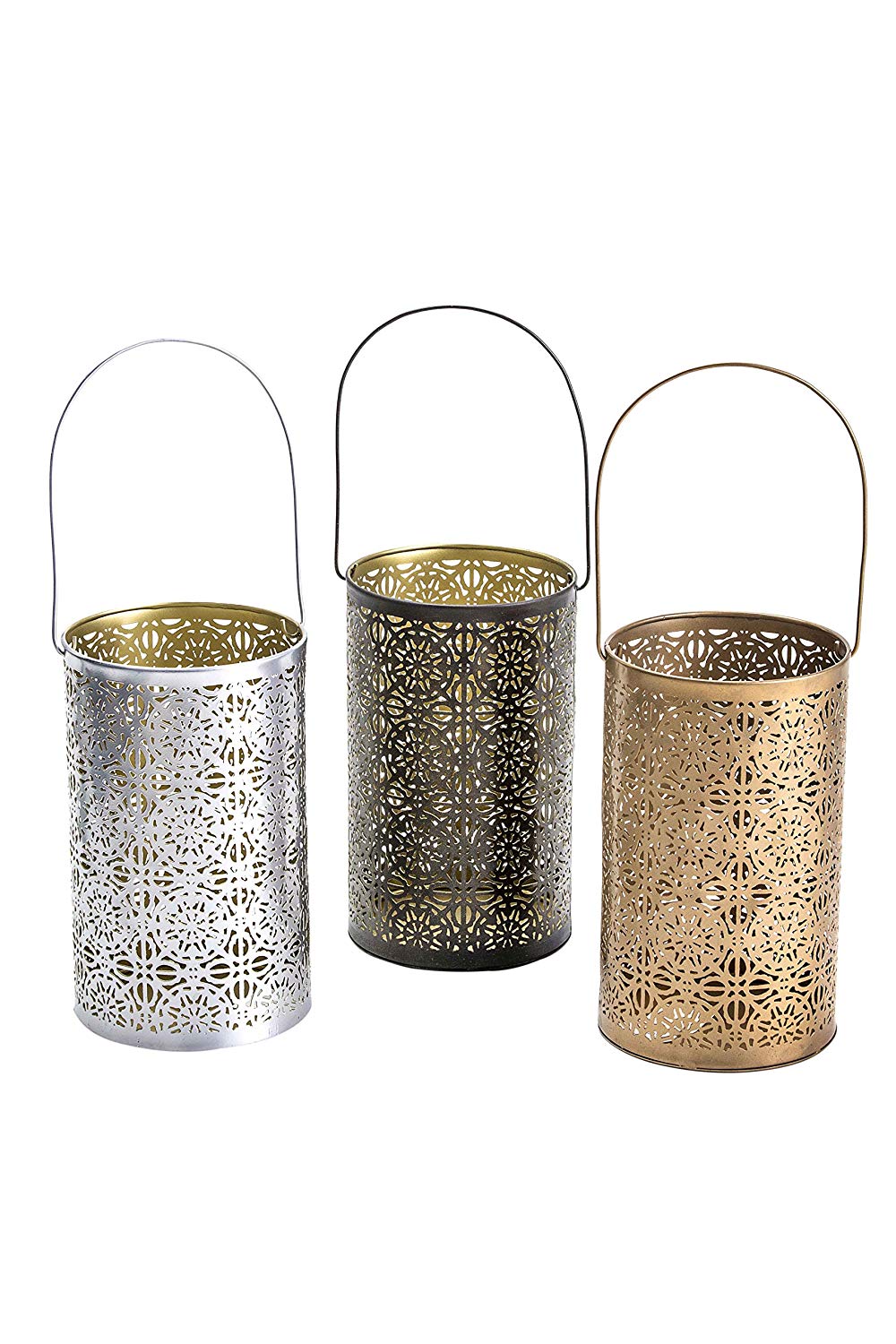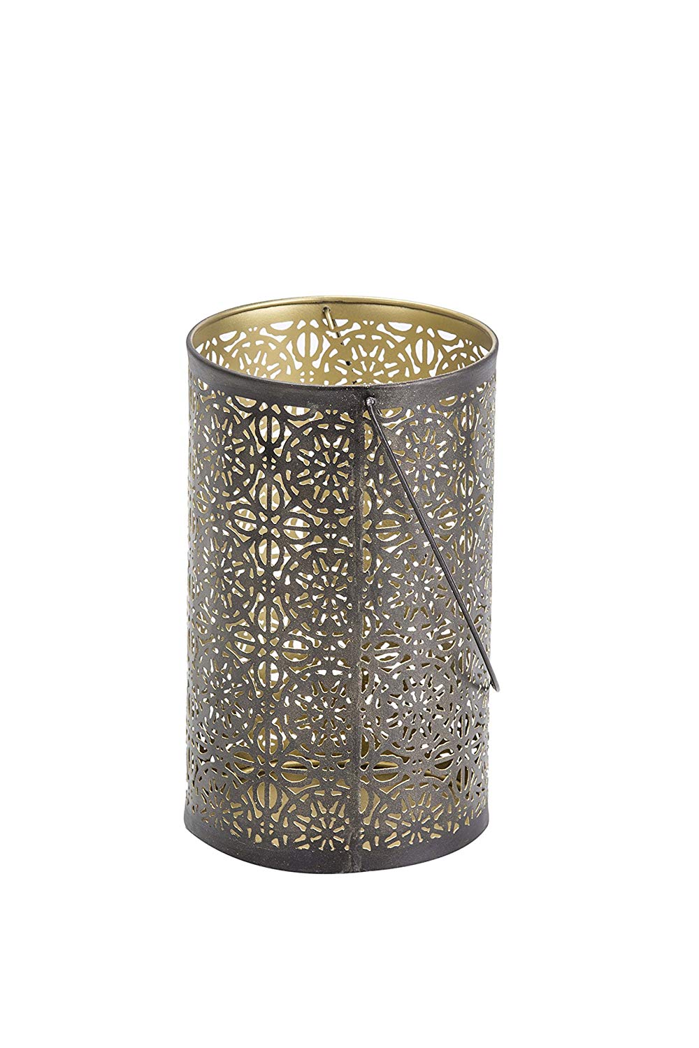 The laser cut star pattern of this lantern/Vase is inspired by Moroccan architecture. Truly a wonder, this piece is a beautiful addition for any living space, indoor or outdoor. It's two tone black and gold finish add timeless class and usability. Works with a pillar candle or t-light or with flowers and potpourri.