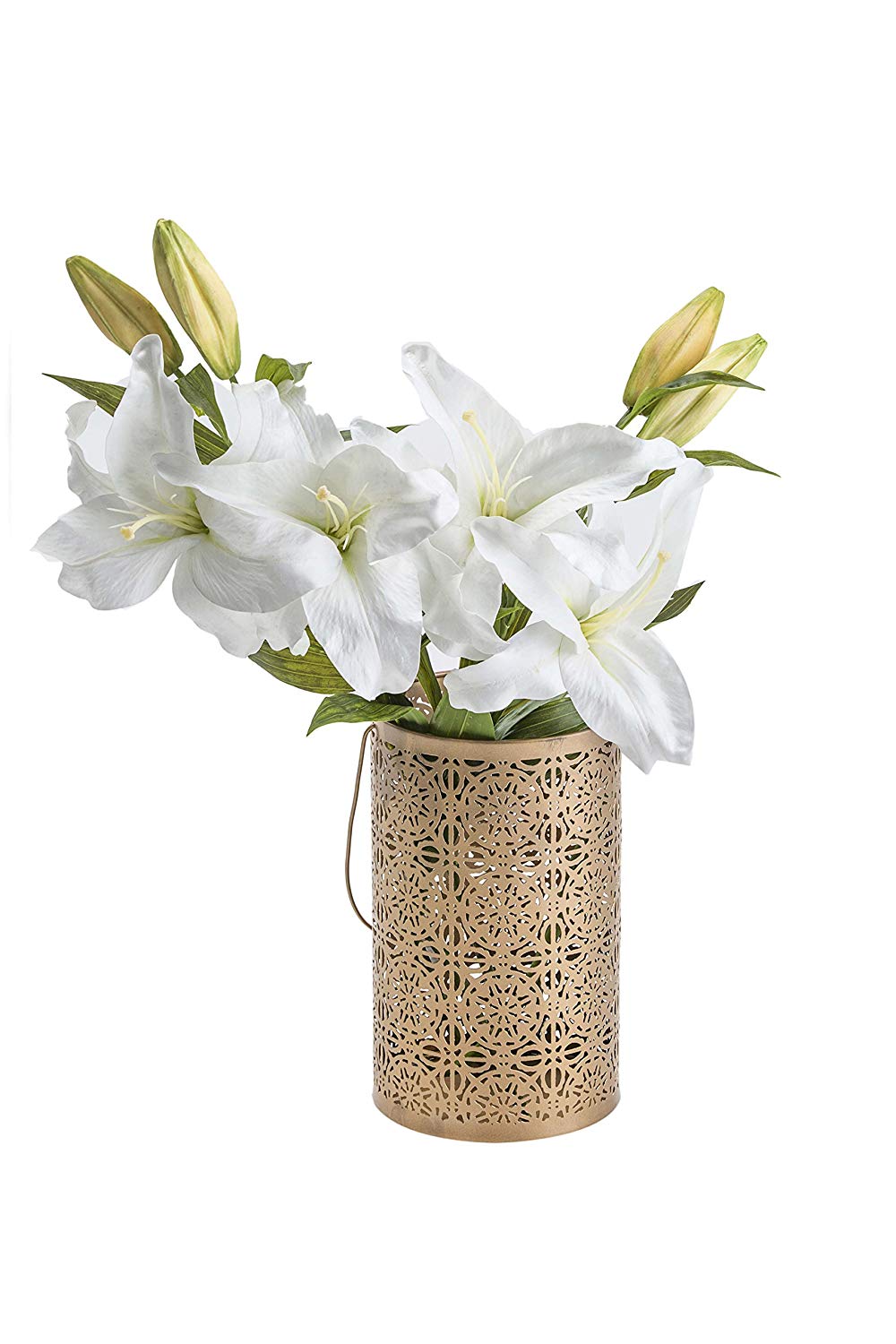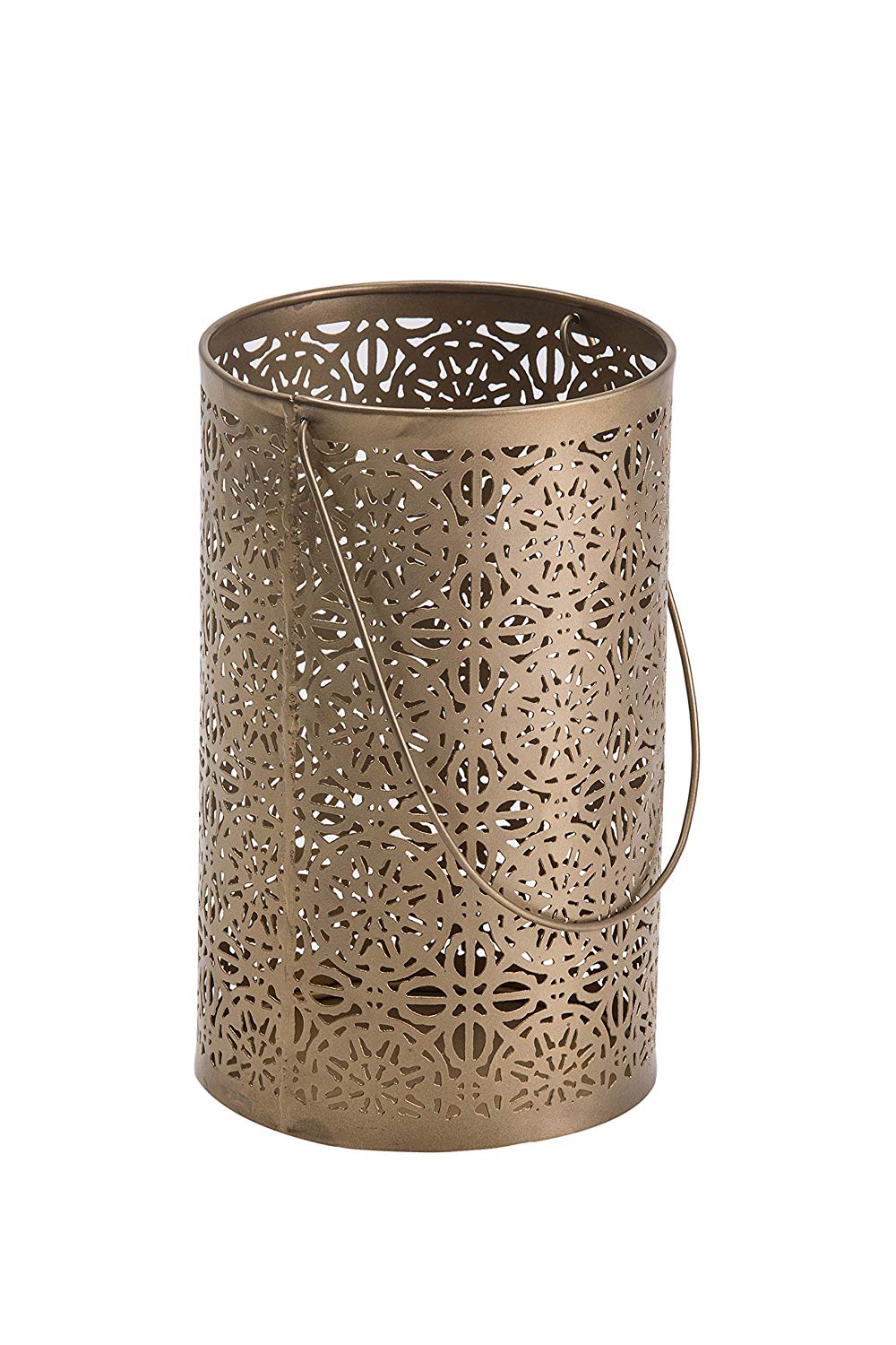 The laser cut star pattern of this lantern/Vase is inspired by Moroccan architecture. Truly a wonder, this piece is a beautiful addition for any living space, indoor or outdoor. It's gold finish adds timeless class and usability. Works well with a pillar candle or t-light or with flowers and potpourri.