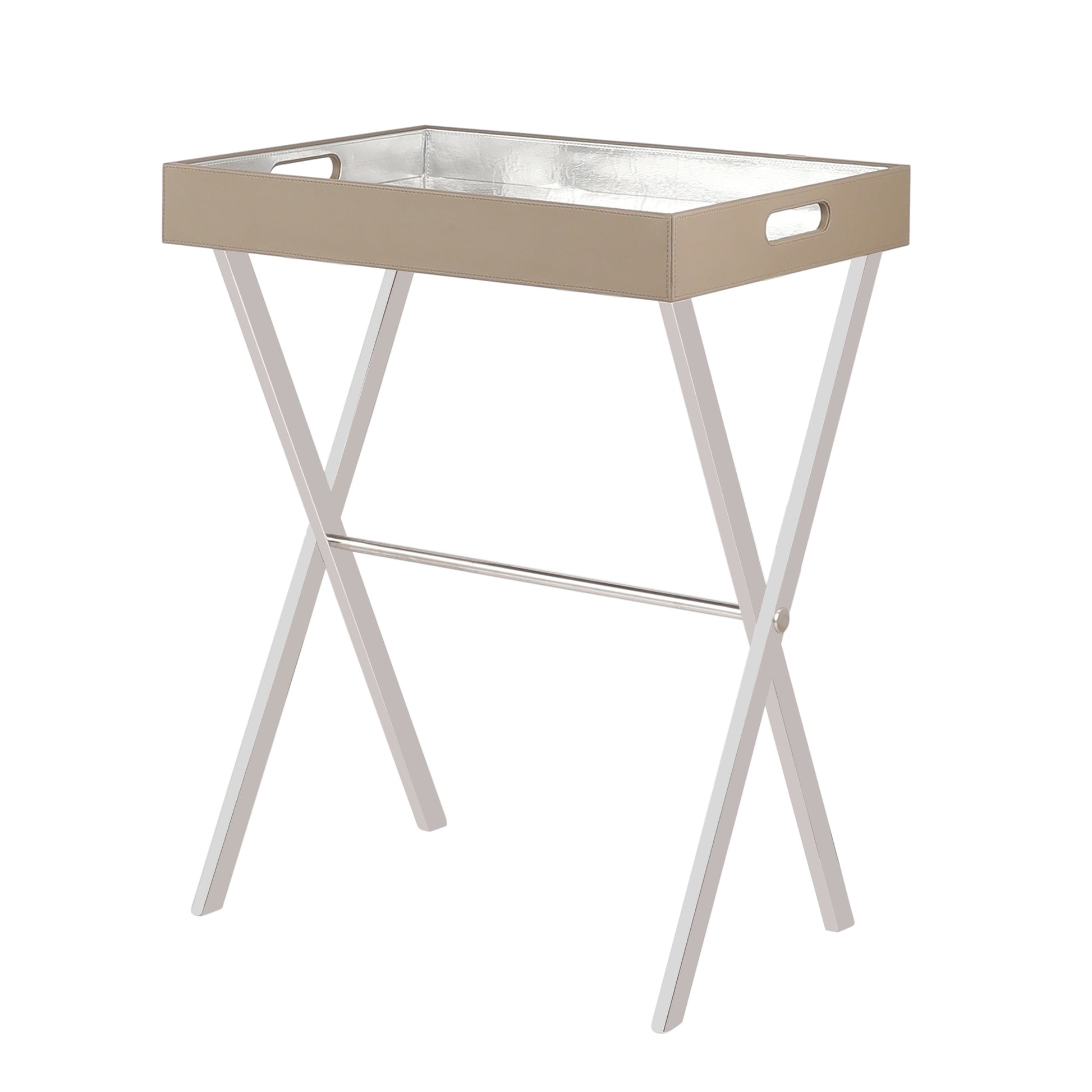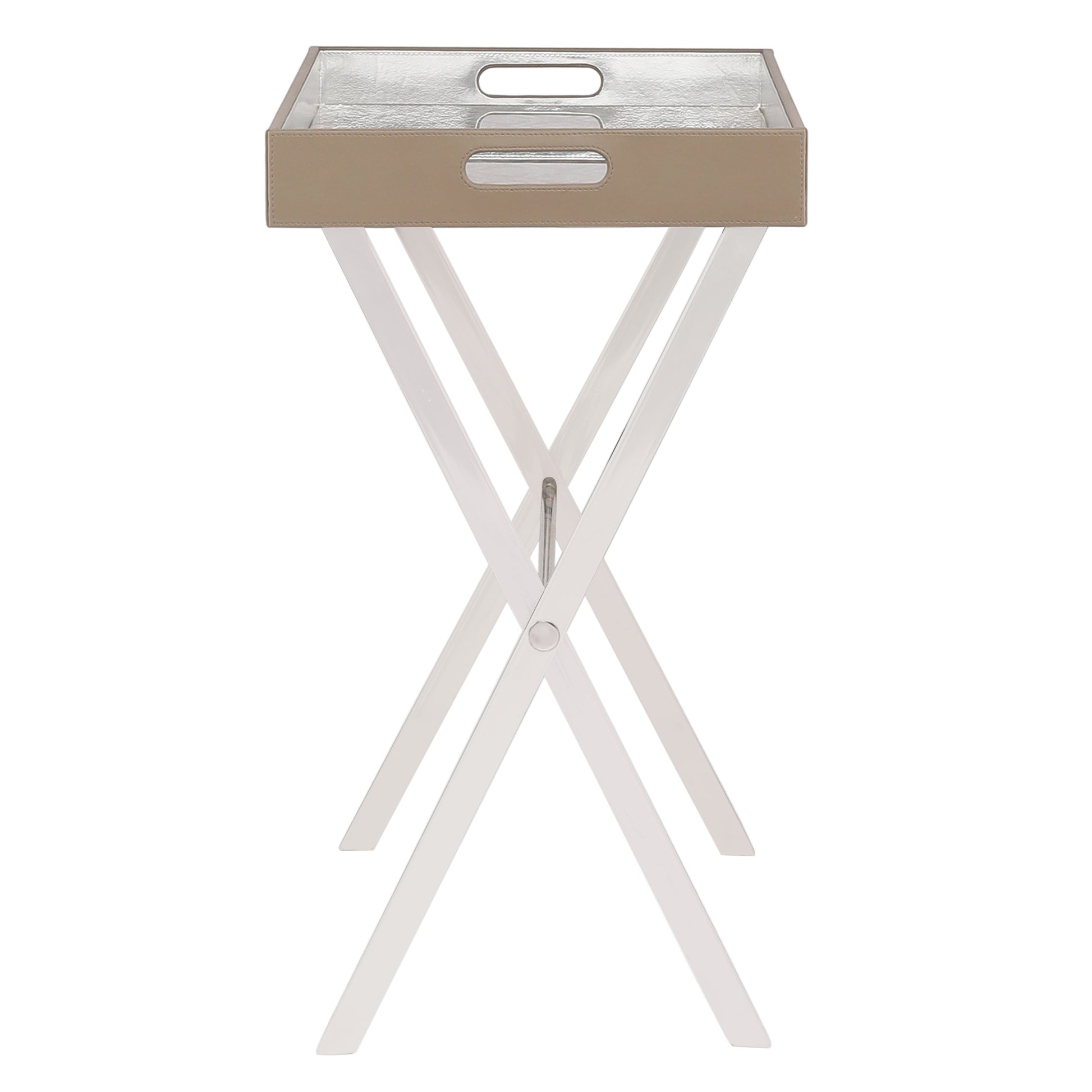 Be a trendsetter with our beautifully handcrafted 'Coonoor' Beige Butler Tray Table. The vintage & luxurious lines of this Butler tray table will enhance the look & feel of any room. The PU Leather & Glass Printed tray top is easily detachable, offering versatility& convenience. Use in a corner to display treasures or the detachable tray can be used by itself. The steel table base is foldable & can easily be stored.