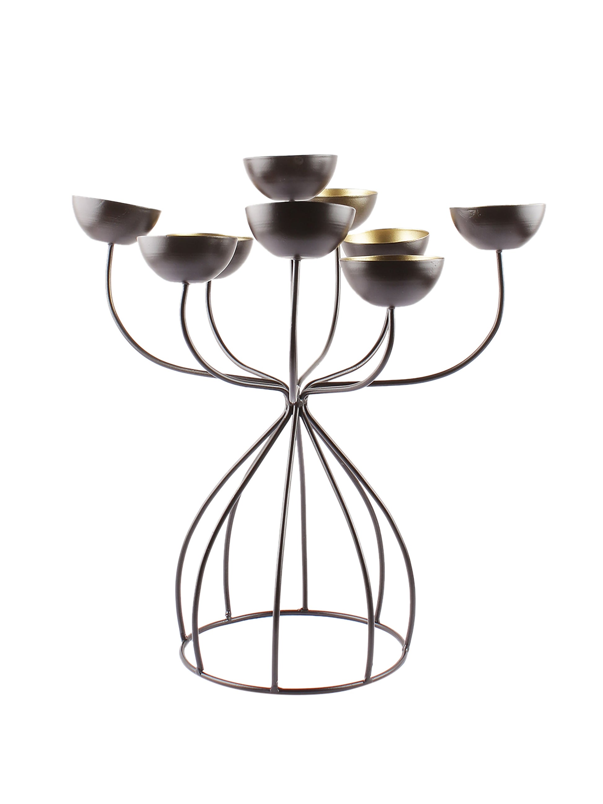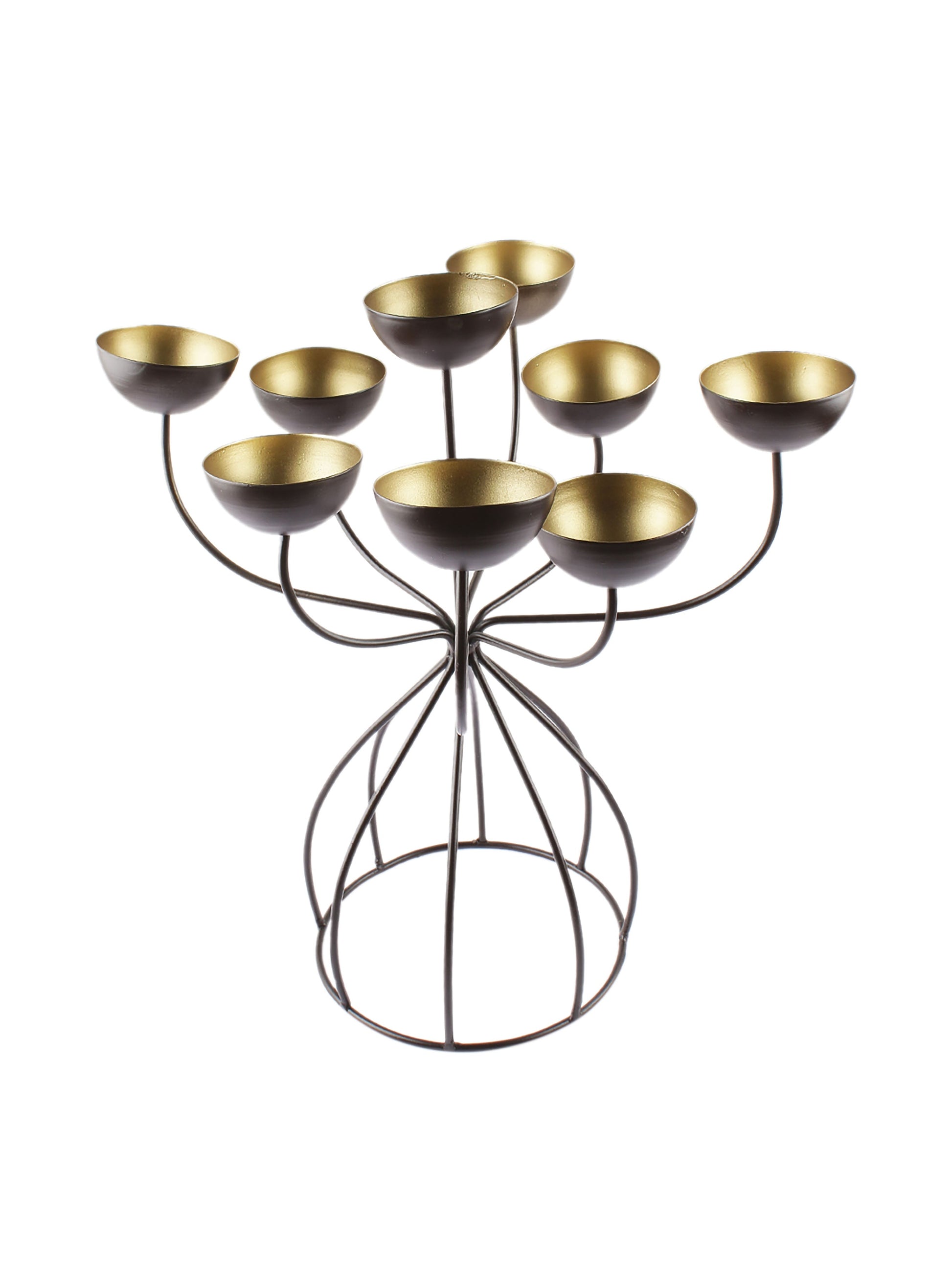 The regal & modern lines of this beautiful candle holder make it a perfect addition to your living space. The dual tone bronze & gold finish highlight the intricate design of this piece. It works well with a t-light & pillar candle.