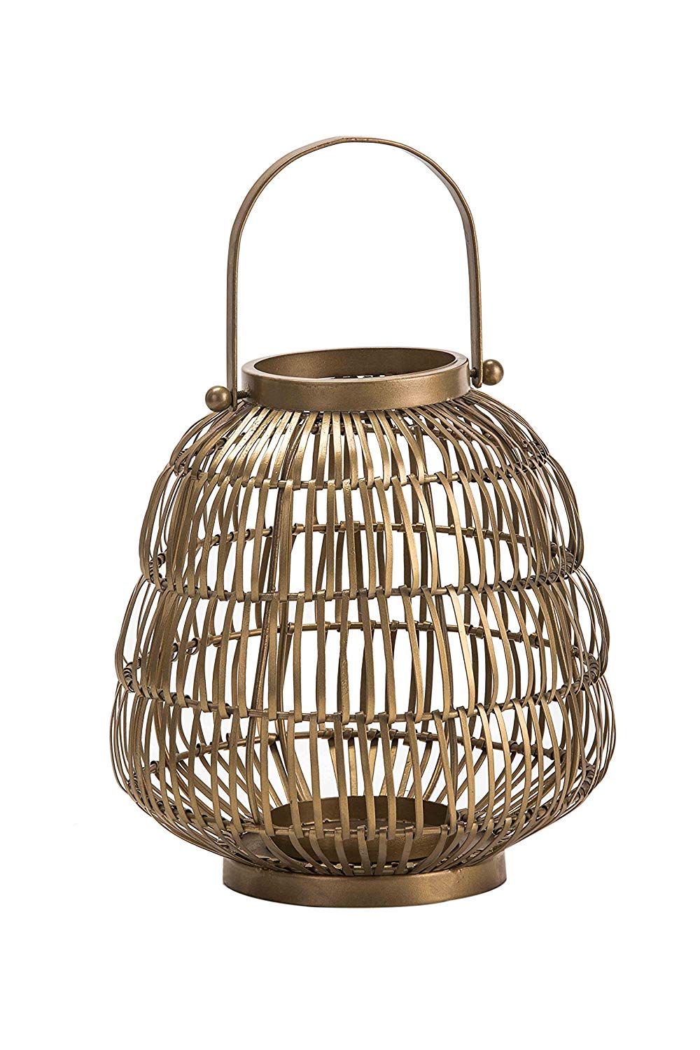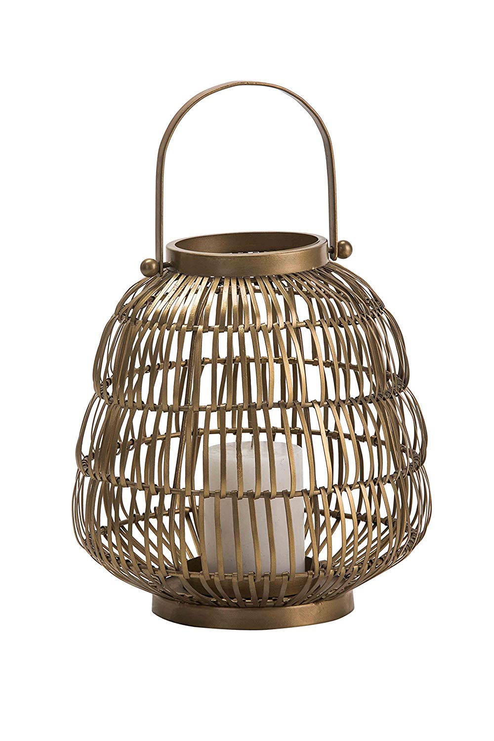 The woven appealing lines of this gold lantern adds beauty and craft for any living space. The wired iron base with the handle add usability, grandeur to every piece. Works both with pillar candles and t-lights or with flower and potpourri. Perfect for indoors/outdoors.