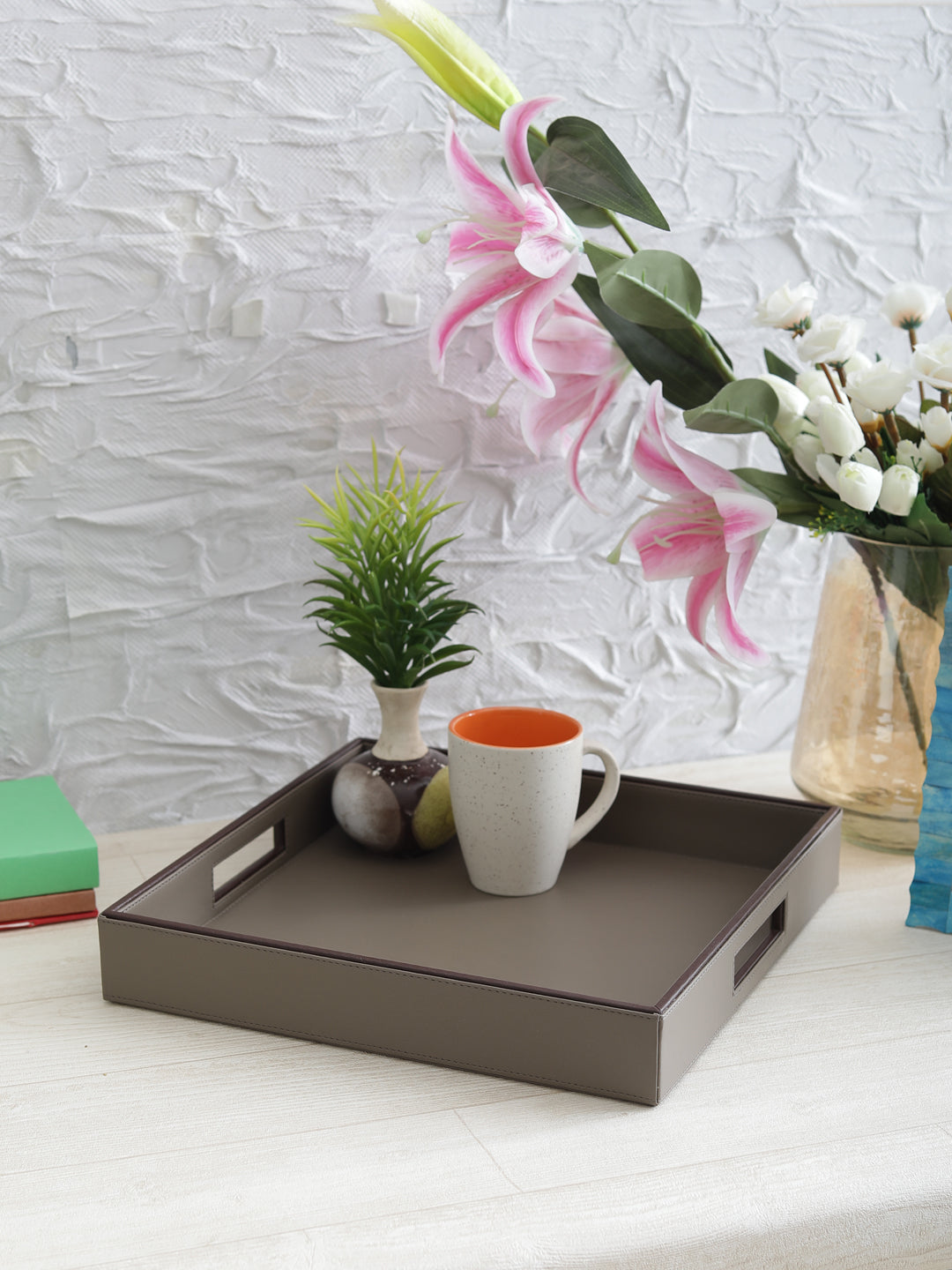 The clean & save lines of this dual finish serving tray make it an elegant addition for any living space. It's dual - blue & gold finish make it an eclectic marriage of design and usability. The sturdy handles make it great a serving tray & works well to serve any items you may desire, or as a paper tray.