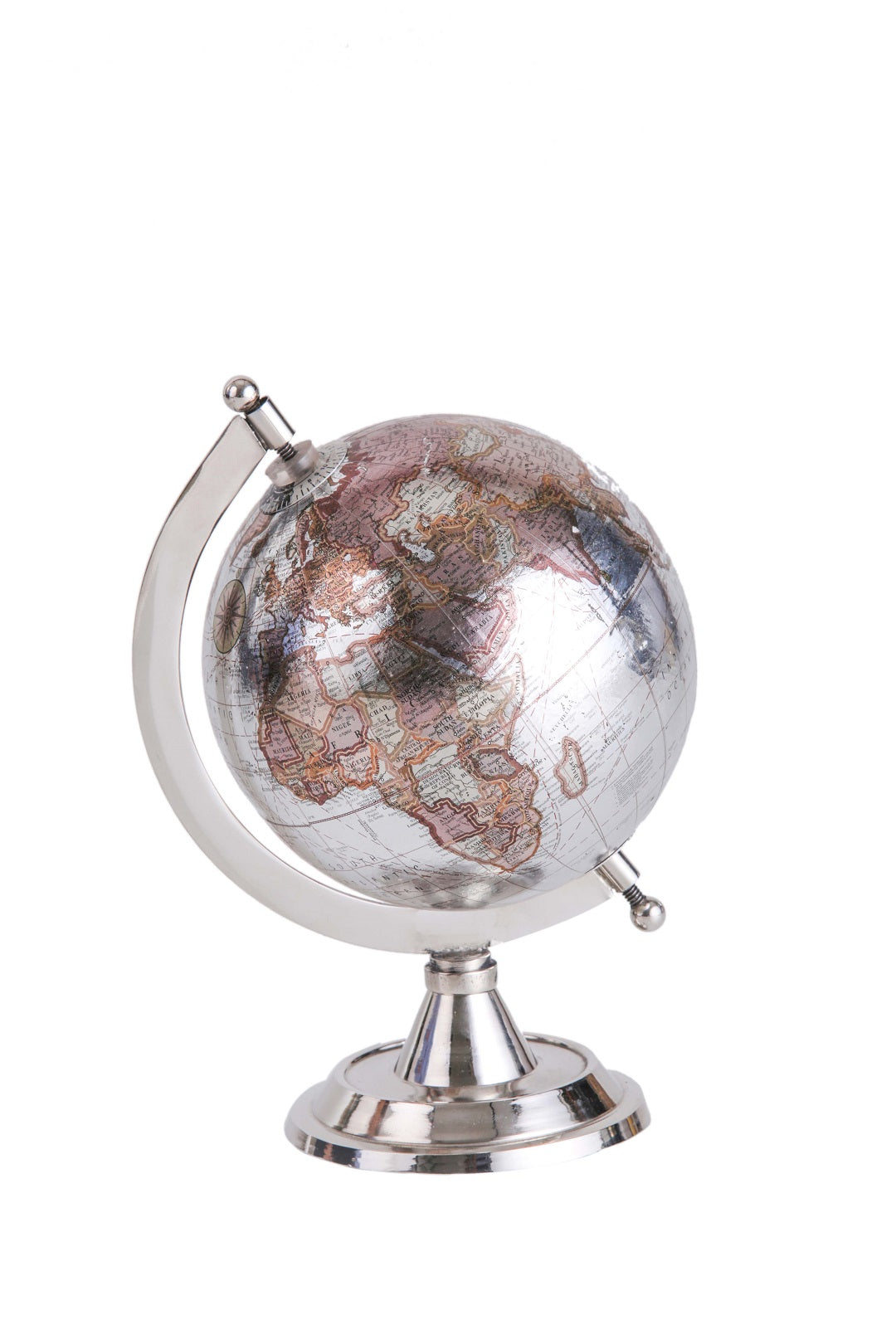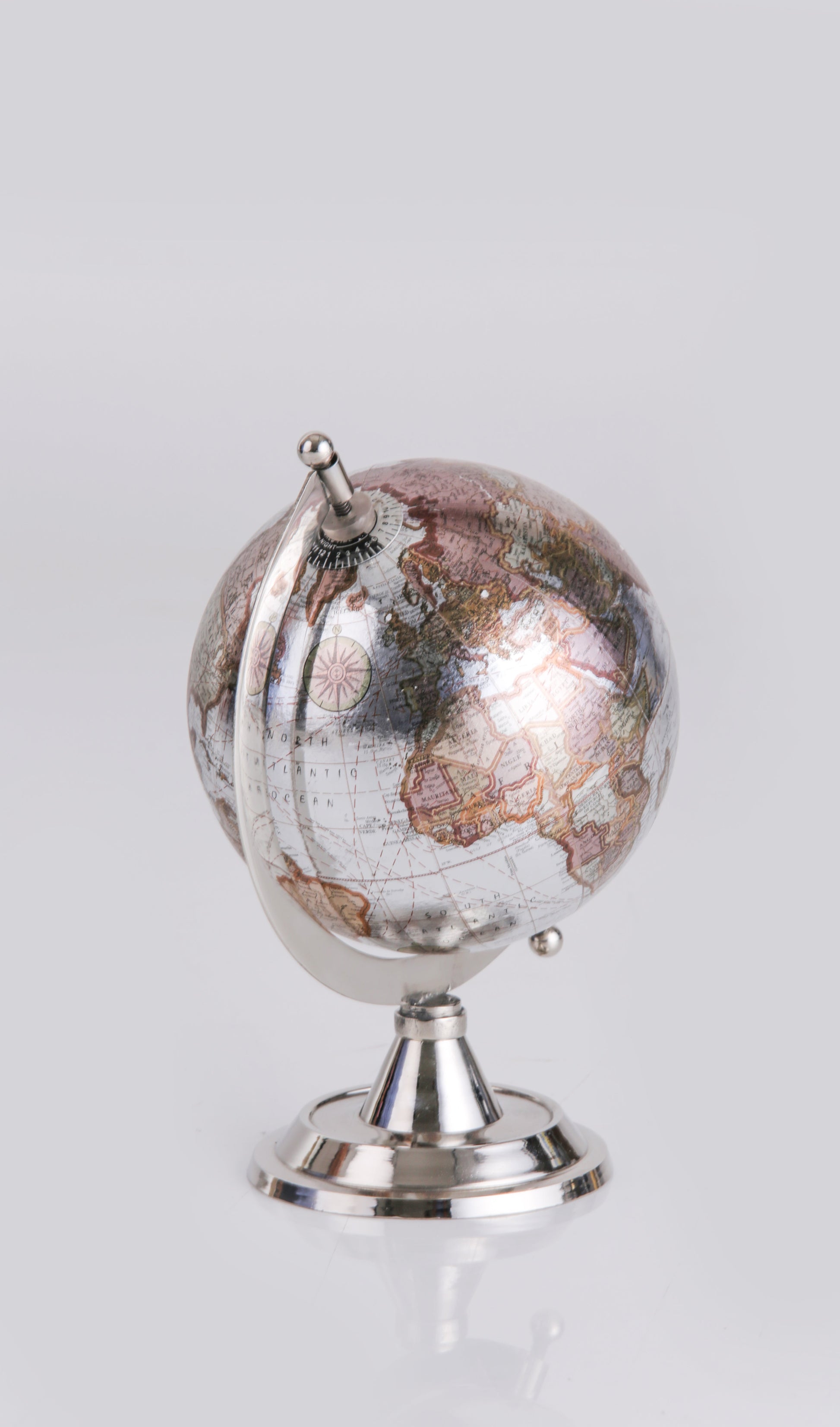 The Drake metallic silver globe is a perfect accent for any room. It can be used as a decorative or to fuel your curiosity. Perfect on your study table or a coffee table book in your home or office. Travel the world with this unique tabletop item.