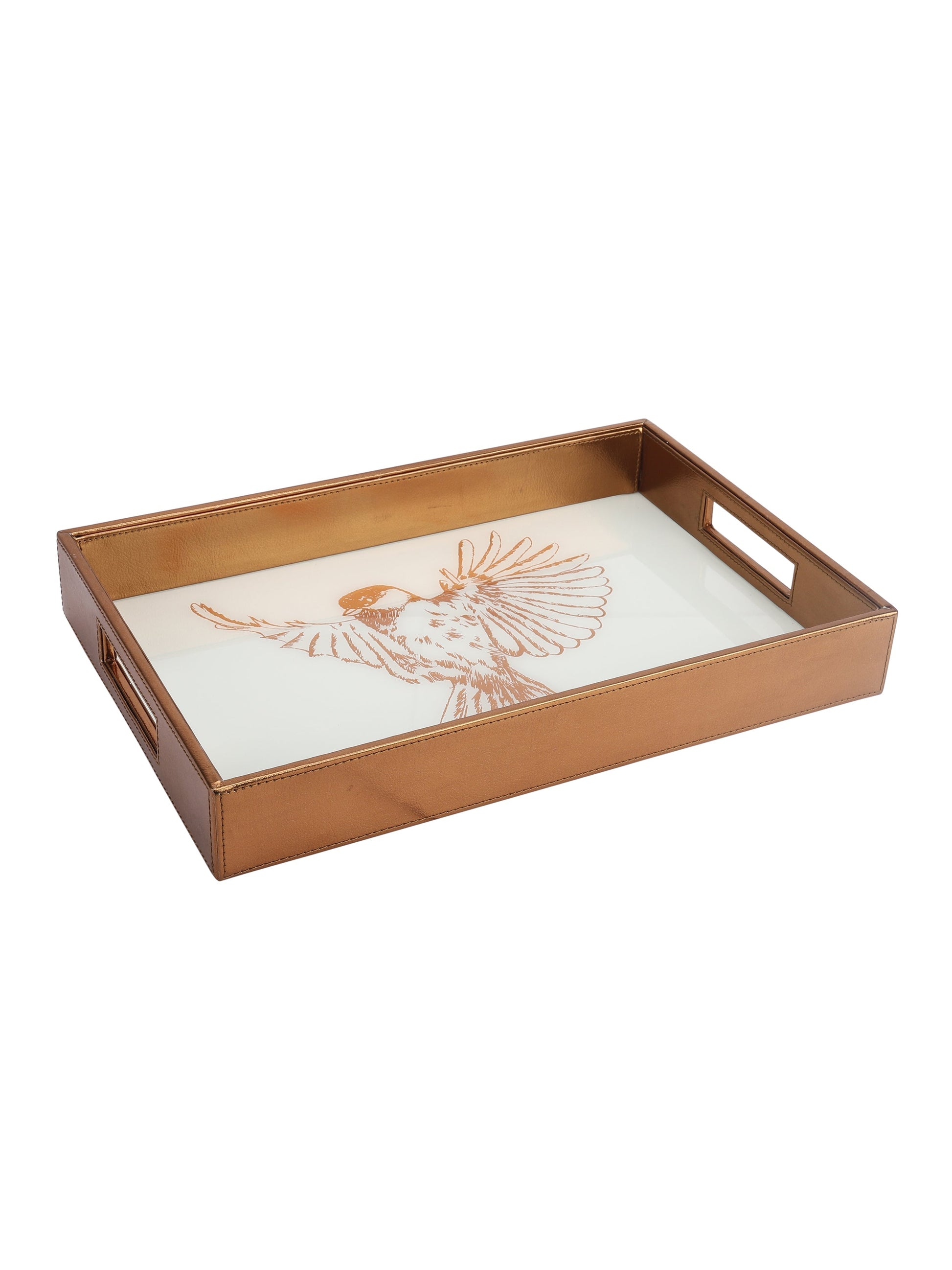 The artistic & eye-catching design of this stunning piece make it a truly ornate addition for any living space. It's delicate handcrafted Rose Gold Bird pattern on glass really make it stand out. Works well as a serving tray or as an accent piece.