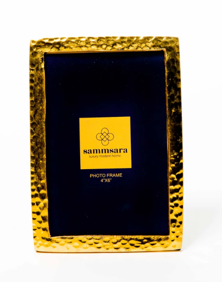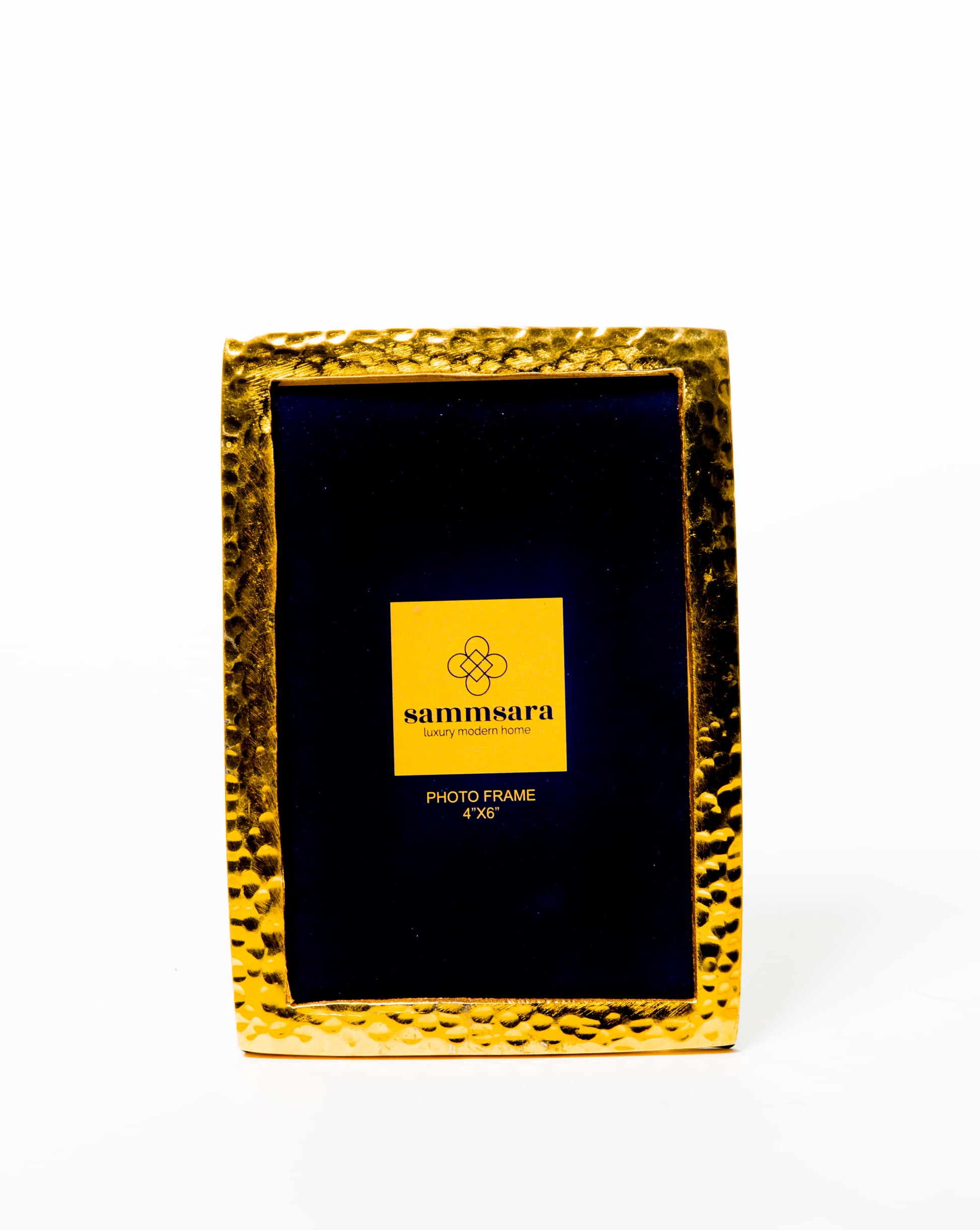 This gold-hammered photo frame is an ornate addition to a room. The gold finish adds charm while maintaining its luxurious yet simple look.