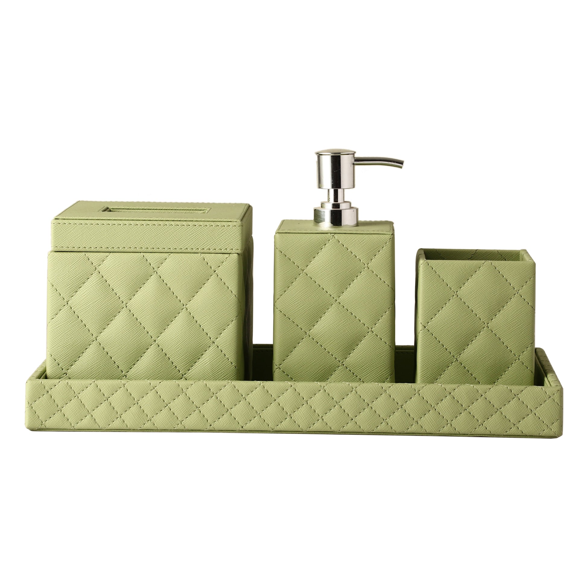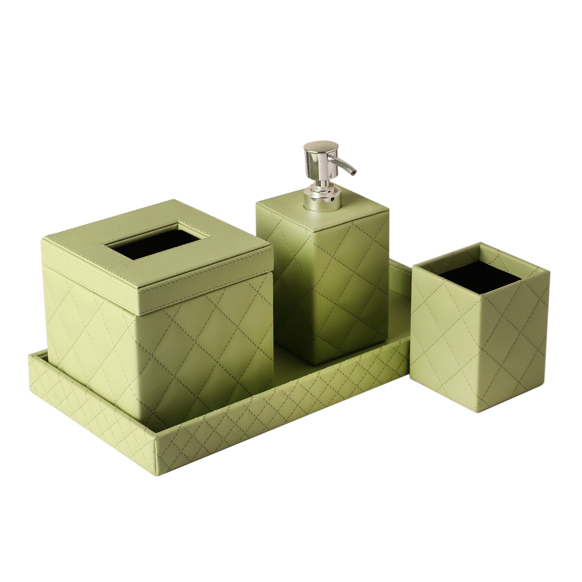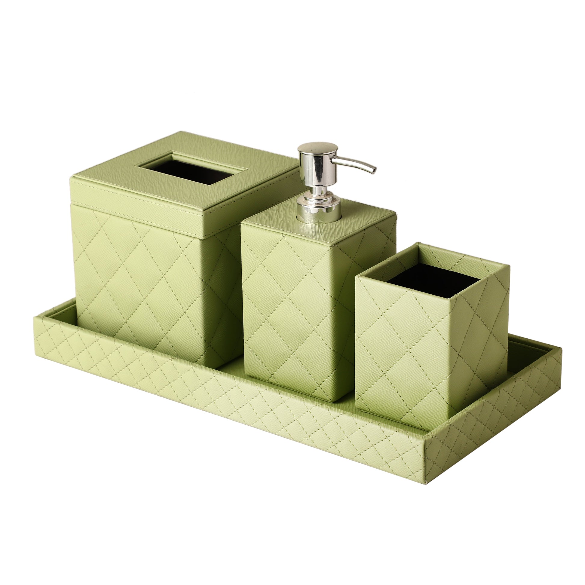 Be a trendsetter with this elegant & regal bathroom set from 'Sammsara'. Handcrafted intricately, with the highest grade quilted PU leather this set includes a soap dispenser, toothbrush stand, tissue holder & a tray. Stylise your bathroom with this practical & design oriented accent.