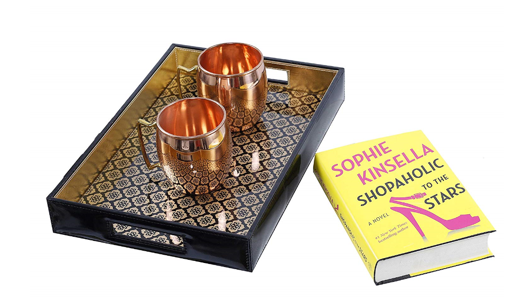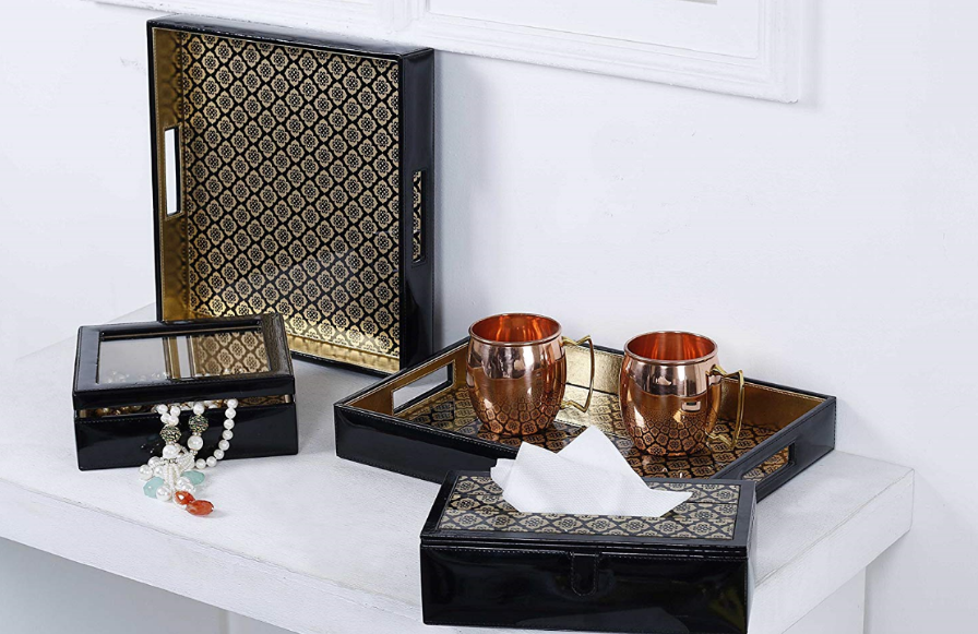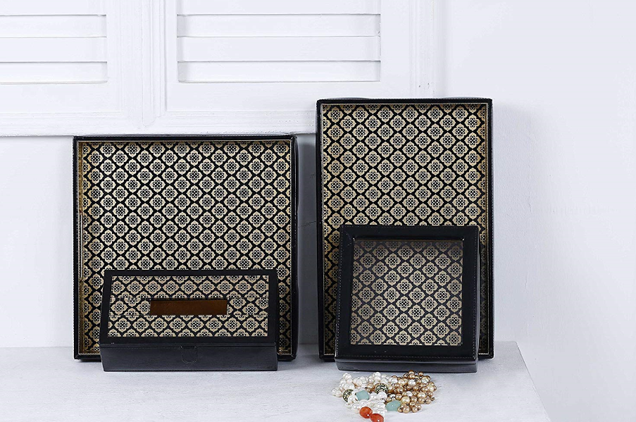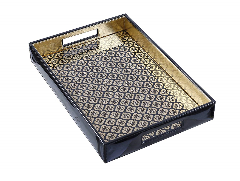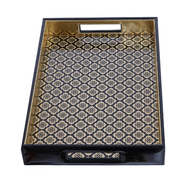 Jaisalmer Rectangle black & gold Pattern Glass Printed Leatherite Tray