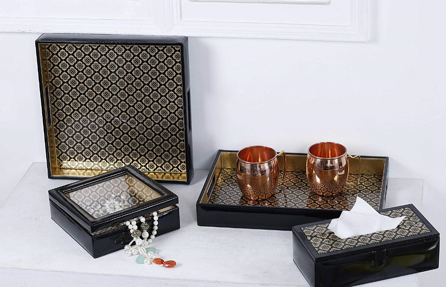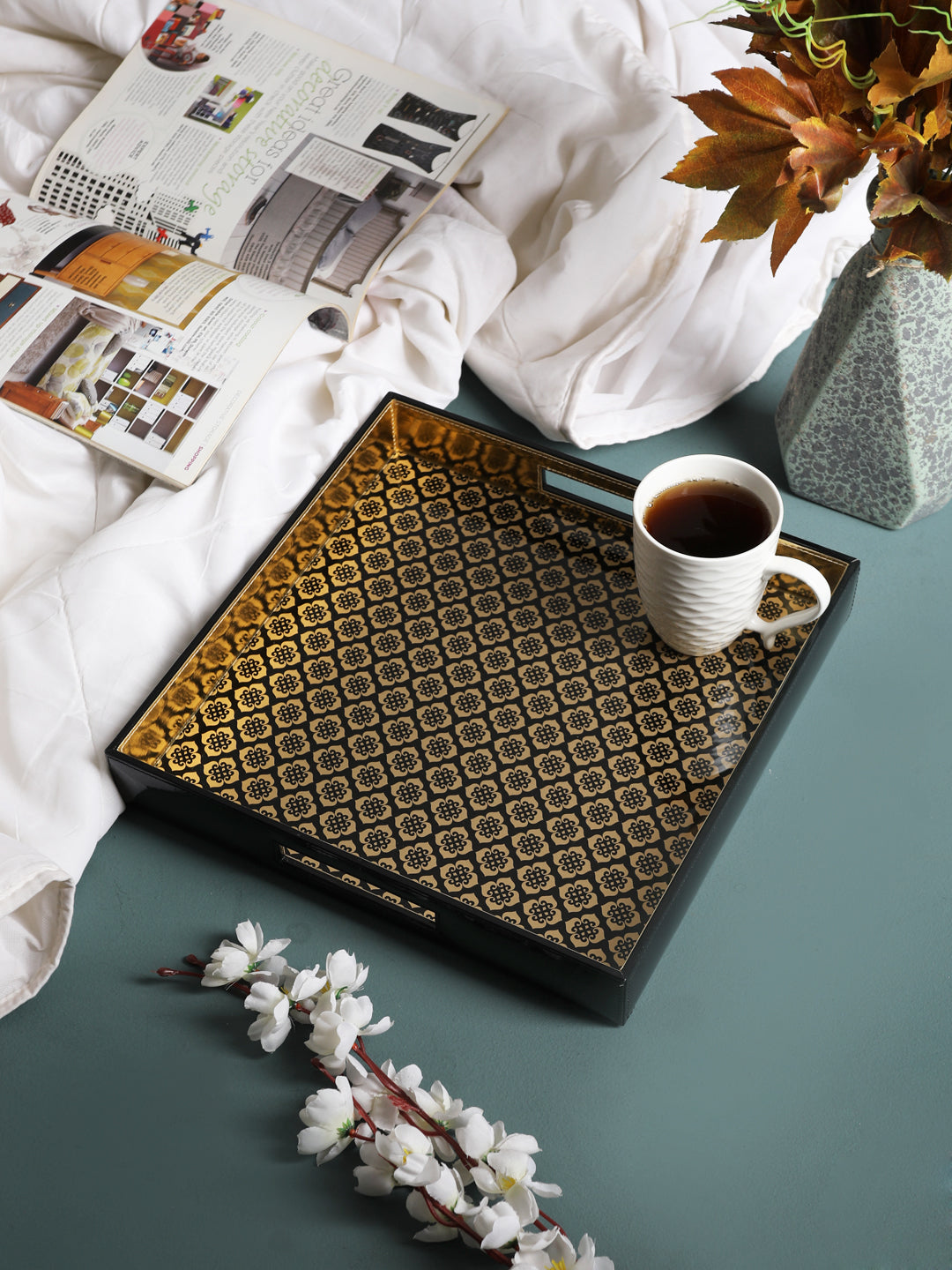 Jaisalmer square black & gold Pattern Glass Printed Leatherite Tray