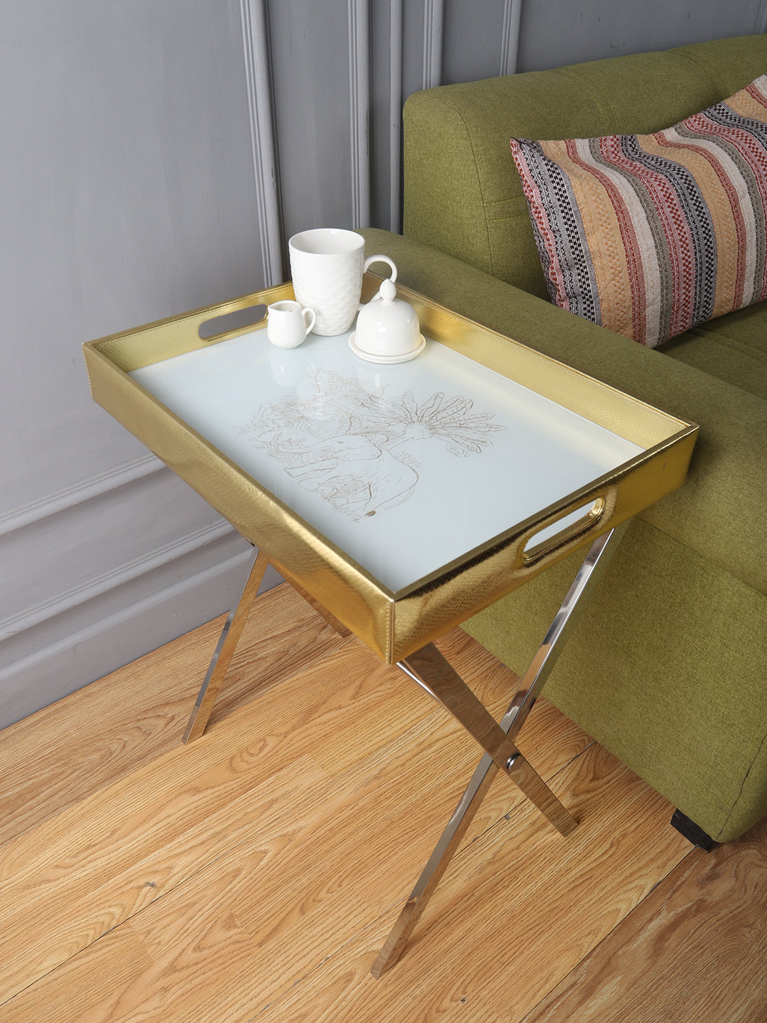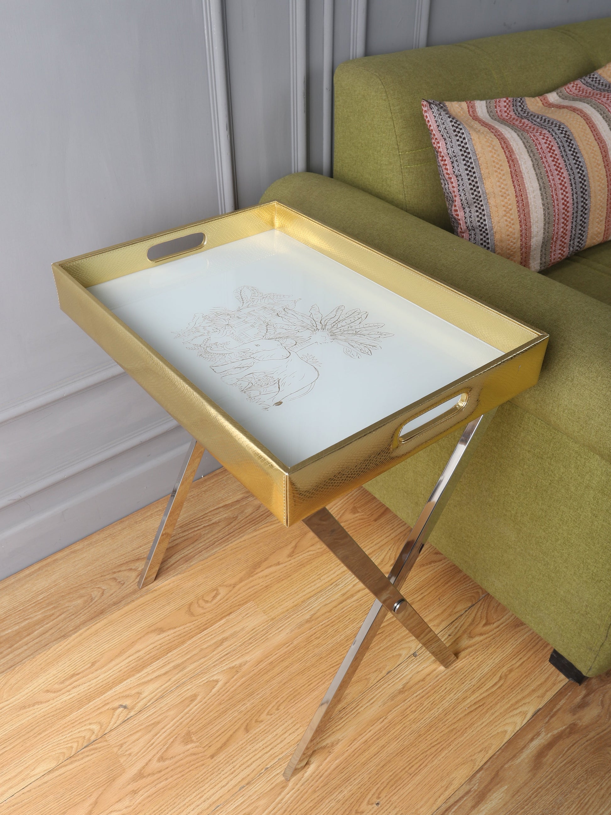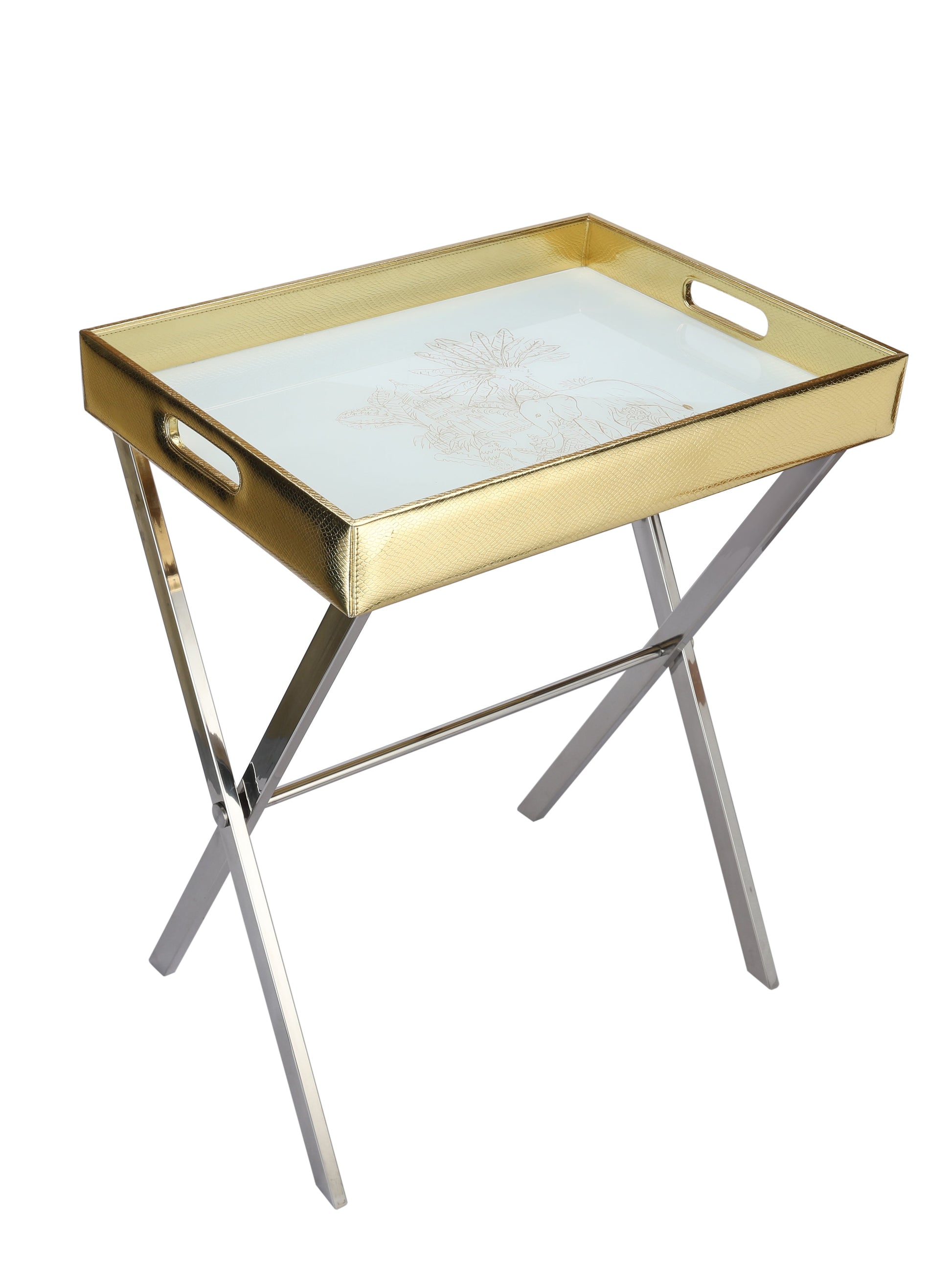 Be a trendsetter with our beautifully handcrafted 'Kipling Animal Scenery' print Butler Tray Table. The artistic & luxurious lines of this Butler tray table will enhance the look & feel of any room. The PU Leather & Glass Printed tray top is easily detachable, offering versatility& convenience. Use in a corner to display treasures or the detachable tray can be used by itself. The steel table base is foldable & can easily be stored.