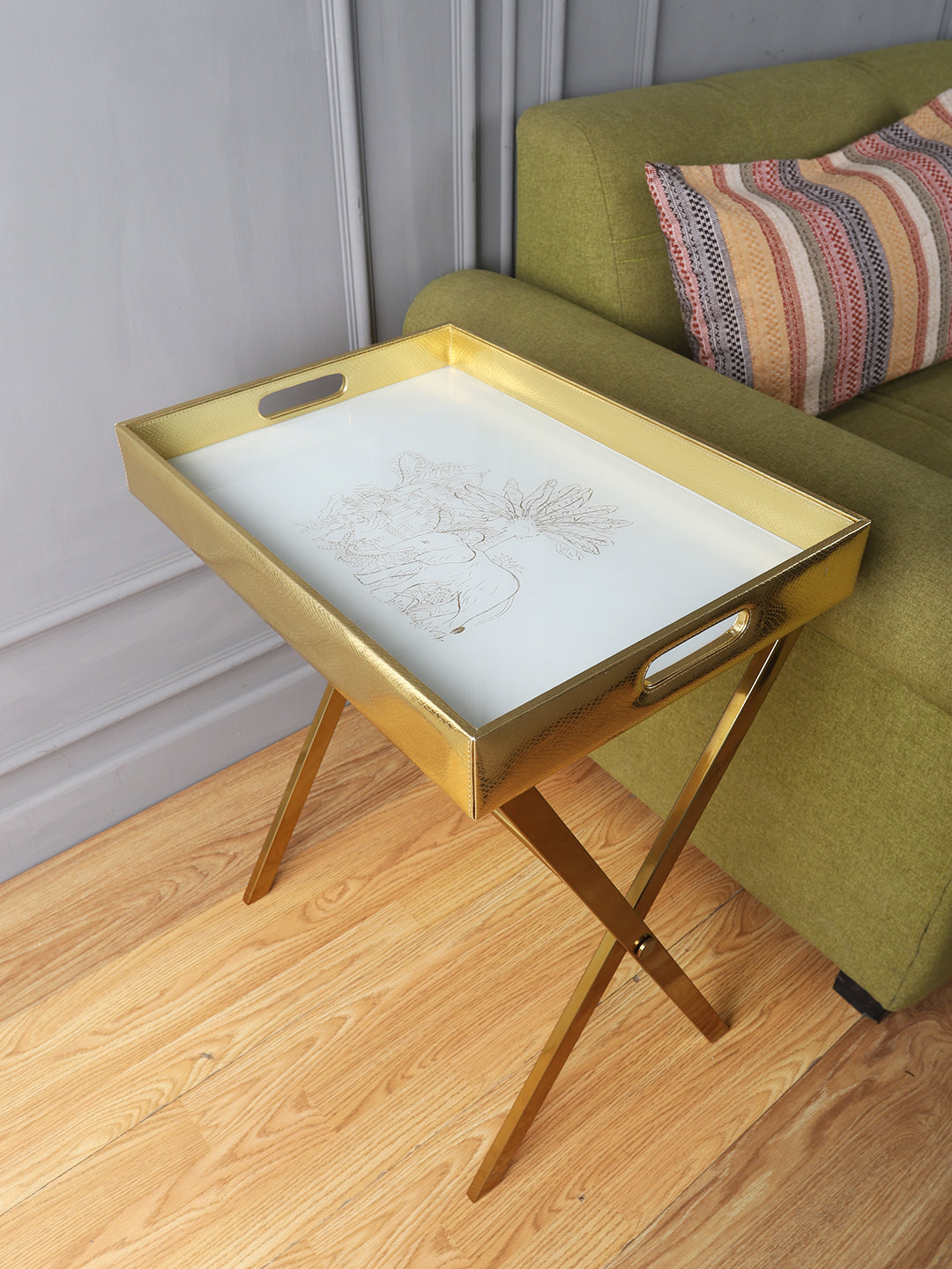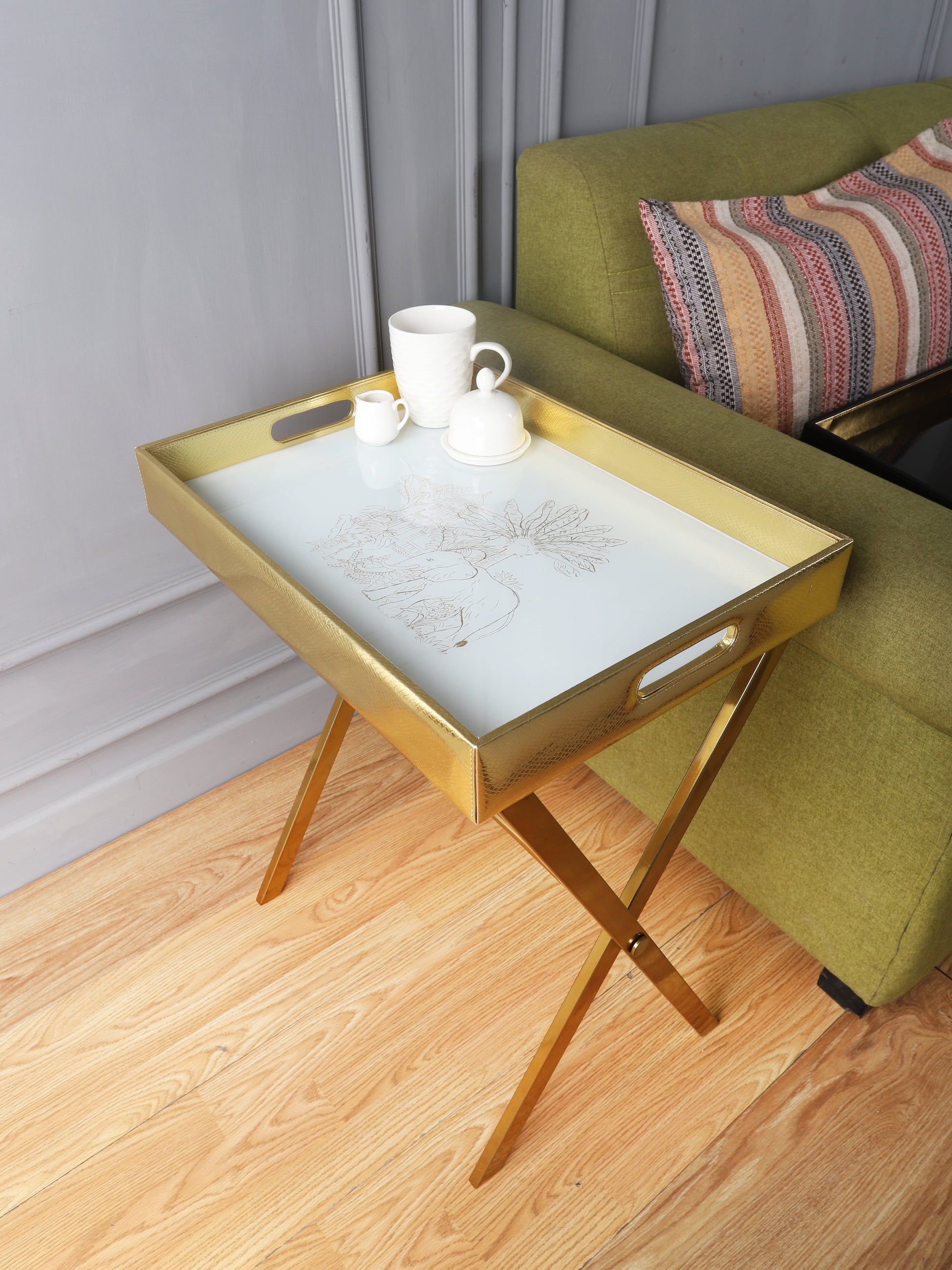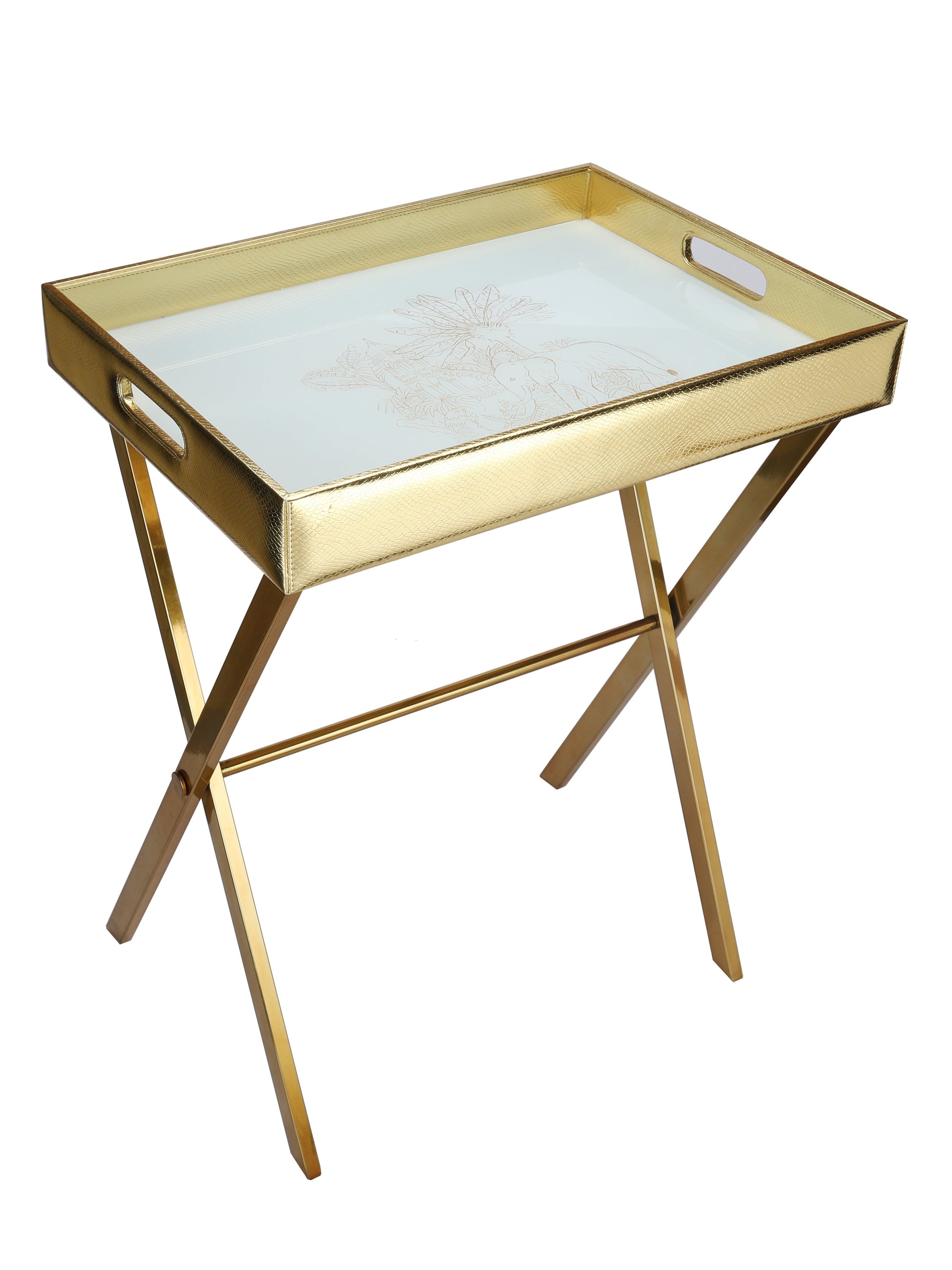 Be a trendsetter with our beautifully handcrafted 'Kipling Animal Scenery' print Butler Tray Table. The artistic & luxurious lines of this Butler tray table will enhance the look & feel of any room. The PU Leather & Glass Printed tray top is easily detachable, offering versatility& convenience. Use in a corner to display treasures or the detachable tray can be used by itself. The steel table base is foldable & can easily be stored.