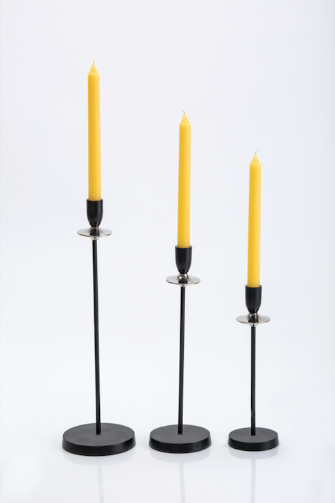 The contemporary & minimalistic lines of the black & nickel two-tone candle stand make this a fabulous addition to any living space. It's subtle design & rich aluminum finish can be used either indoors or outdoors. Works with a taper candle.