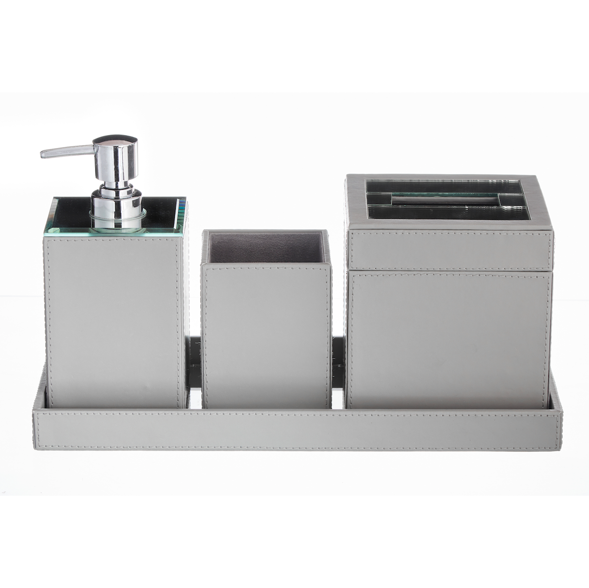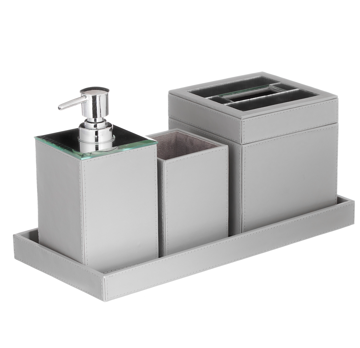 Be a trendsetter with this elegant & regal bathroom set from 'Sammsara'. Handcrafted intricately, with the highest grade PU leather & glass, this set includes a soap dispenser, toothbrush stand, tissue holder & a tray. Stylise your bathroom with this practical & design oriented accent.