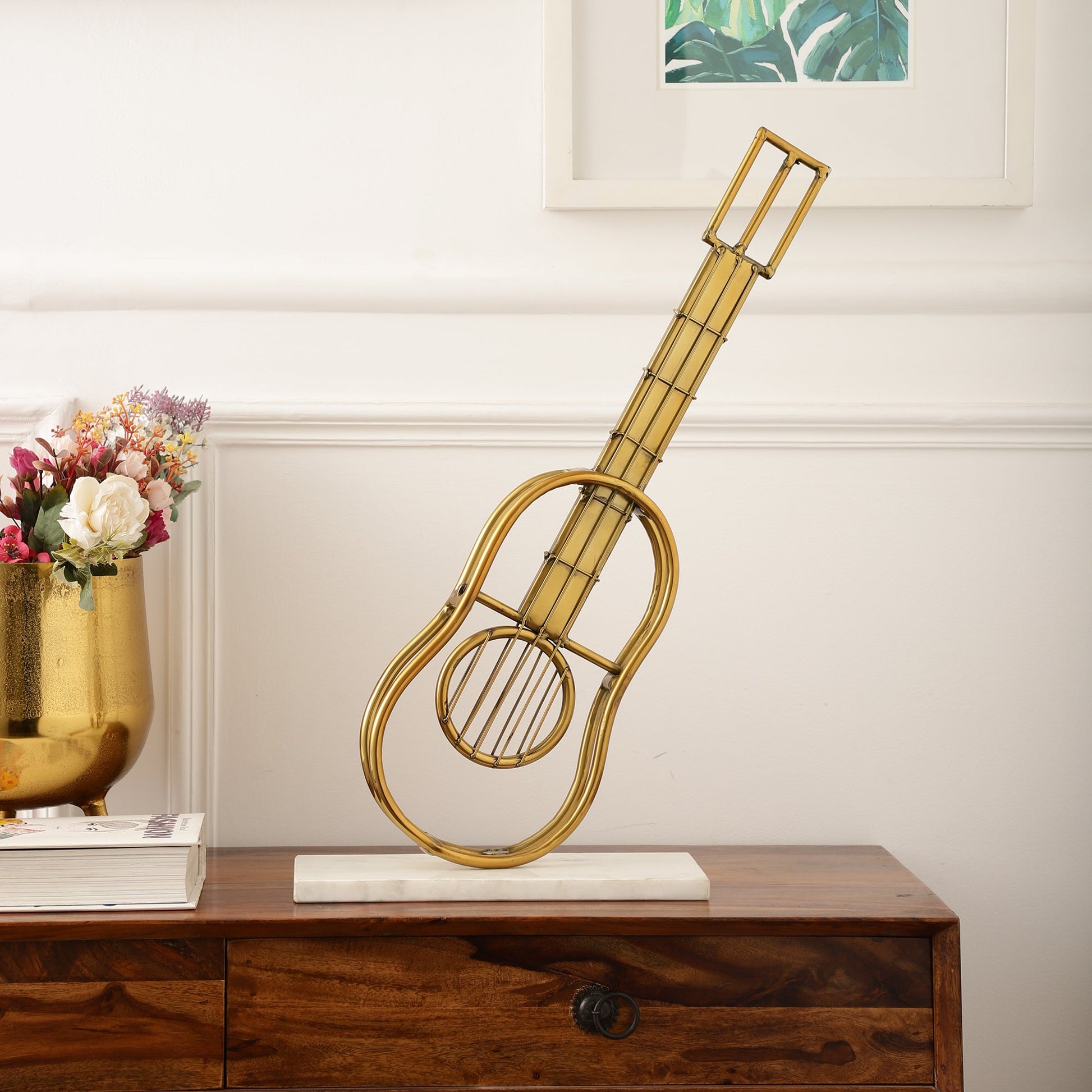 Be a trendsetter with our charming & quirky, oversized Guitar decorative gold accent. The guitar accent with the marble base is sure to add style & character to your home. Intricately handcrafted, this Gold accent is the perfect addition to your living space.