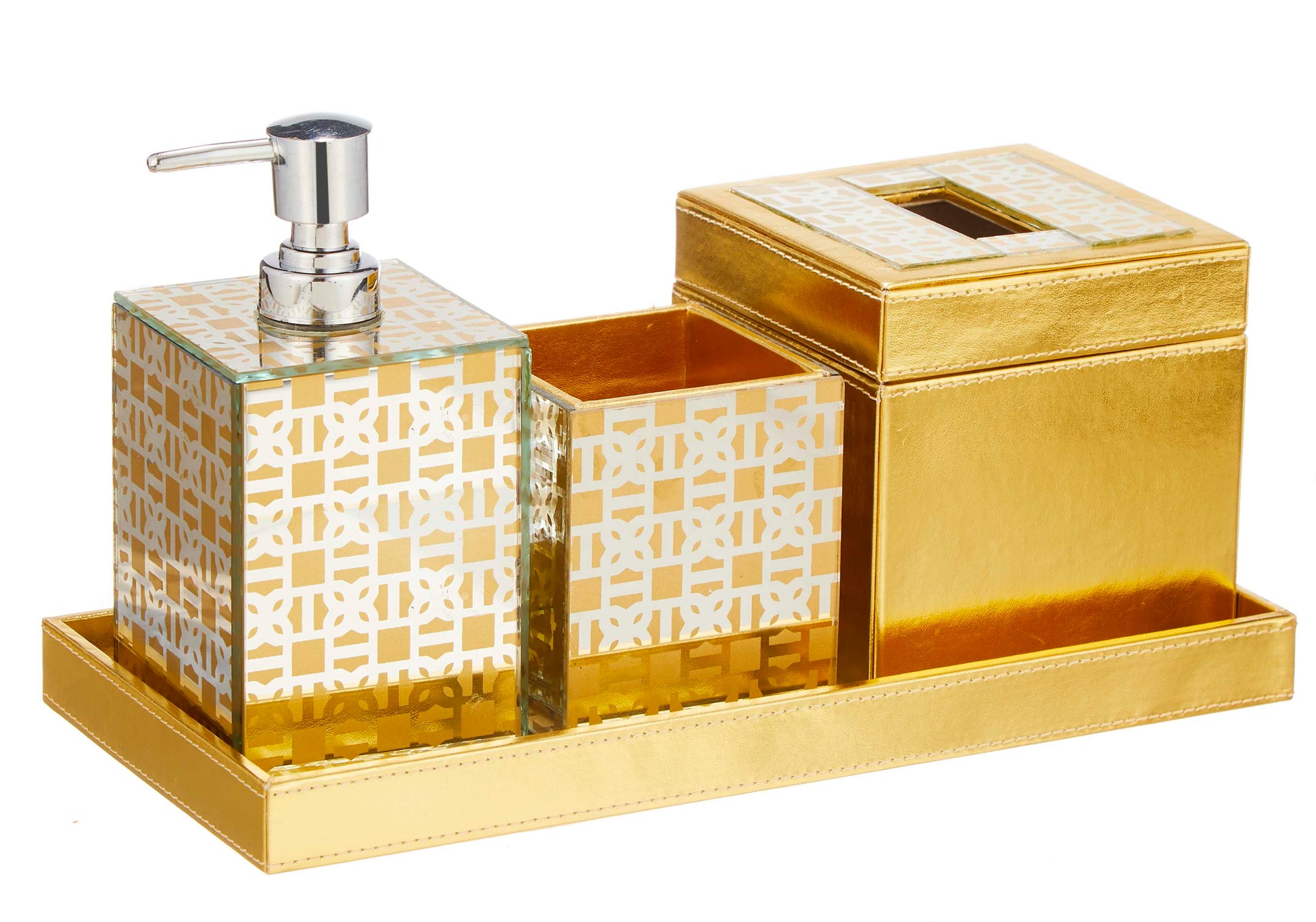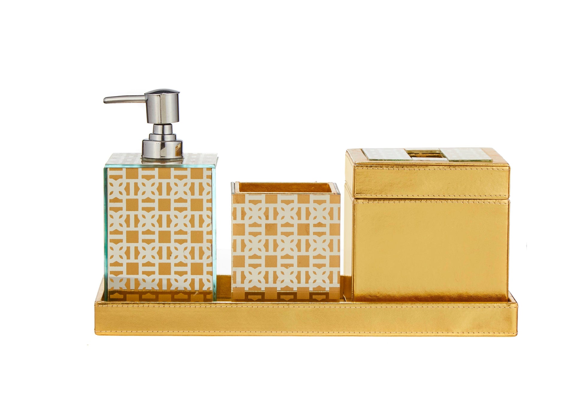 Be a trendsetter with this elegant & regal bathroom set from 'Sammsara'. Handcrafted intricately, with the highest grade PU leather & printed glass, this set includes a soap dispenser, toothbrush stand, tissue holder & a tray. Stylise your bathroom with this practical & design oriented accent.