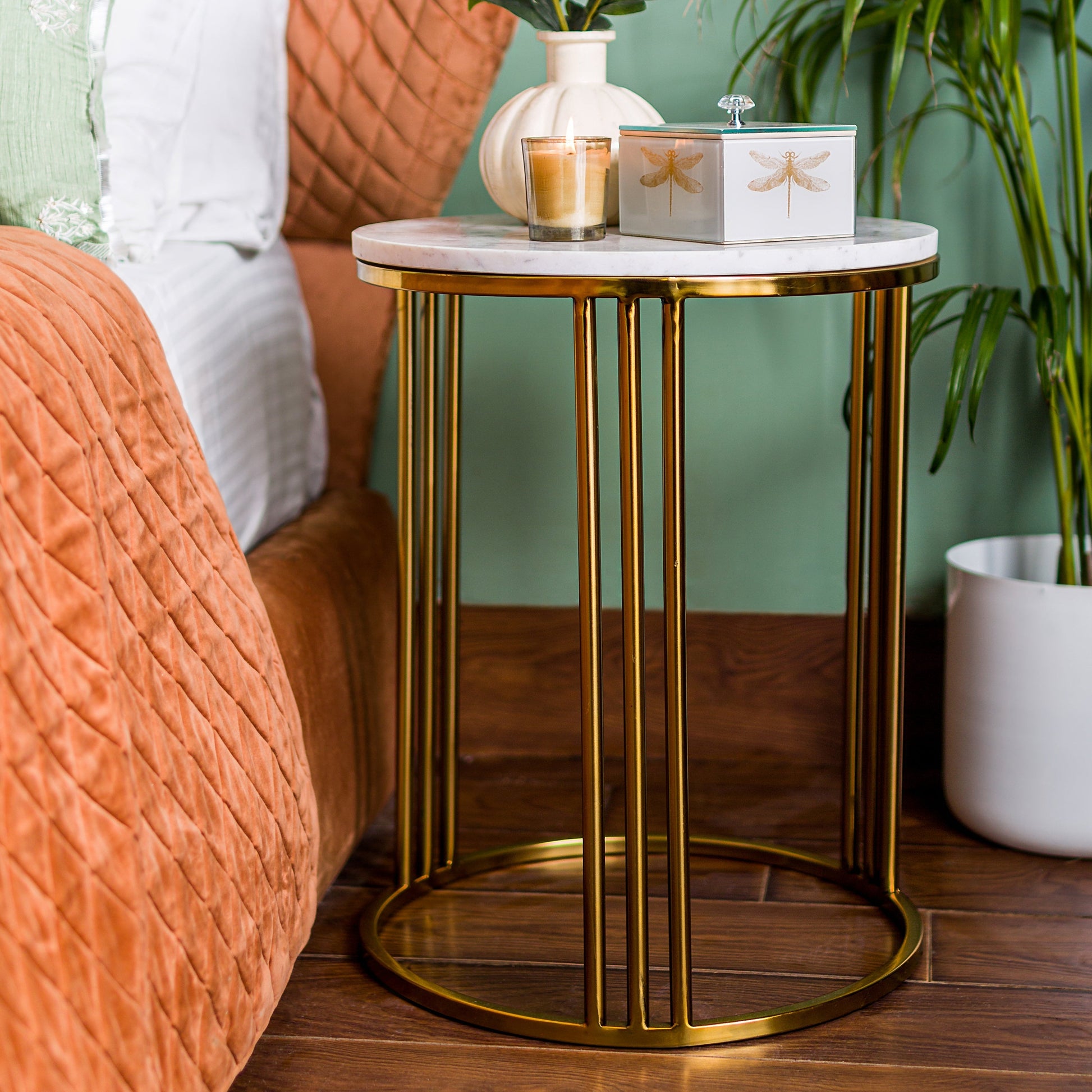 Add charm & style to your living space with the 'Oslo' Gold Table. The dual tone white & gold finish of this table will enhance the look & feel of any room. Perfect for any living space, this side table can be used to hold decorative accents or as a night stand.