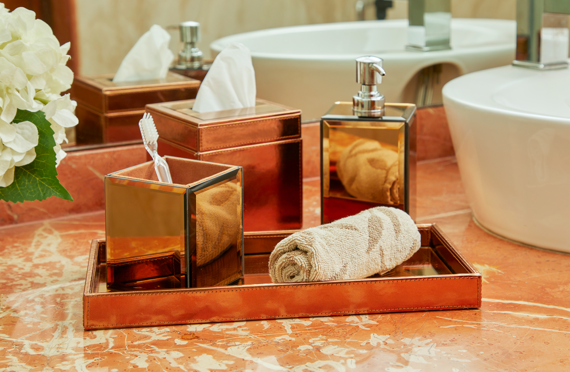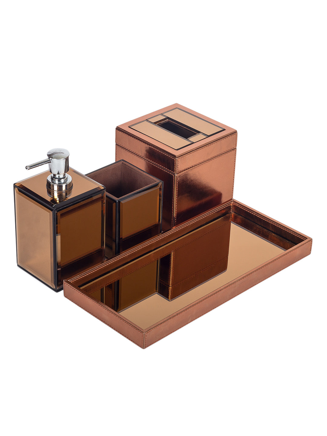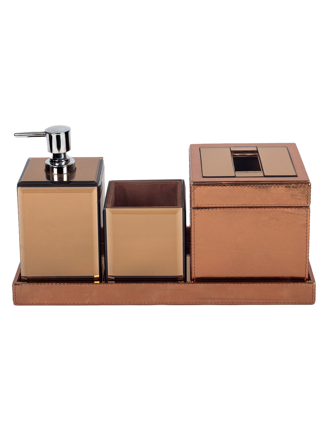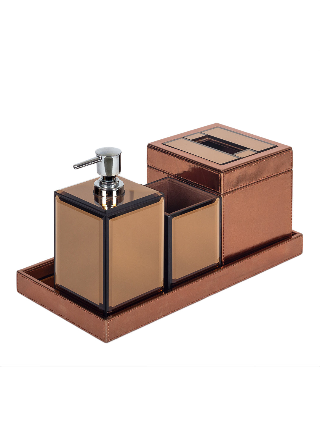 Be a trendsetter with this elegant & regal bathroom set from 'Sammsara'. Handcrafted intricately, with the highest grade PU leather & glass, this set includes a soap dispenser, toothbrush stand, tissue holder & a tray. Stylise your bathroom with this practical & design oriented accent.