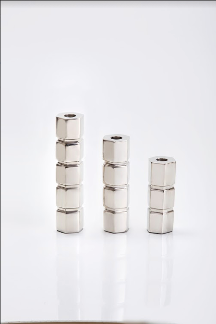 The artistic lines of this nickel-plated geometric candle stand, inspired by new age architecture, along with the aluminum candle stand adds class & usability to any living space. Works with a taper candle.