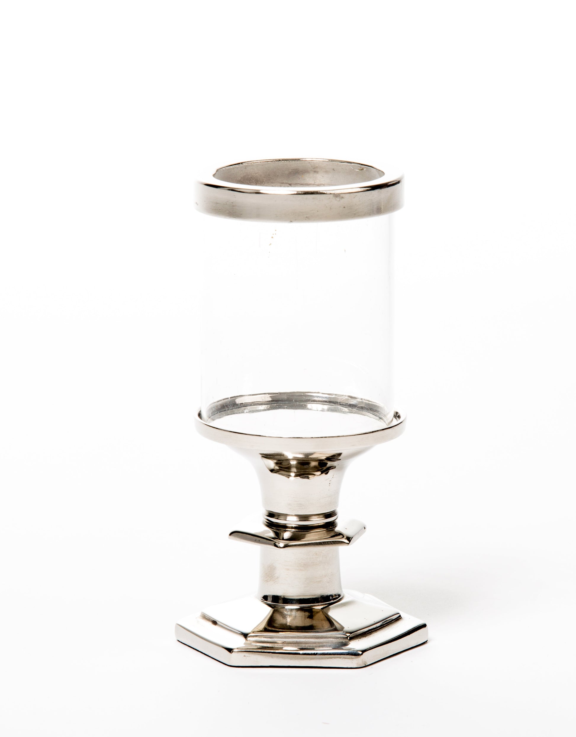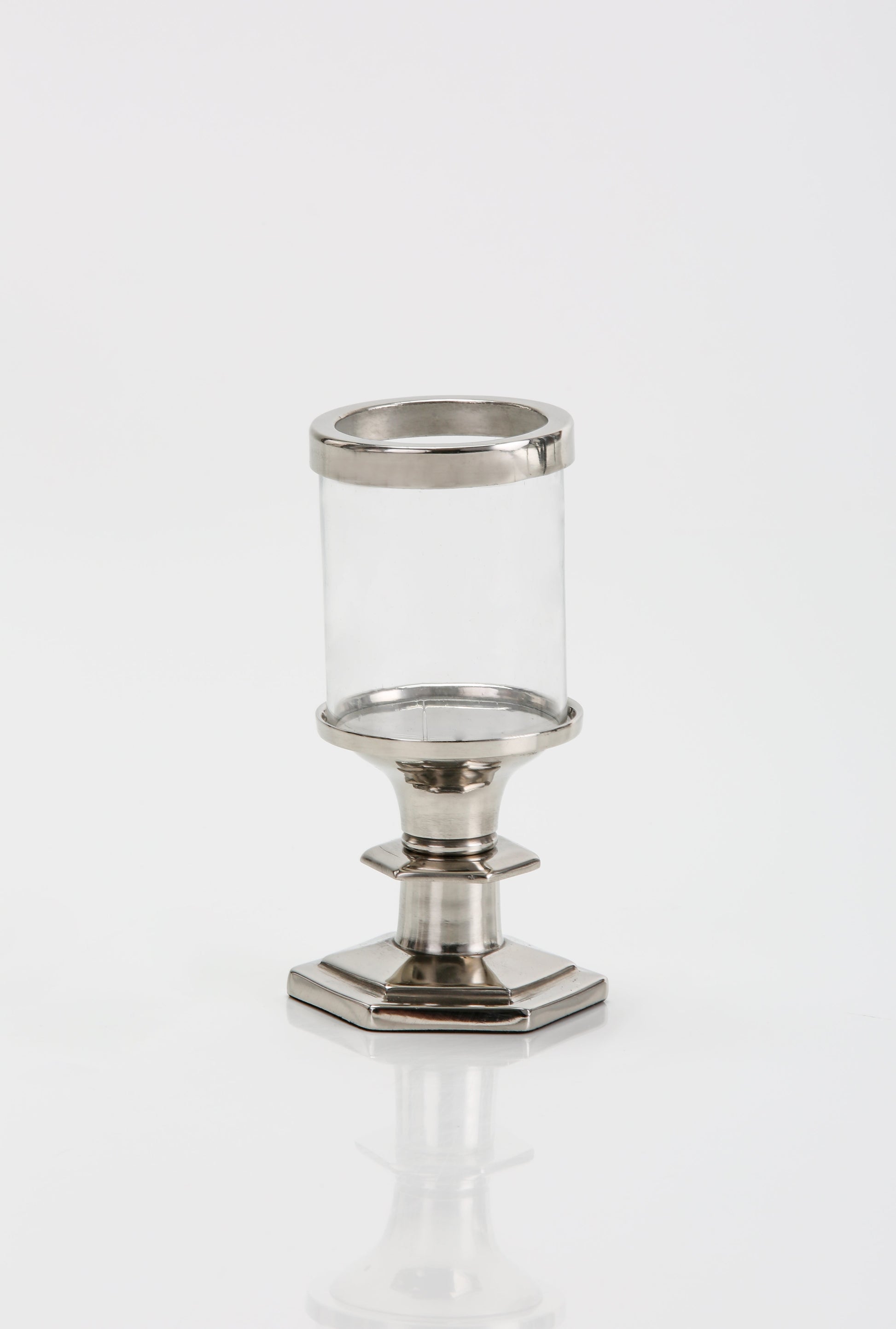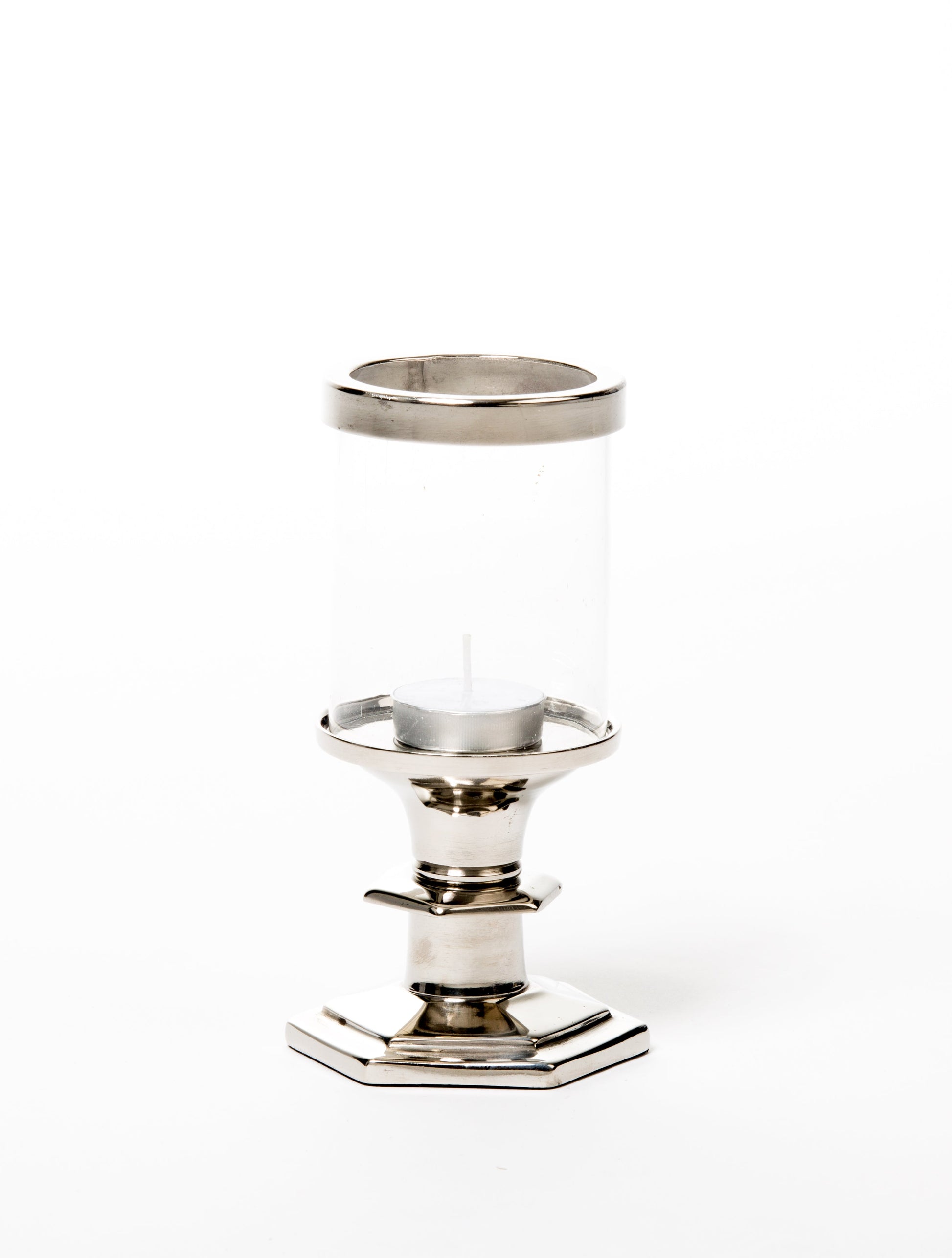 The geometric lines of this nickel-hurricane make it a chic addition for your living space. Compact, smart and classic, this piece will add class and help you magnify any space in your house or office. Works well with tea lights.