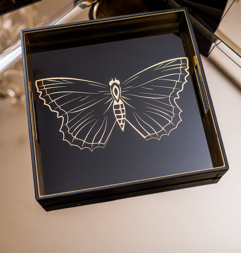 The artistic & eye-catching design of this stunning piece make it a truly ornate addition for any living space. It's delicate handcrafted Gold Butterfly pattern on glass really make it stand out. Works well as a serving tray or as an accent piece.